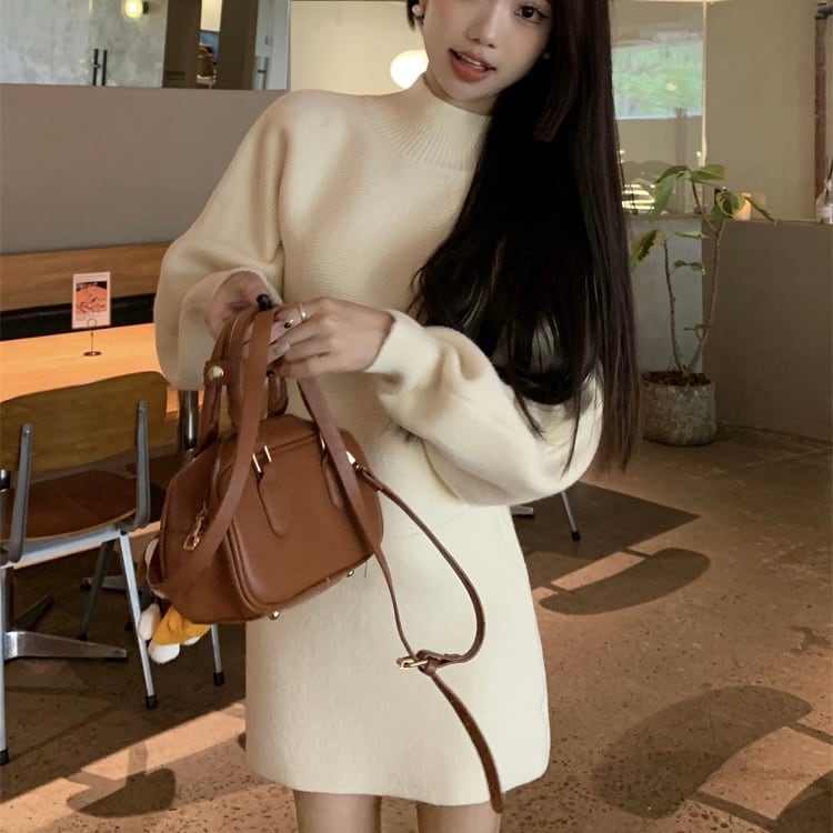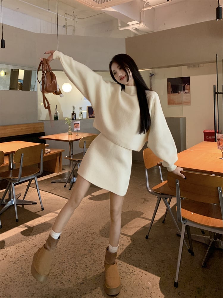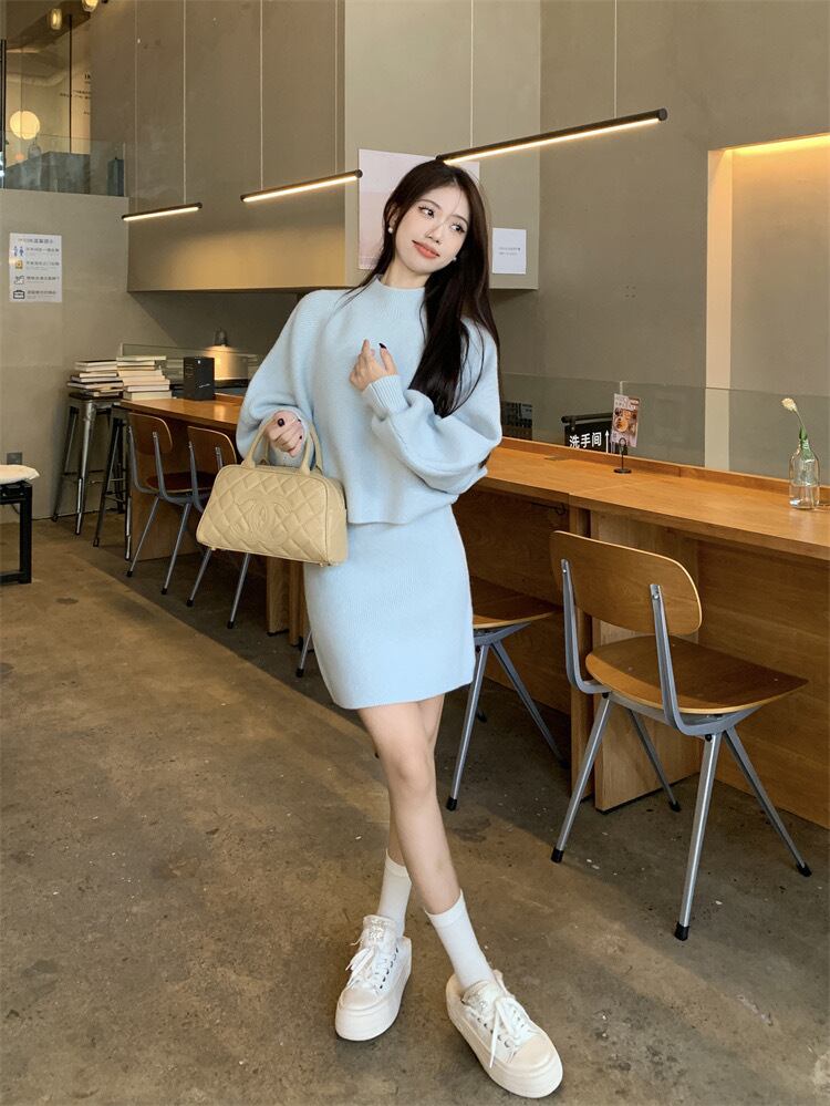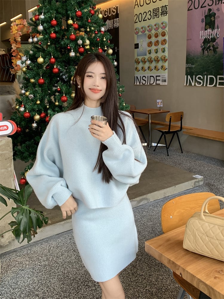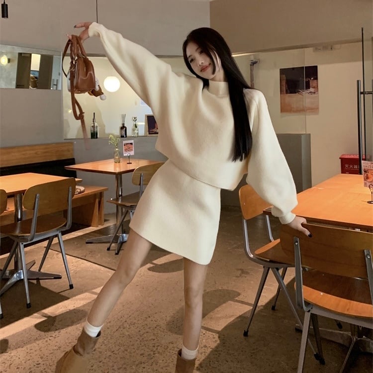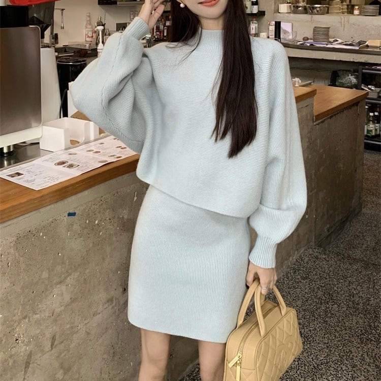 【set】ハーフネックニットトップスxハイウエストスカート2色 KY1703