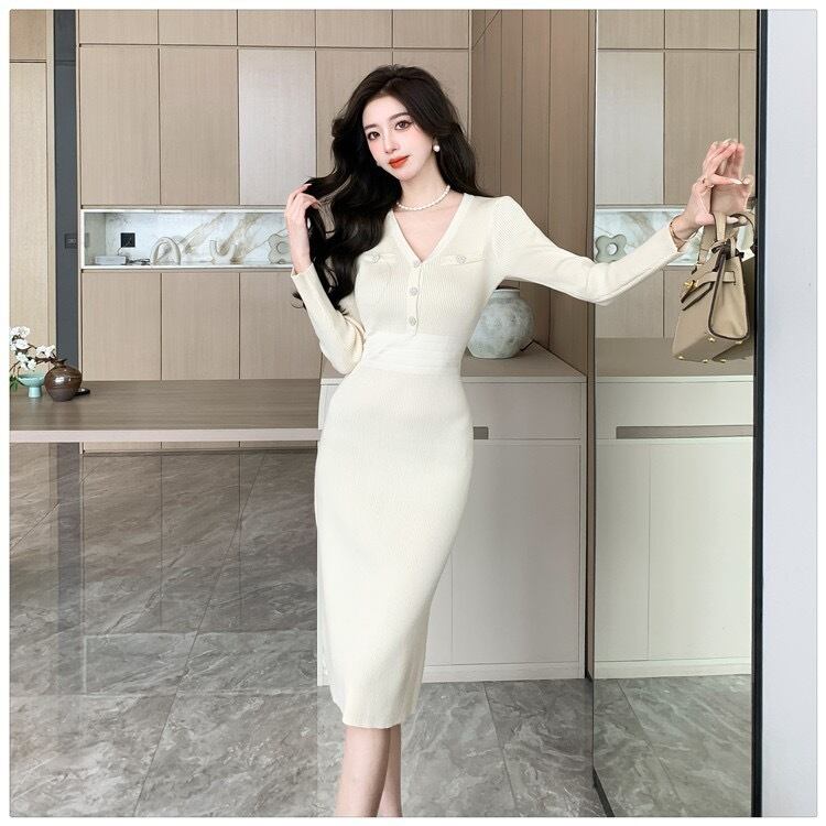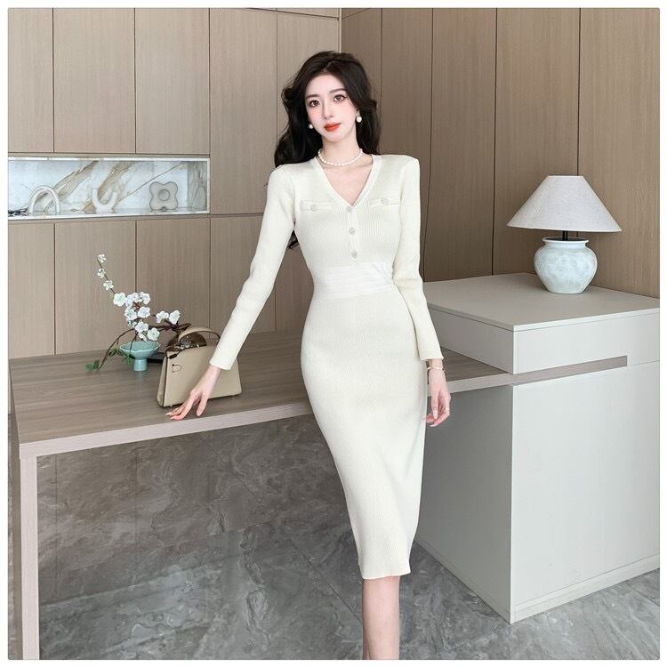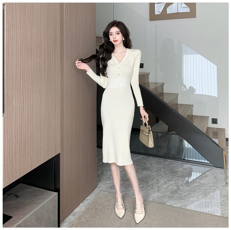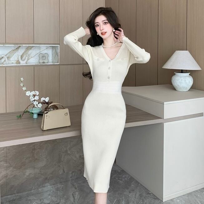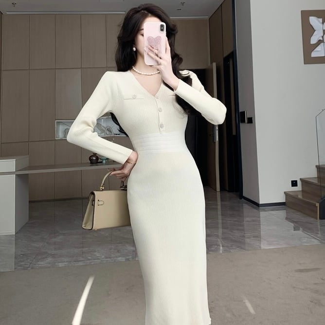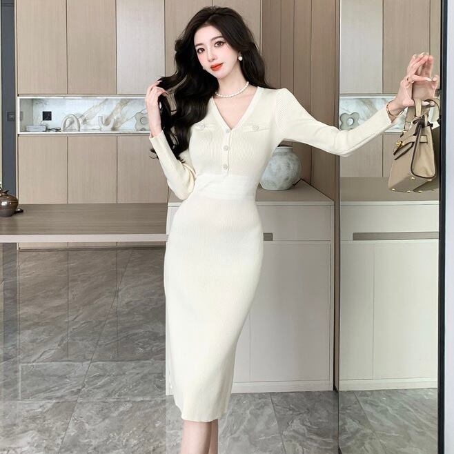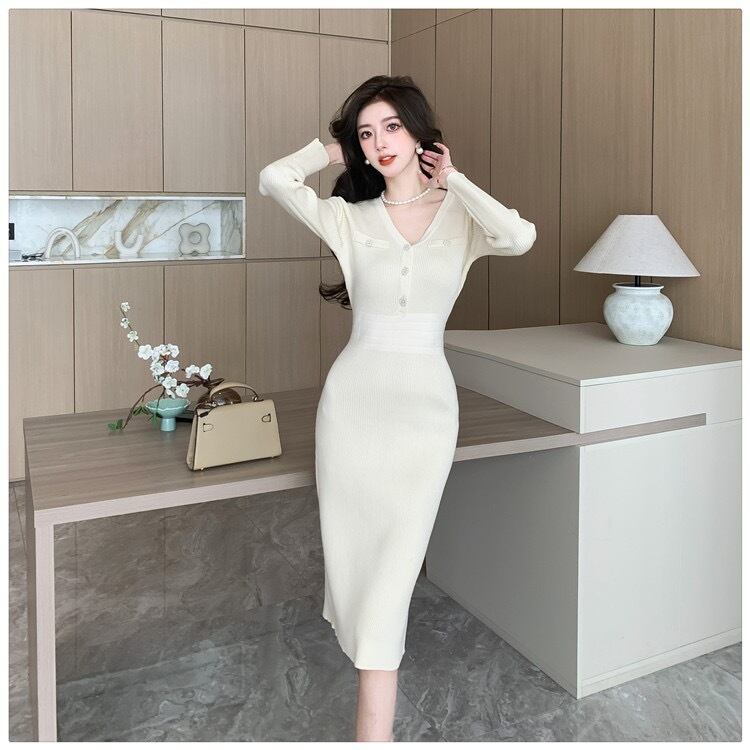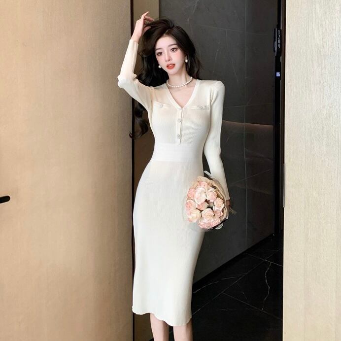 【dress】エレガントVネック長袖ニットワンピース ZG2220