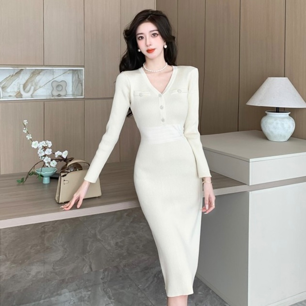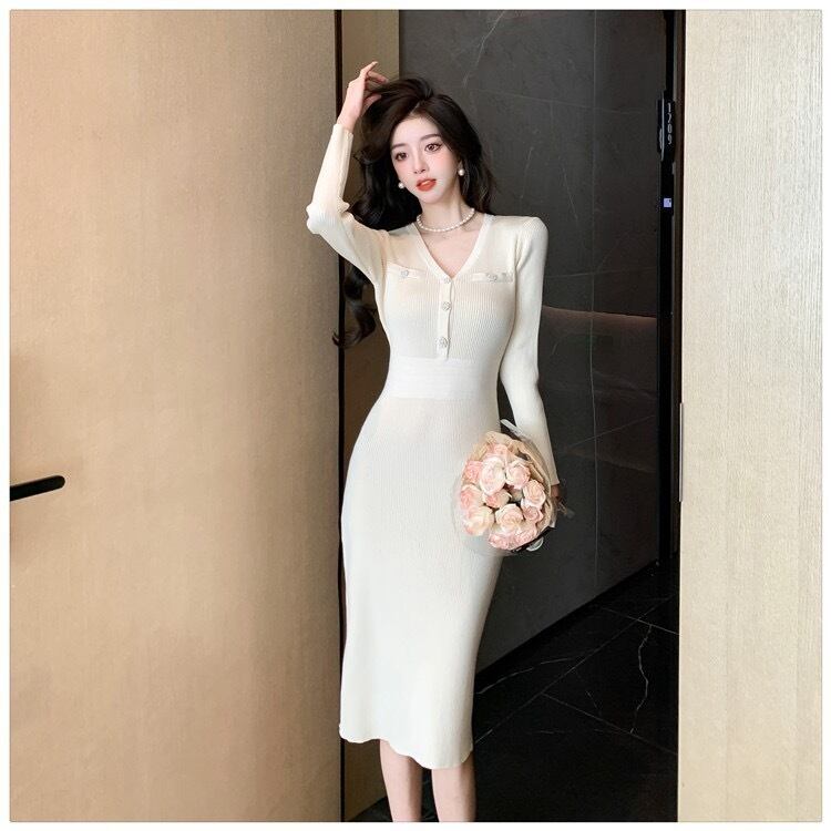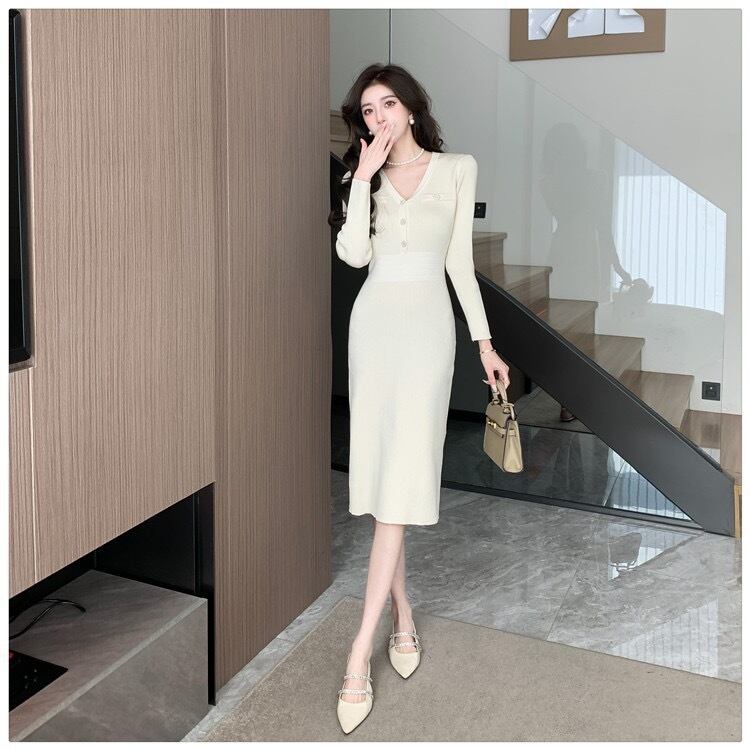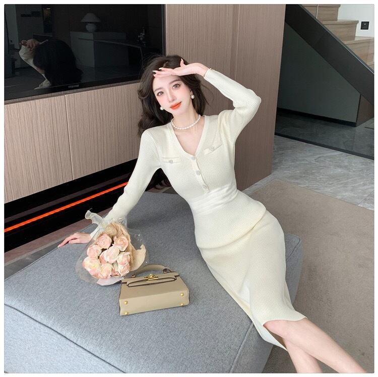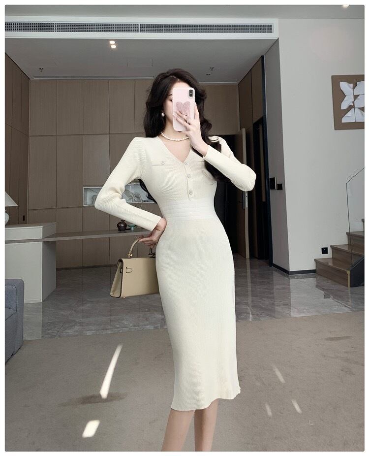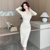 【dress】エレガントVネック長袖ニットワンピース ZG2220
