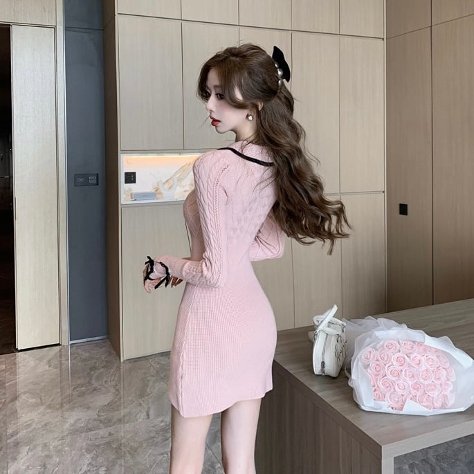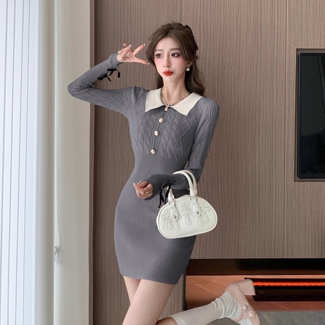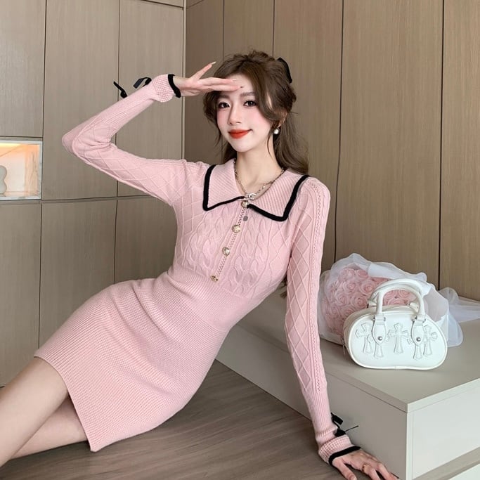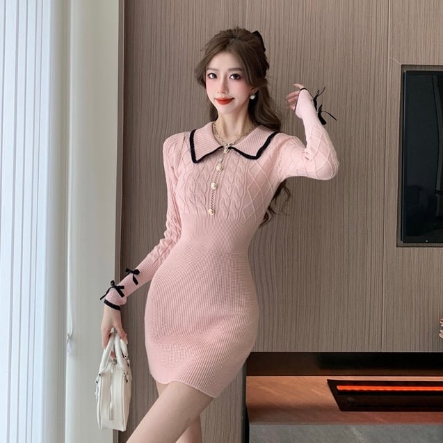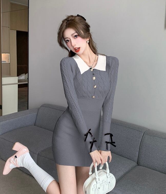 【dress】ビッグ襟付き配色ニットミニワンピース3色 KG0007