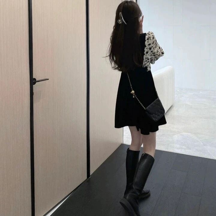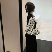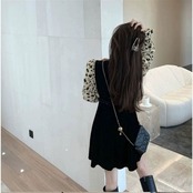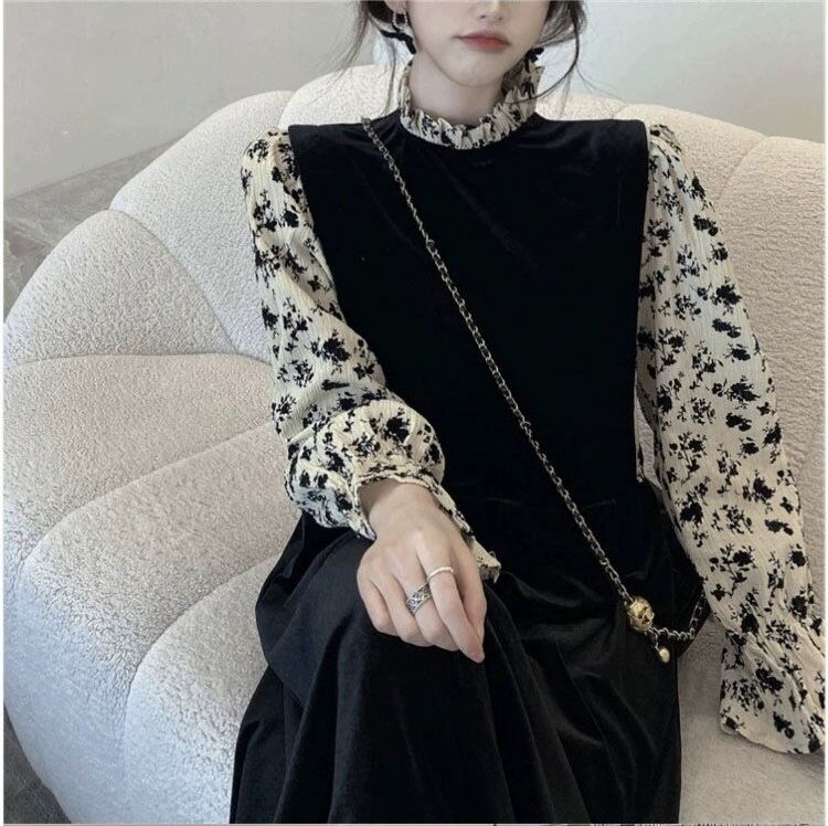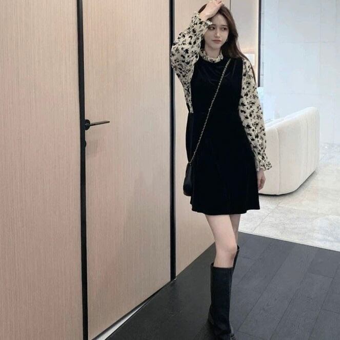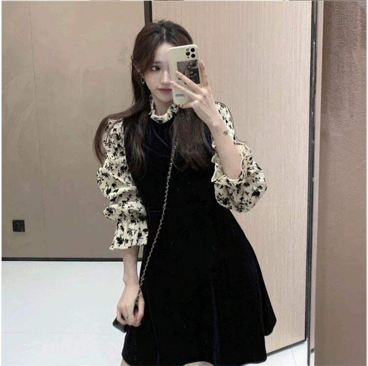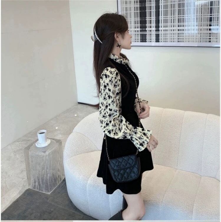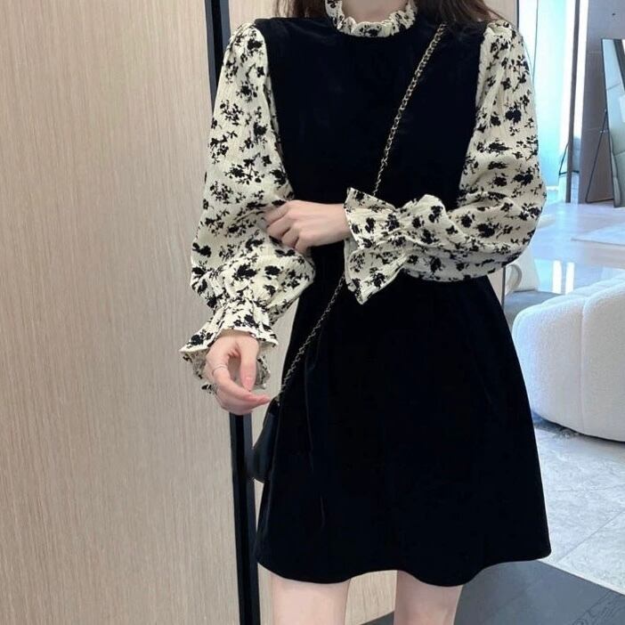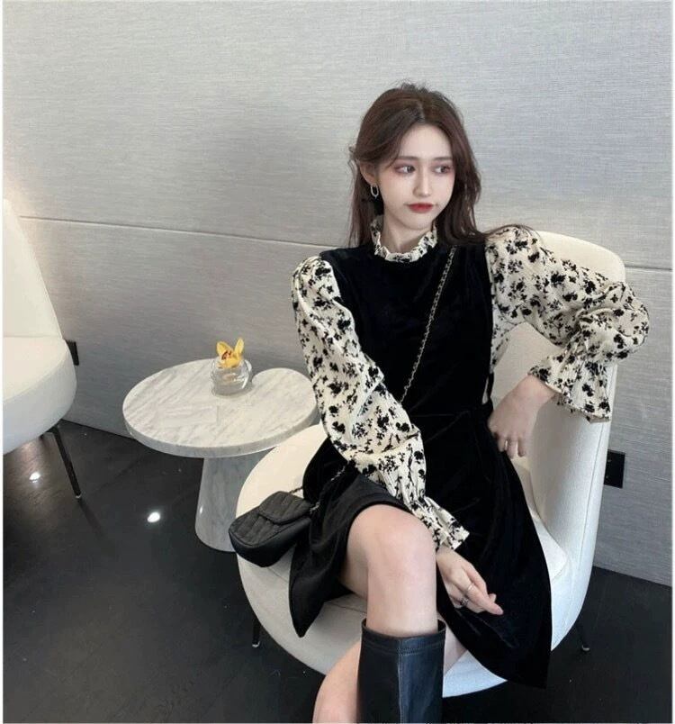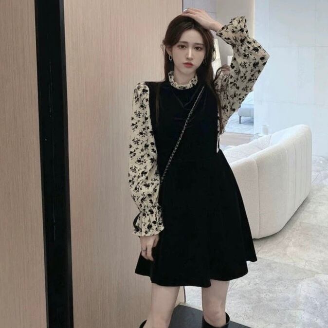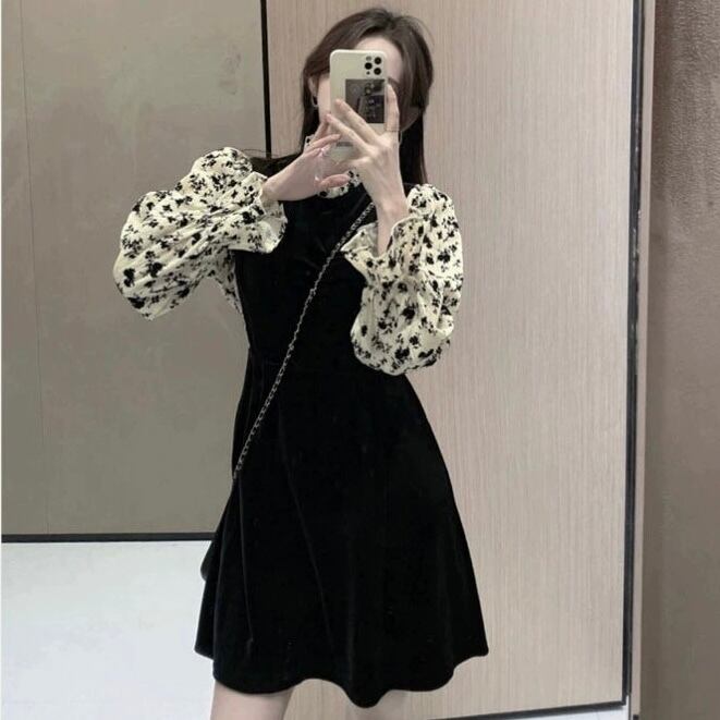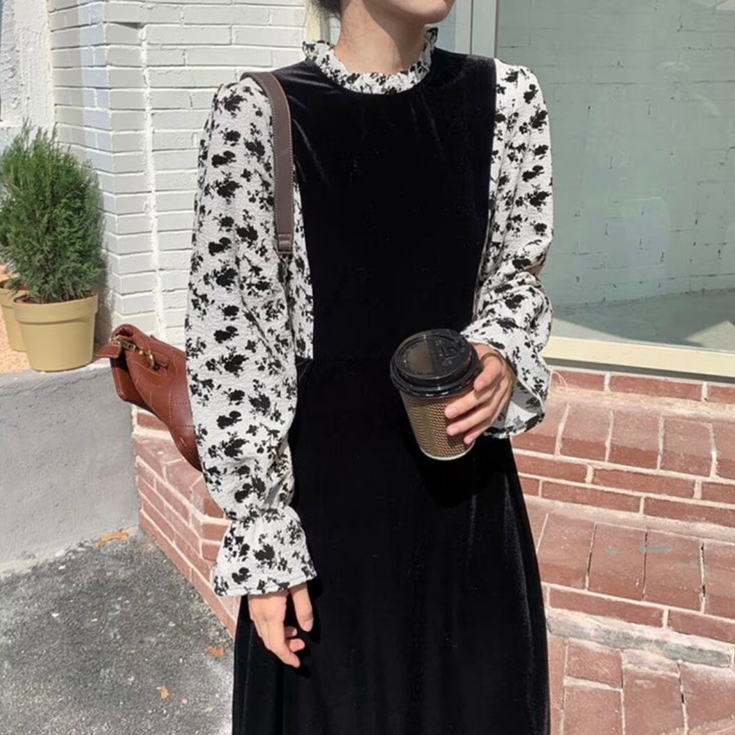 【dress】小花柄の切り替えベロアワンピース GG0013