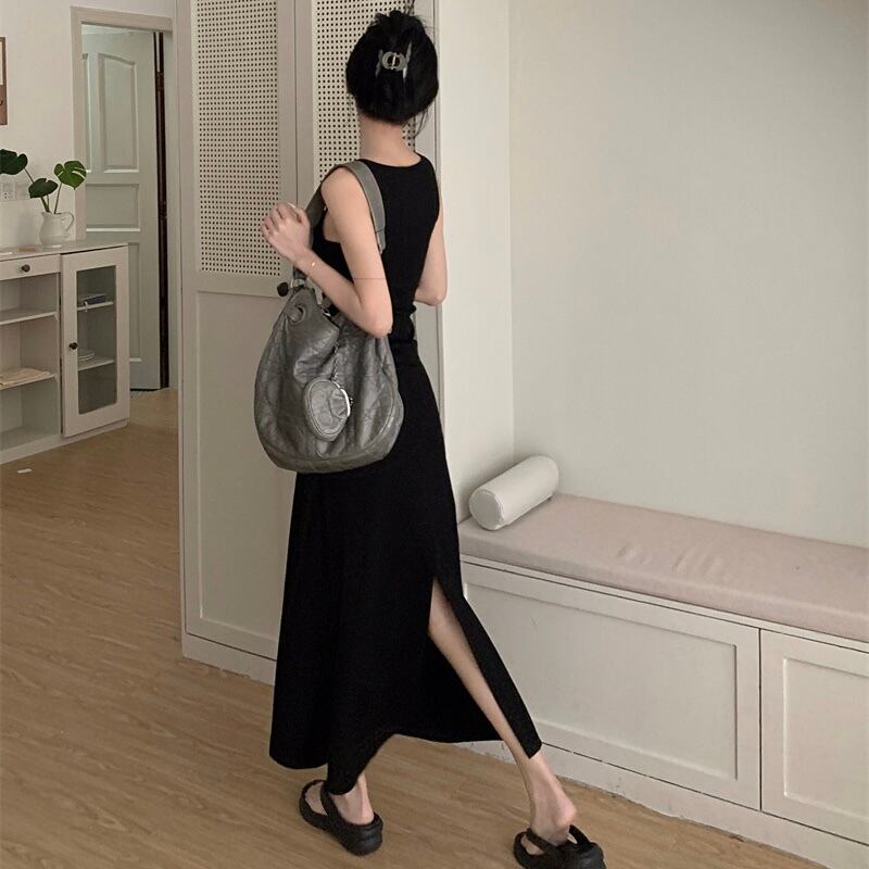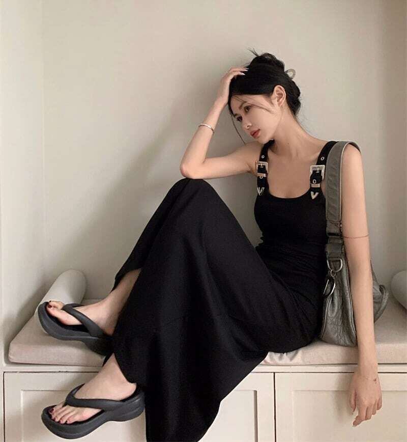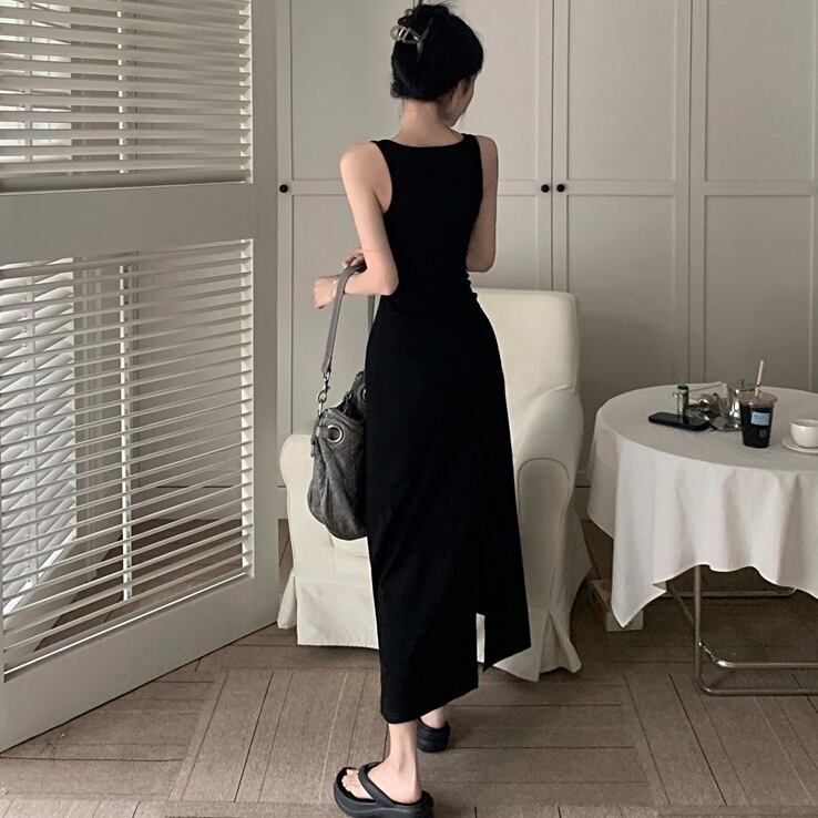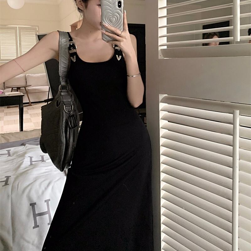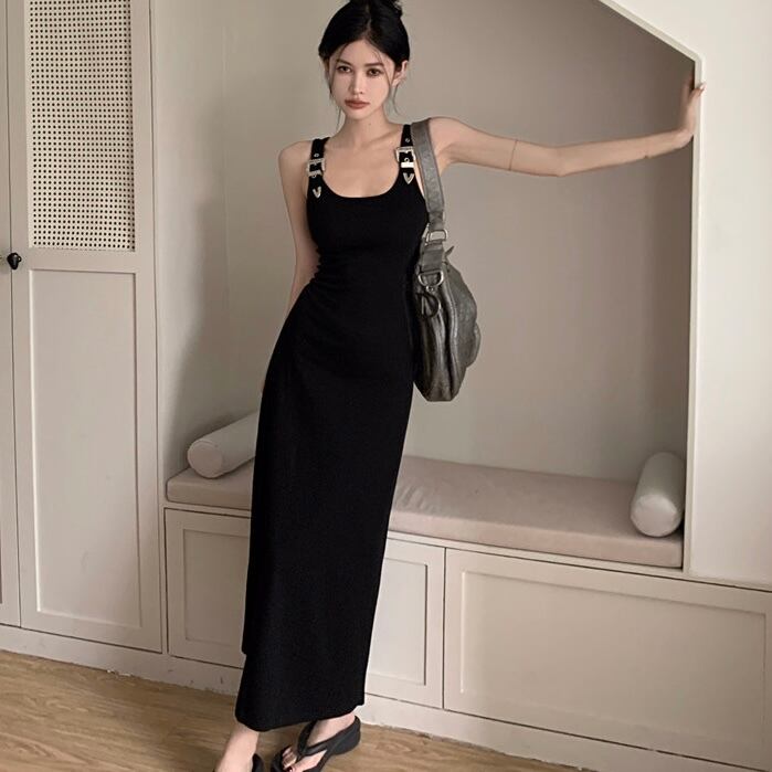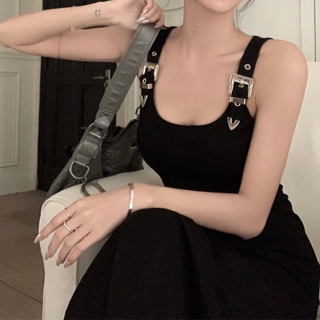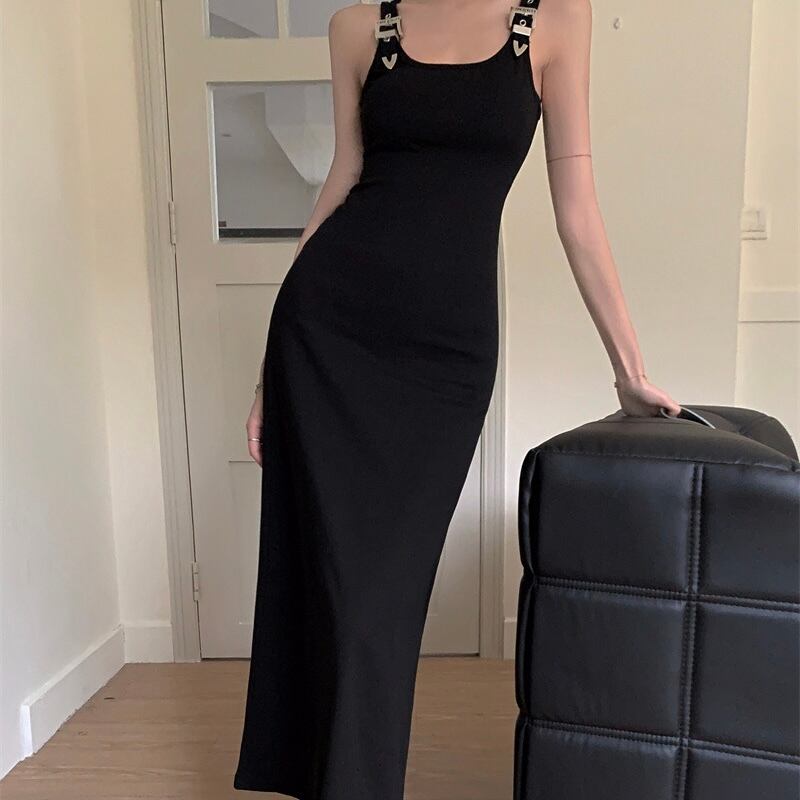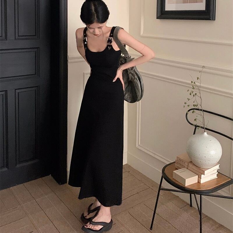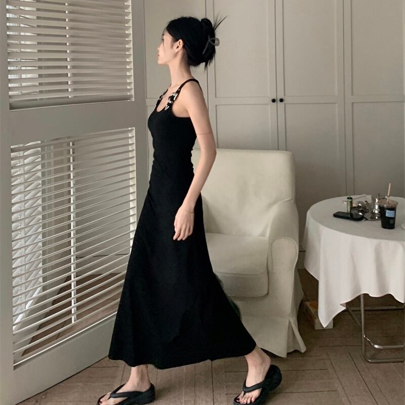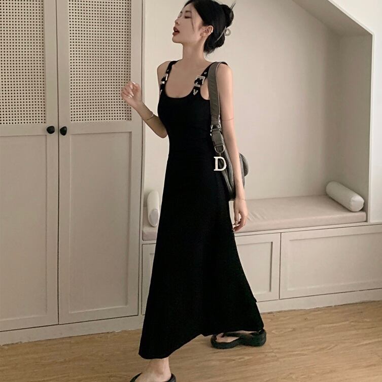 【dress】ベルトショルダーブラックロングワンピース PU0008