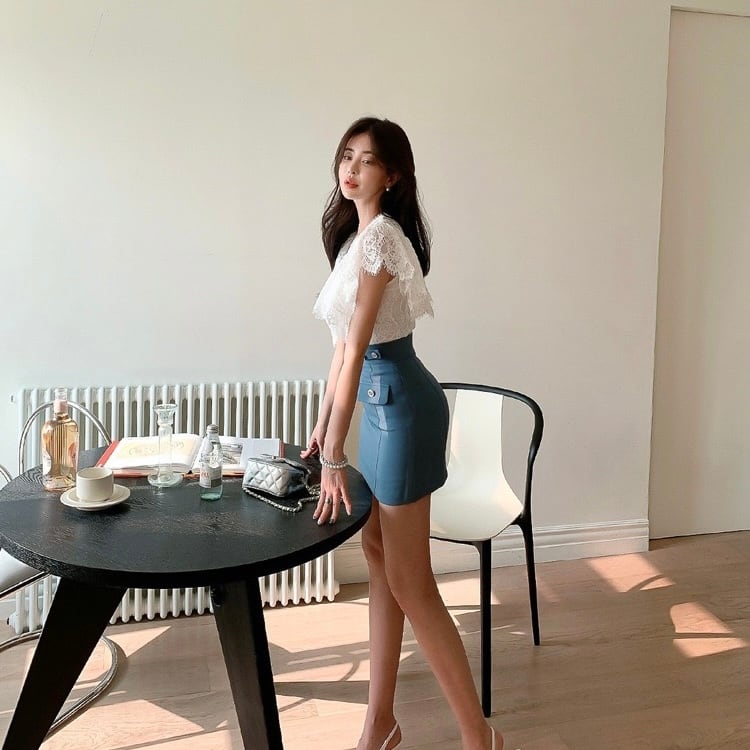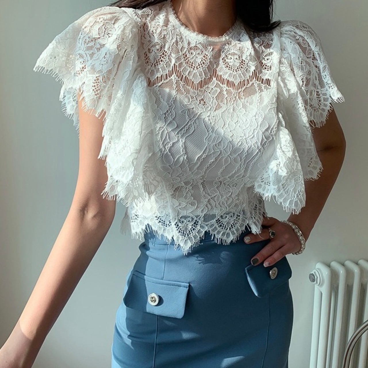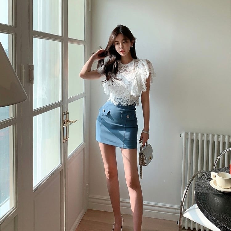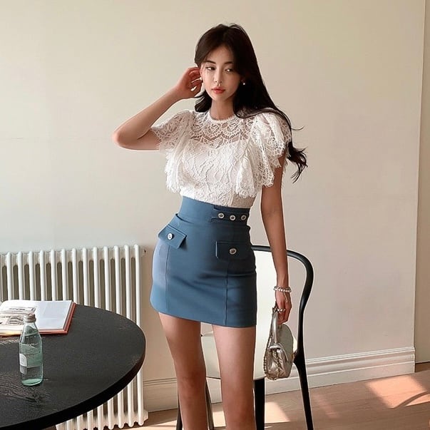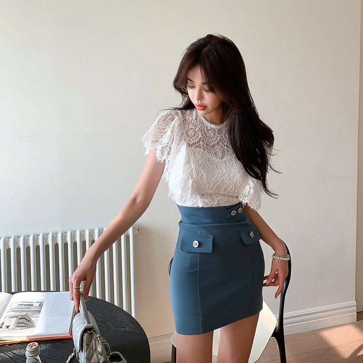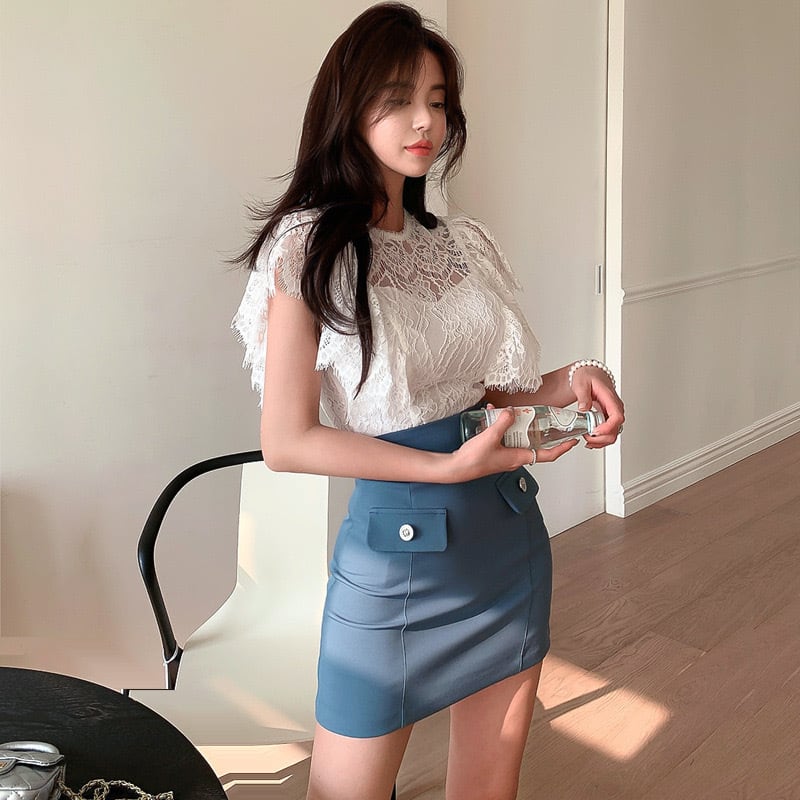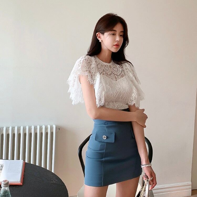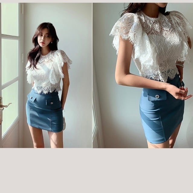 【set】レースフリルトップスxスカート JY4104