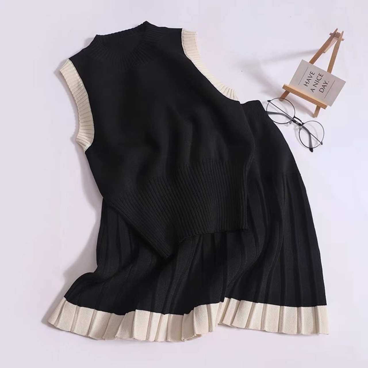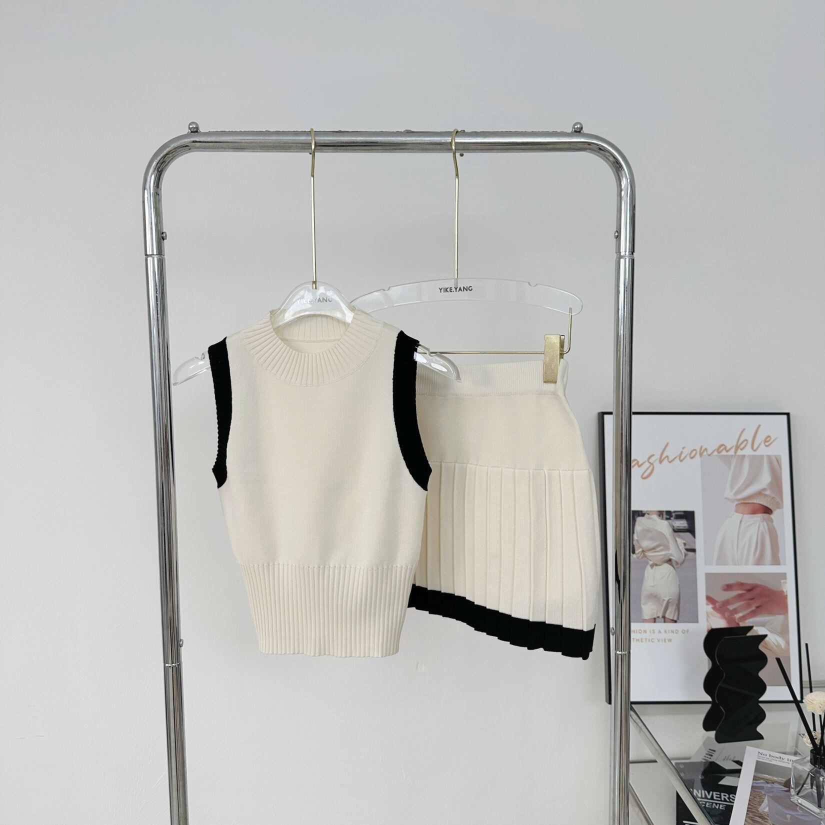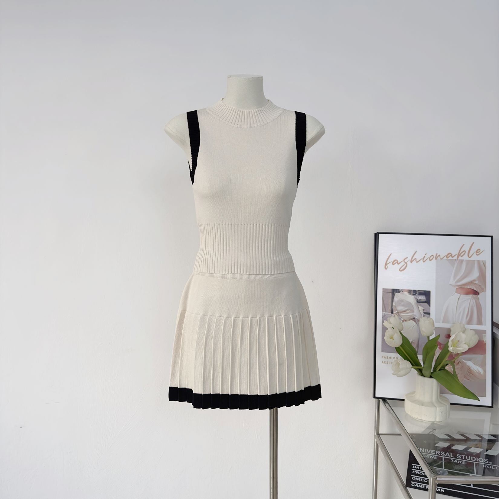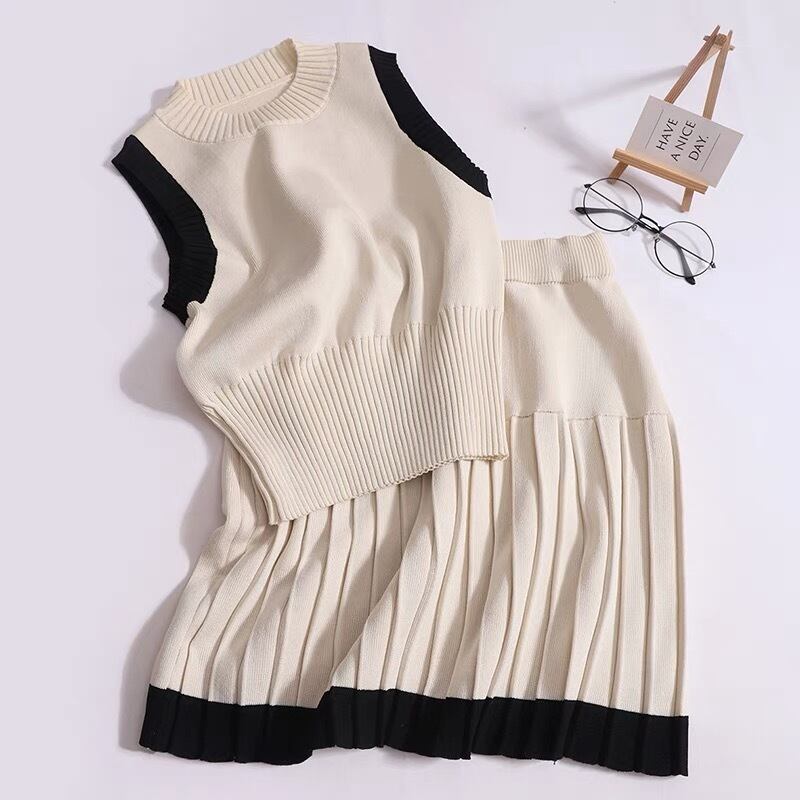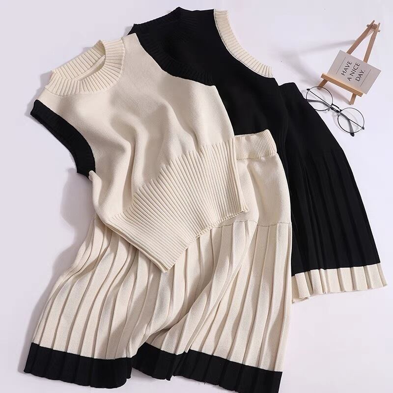 【set】配色ノースリーブトップスxプリーツスカート2色 JY4703