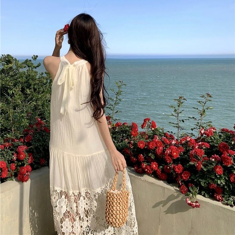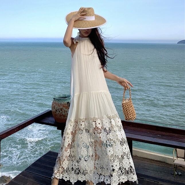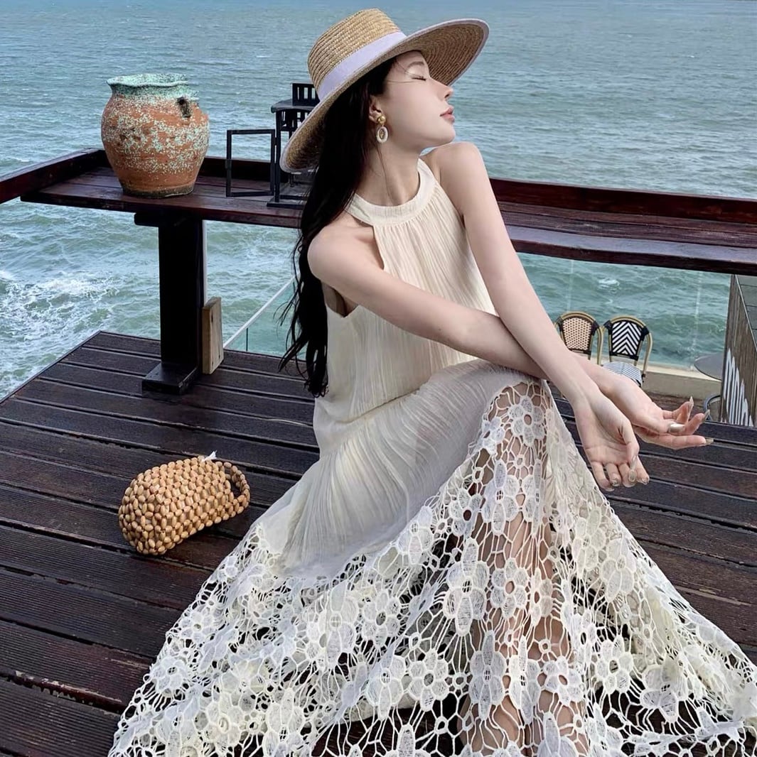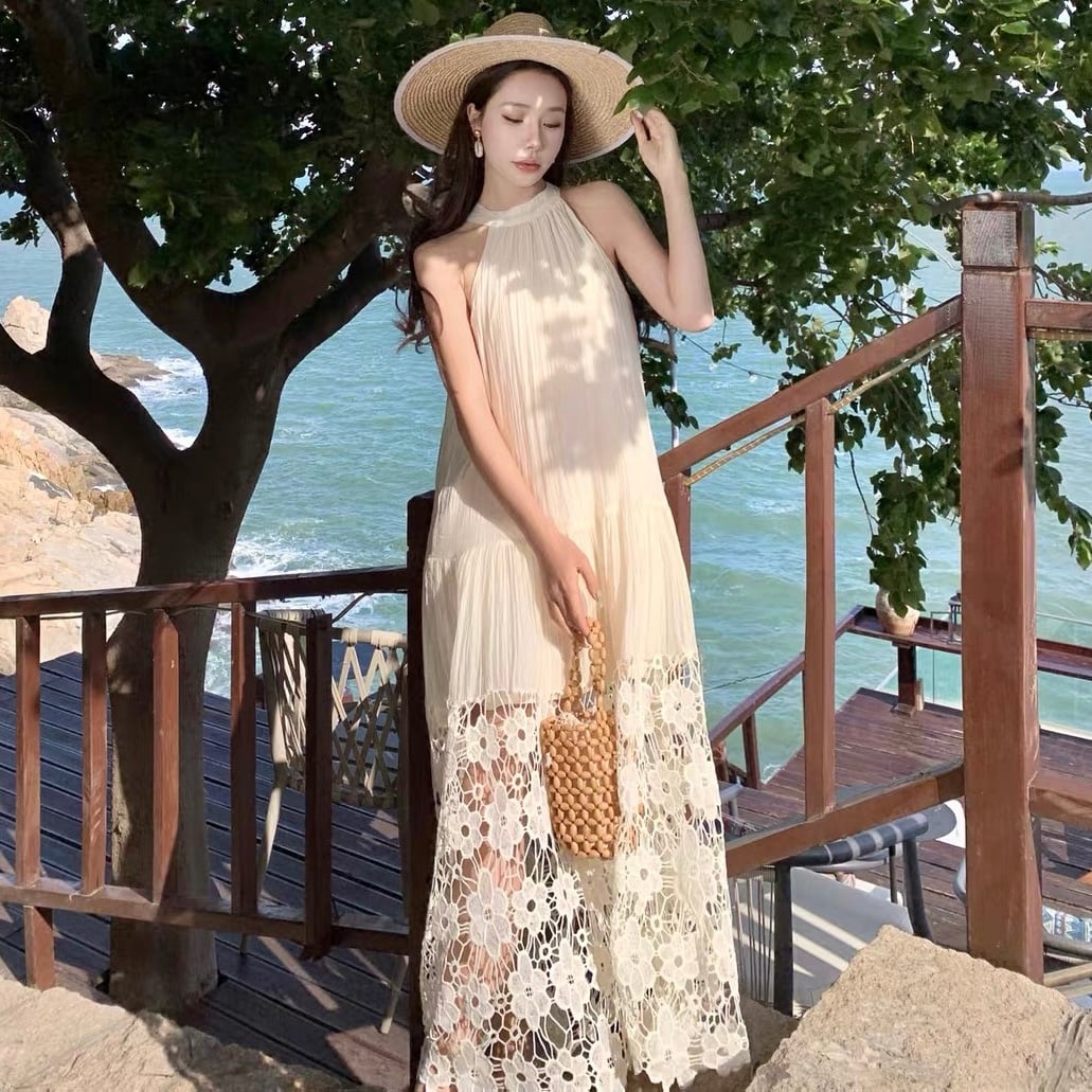 【dress】ホルターネックレース切り替えワンピース JY4902