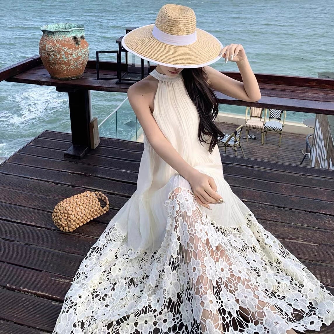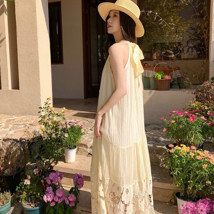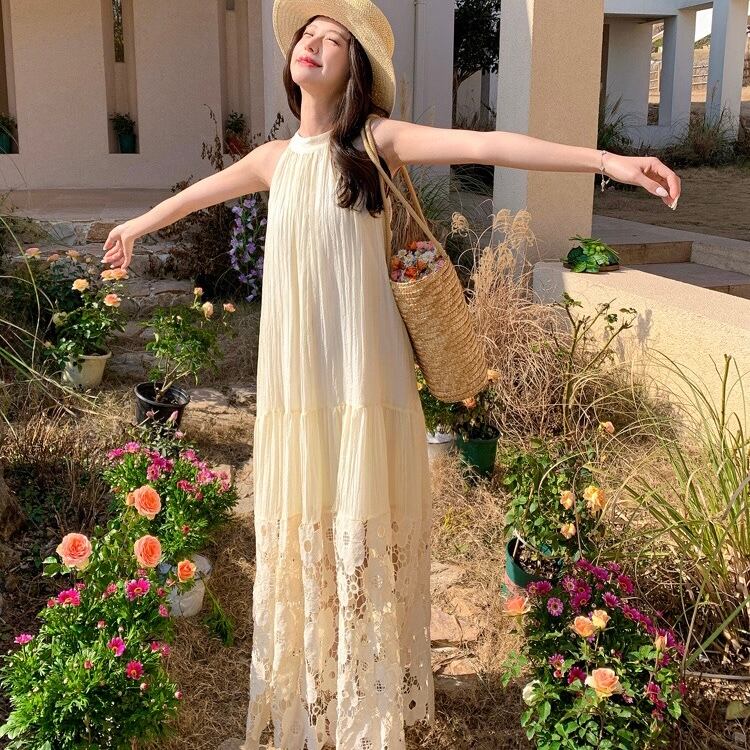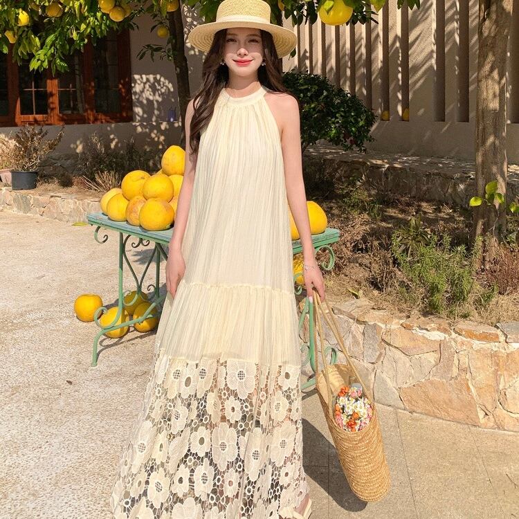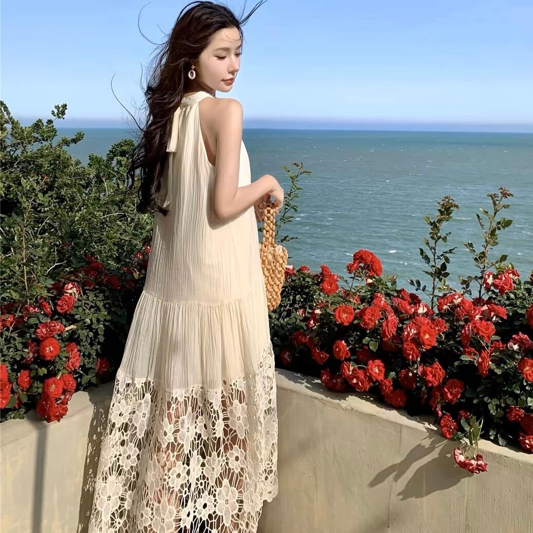 【dress】ホルターネックレース切り替えワンピース JY4902