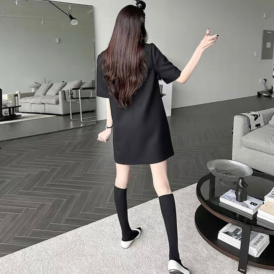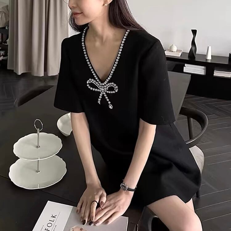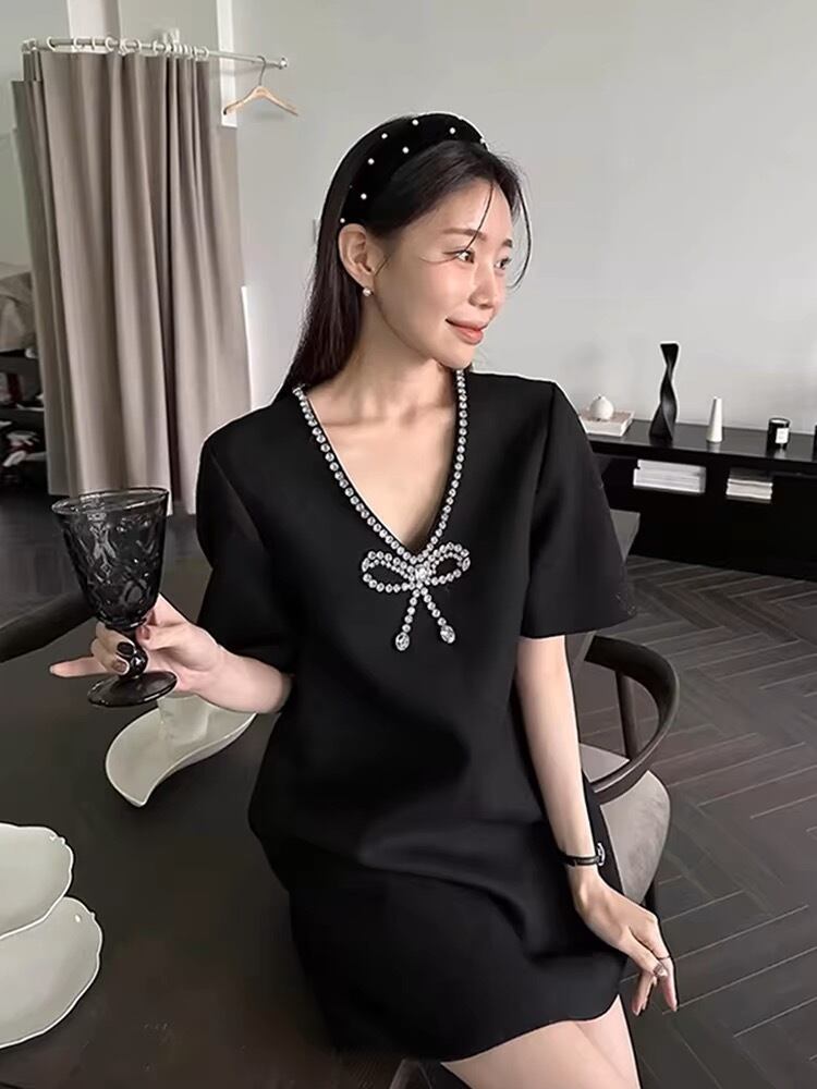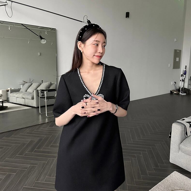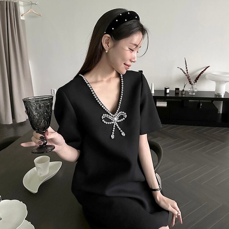 【dress】Vネックビジューリボンミニワンピース SY4281