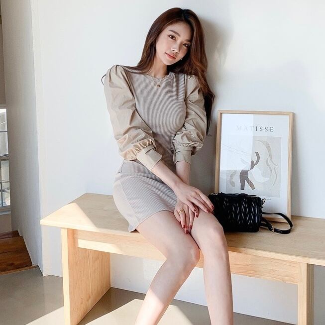 【dress】パフスリーブニット切り替えワンピース JY5114