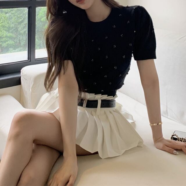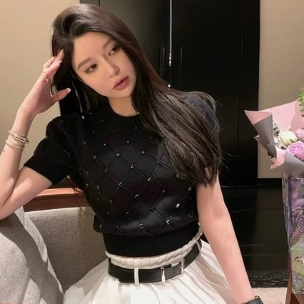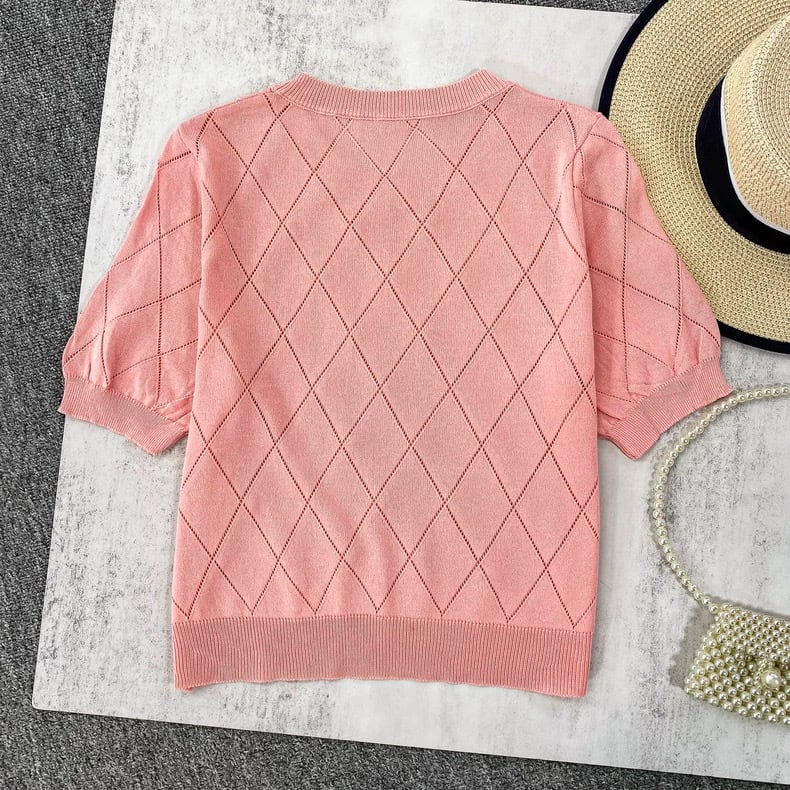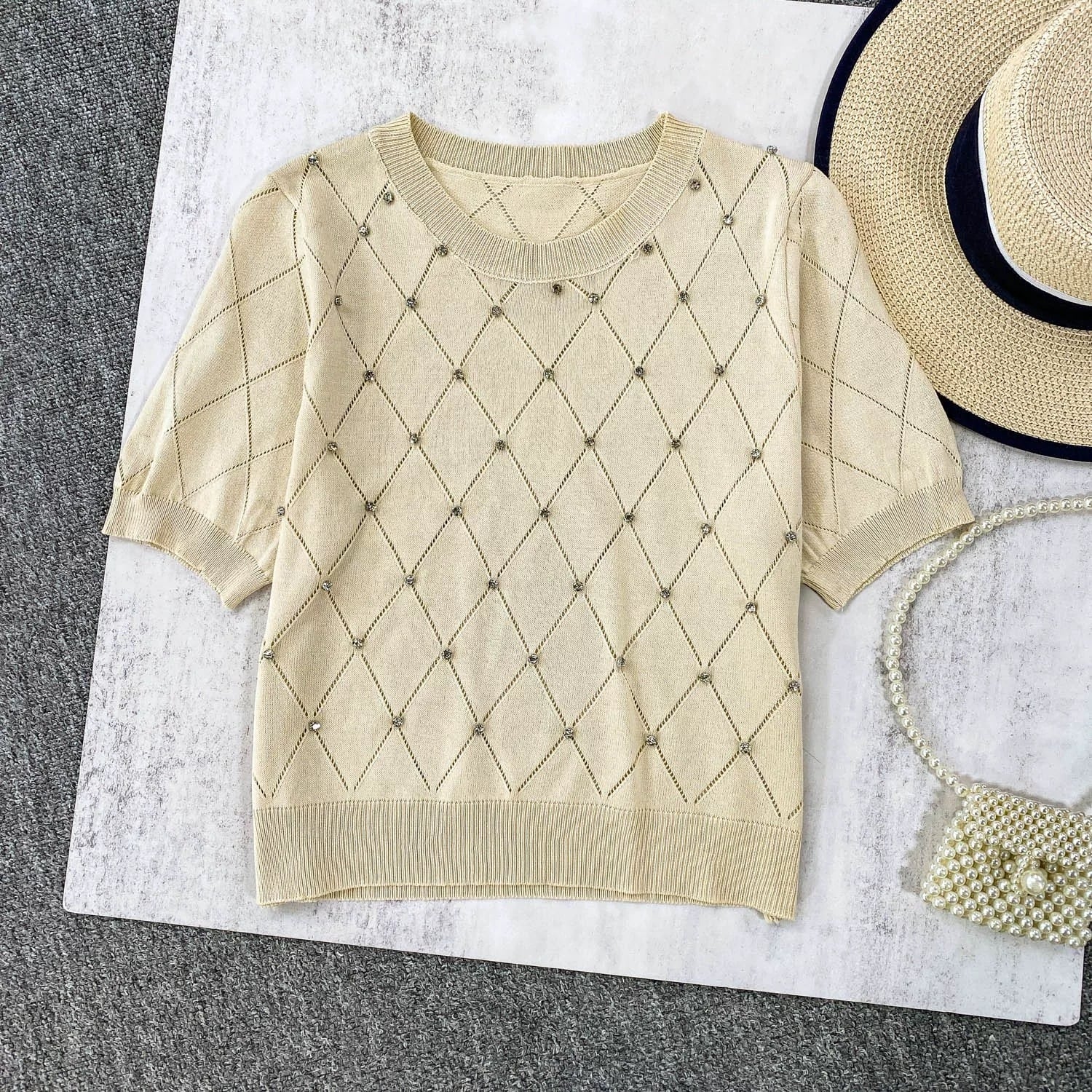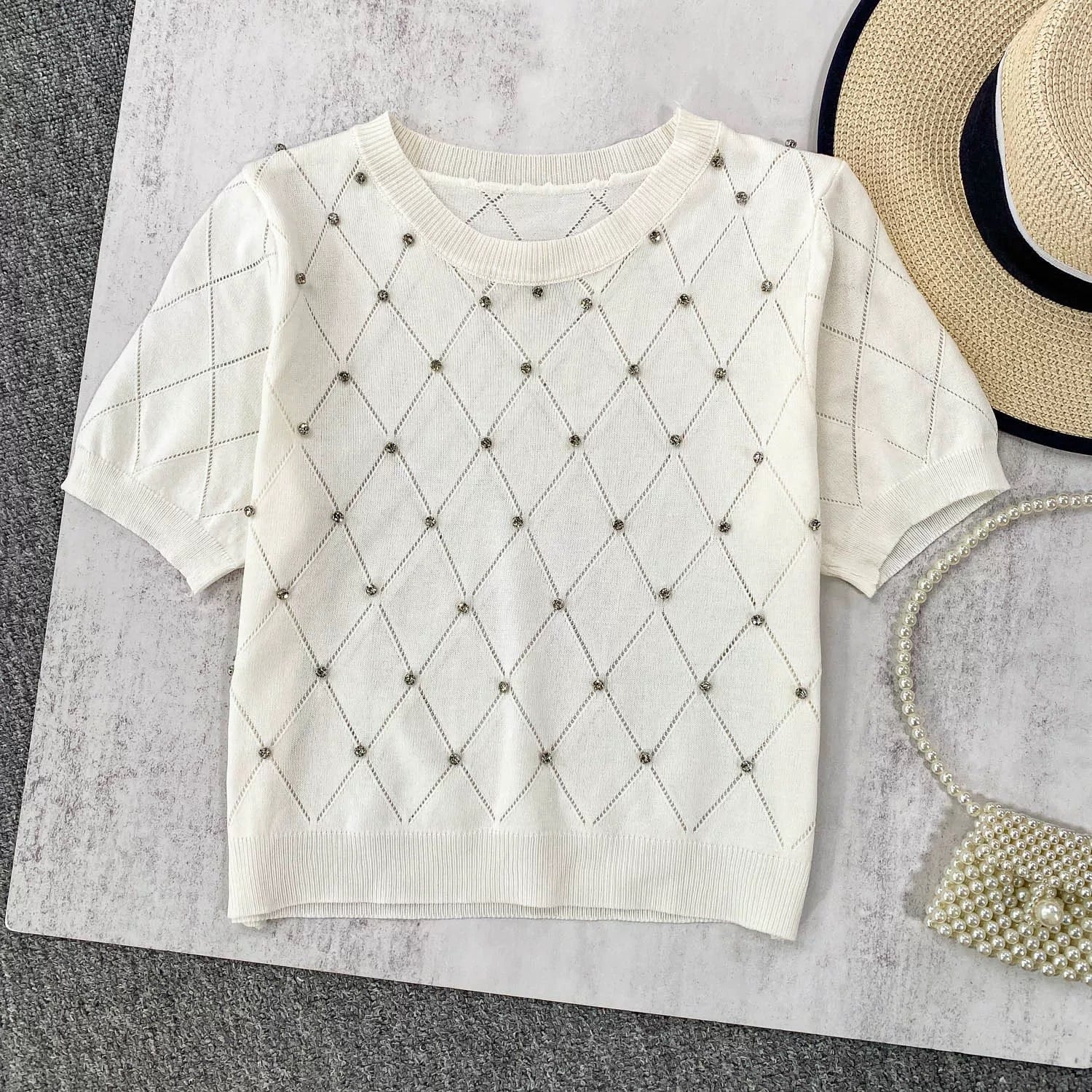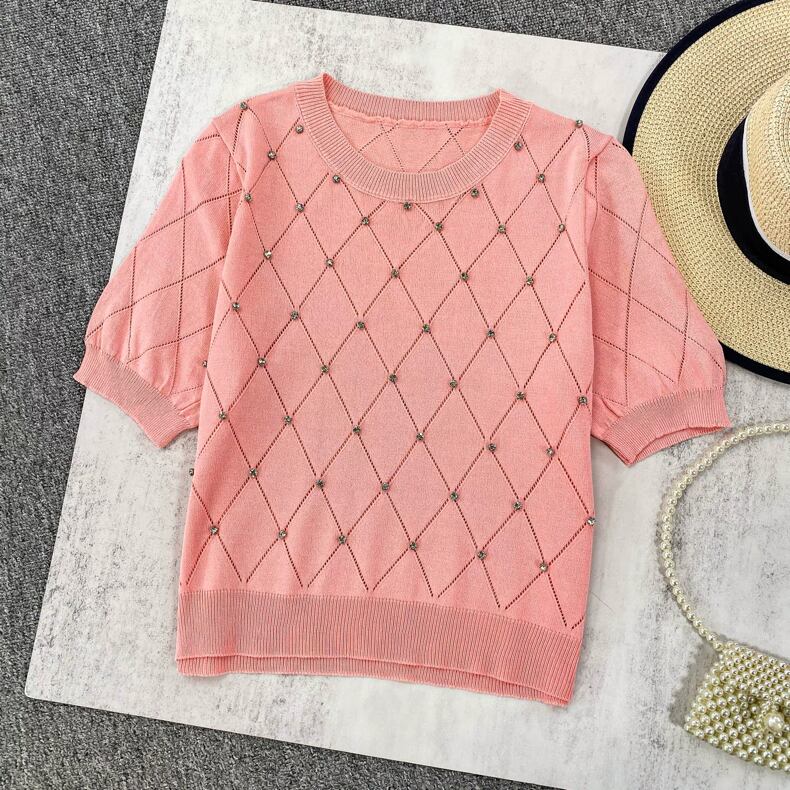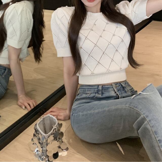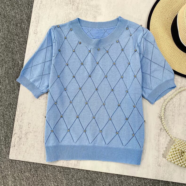 【tops】5色ダイヤ柄ストーンサマーニットトップス3色 XG0013