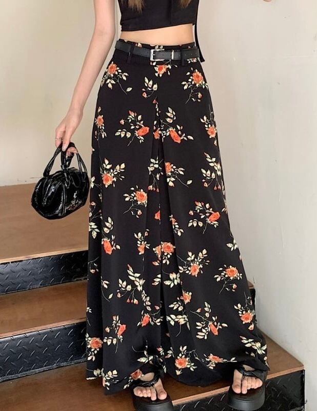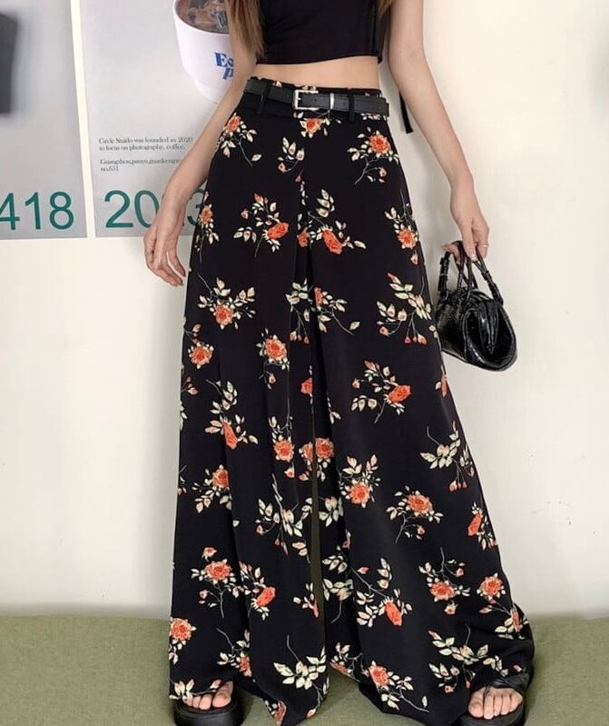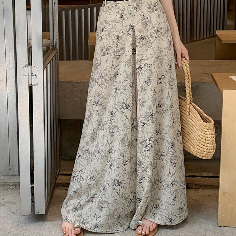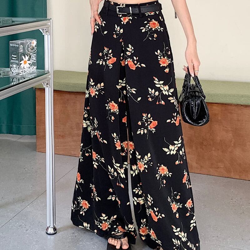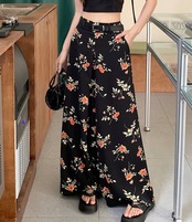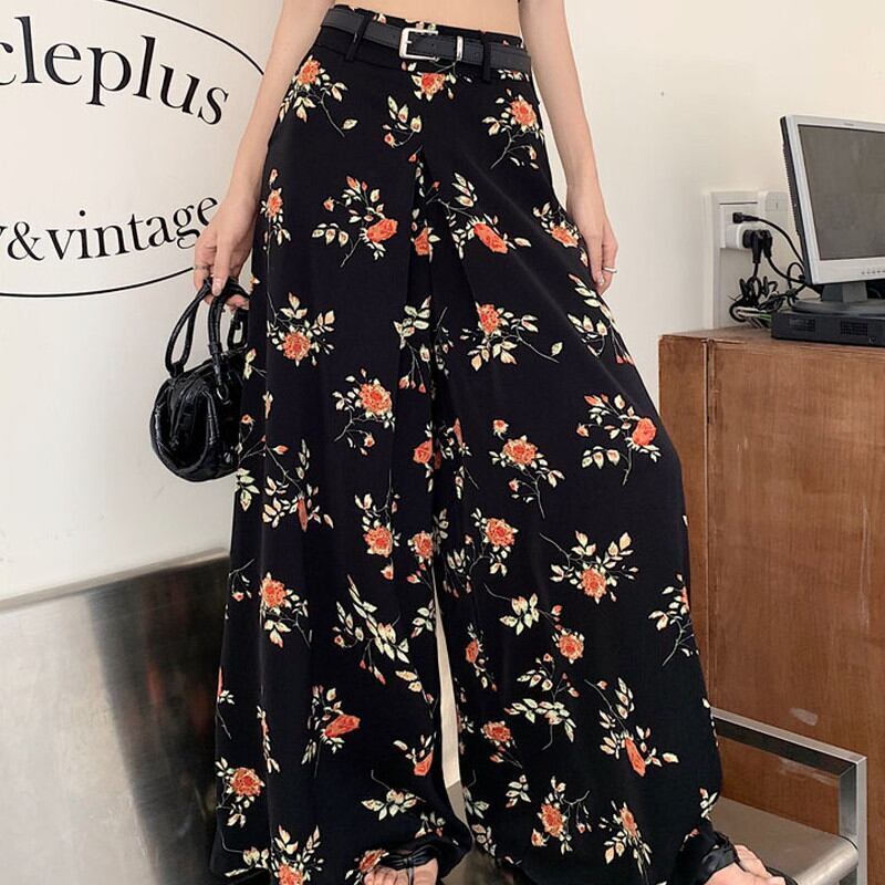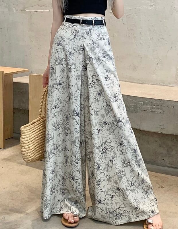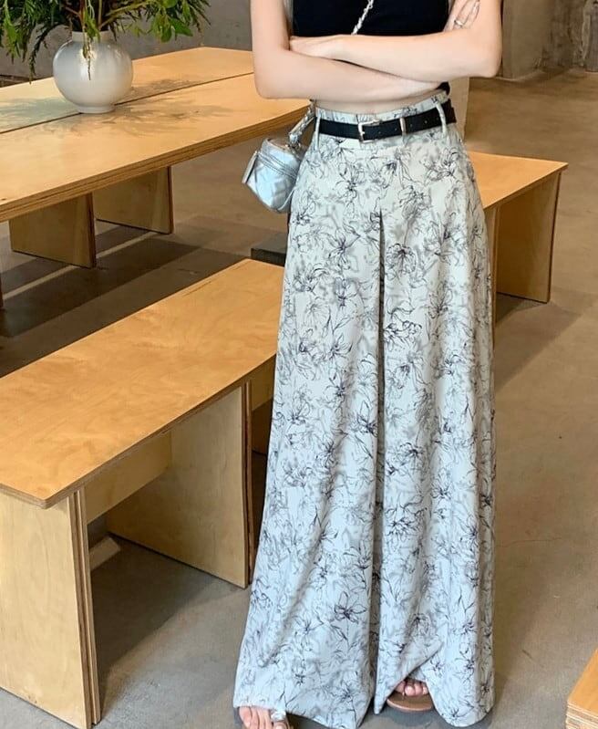 【bottoms】ワイドレッグ花柄シフォンパンツ2色 XG0021
