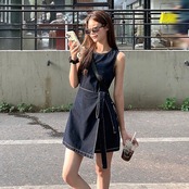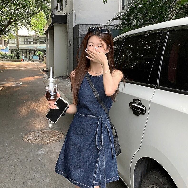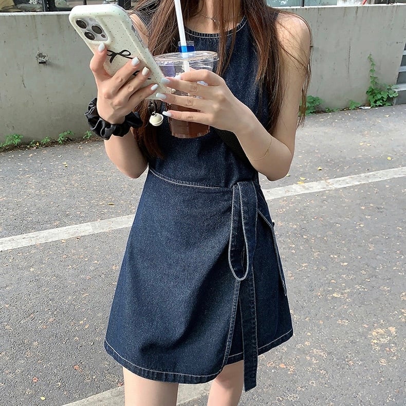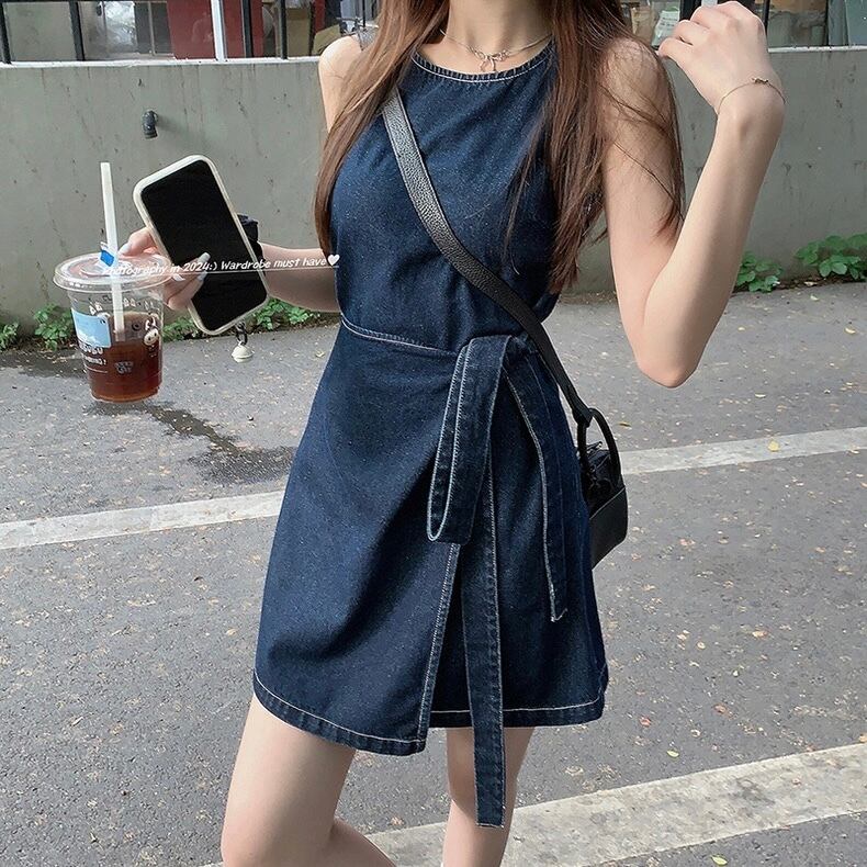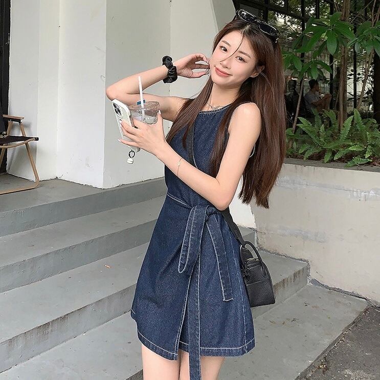 【dress】リボンベルトデニムノースリーブミニワンピース JY5168