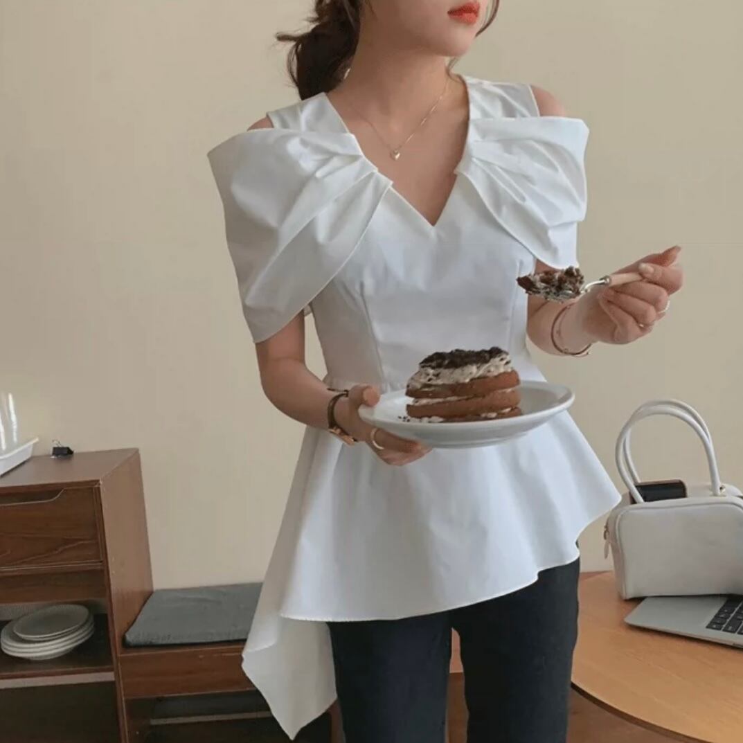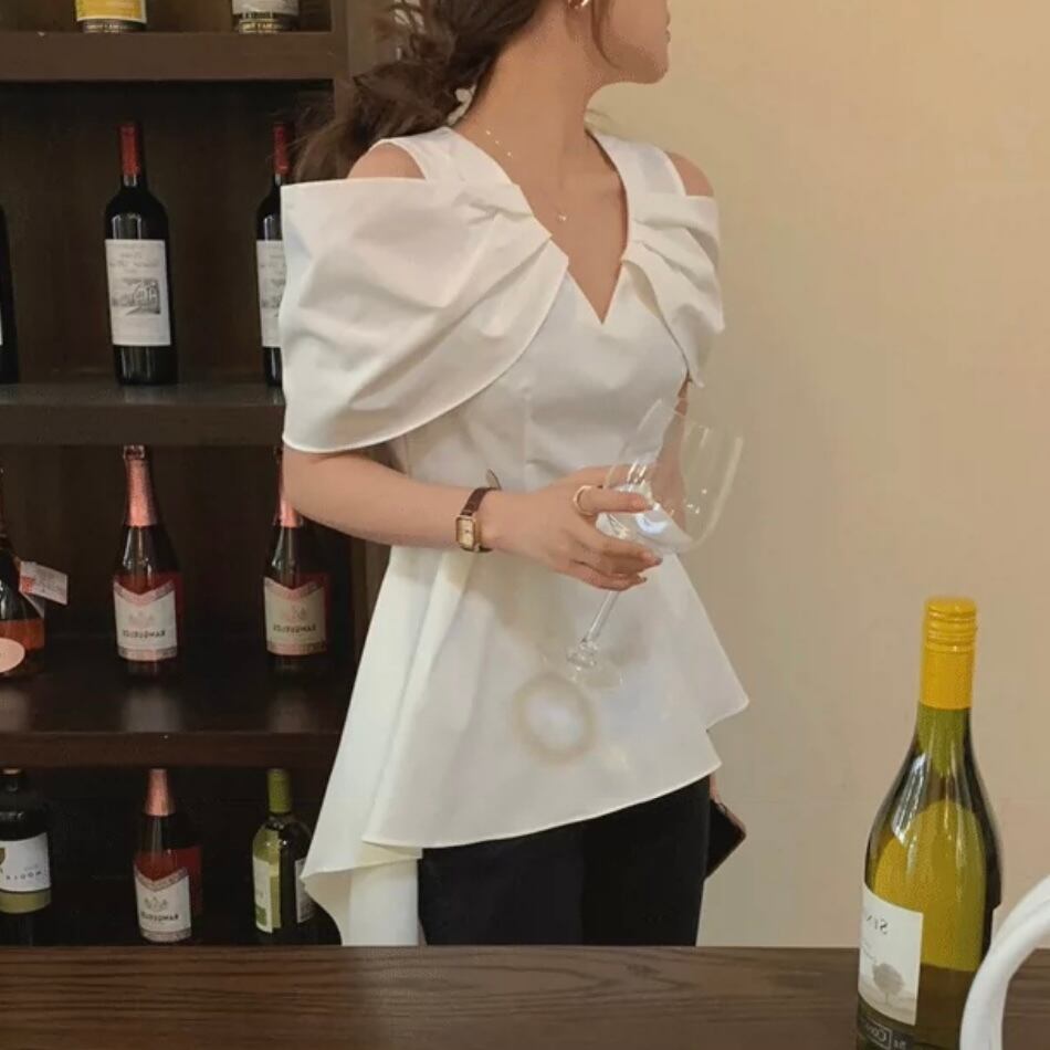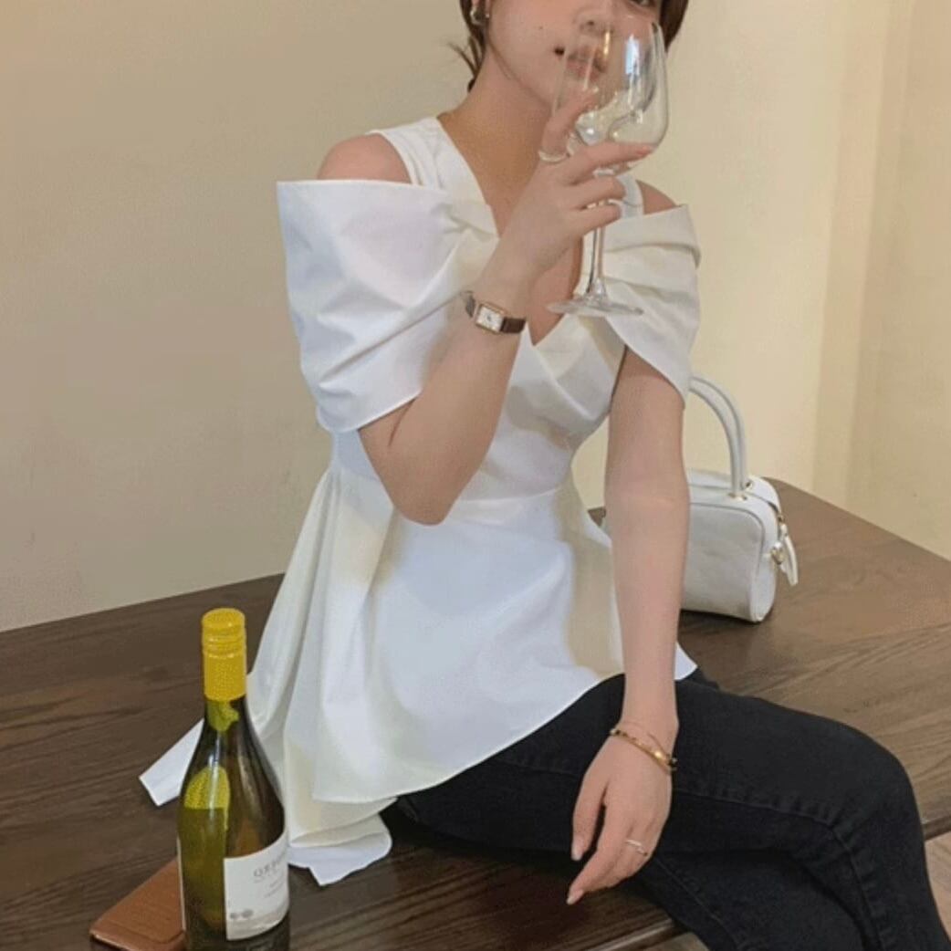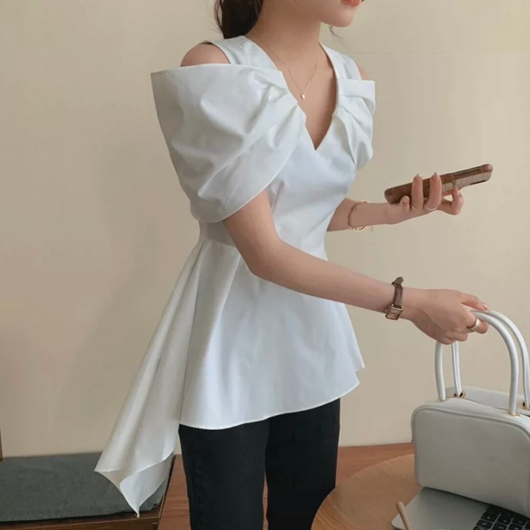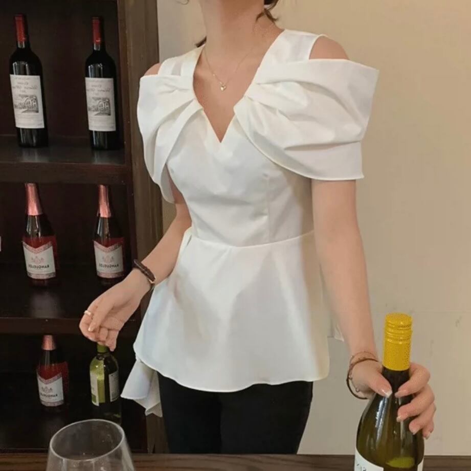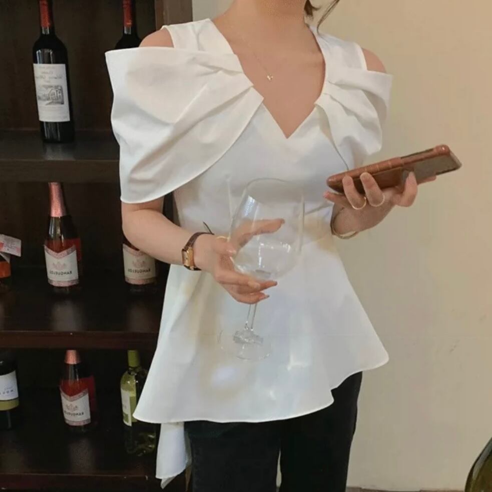 【tops】Vネックオフショルダーフレアシャツ MN1002