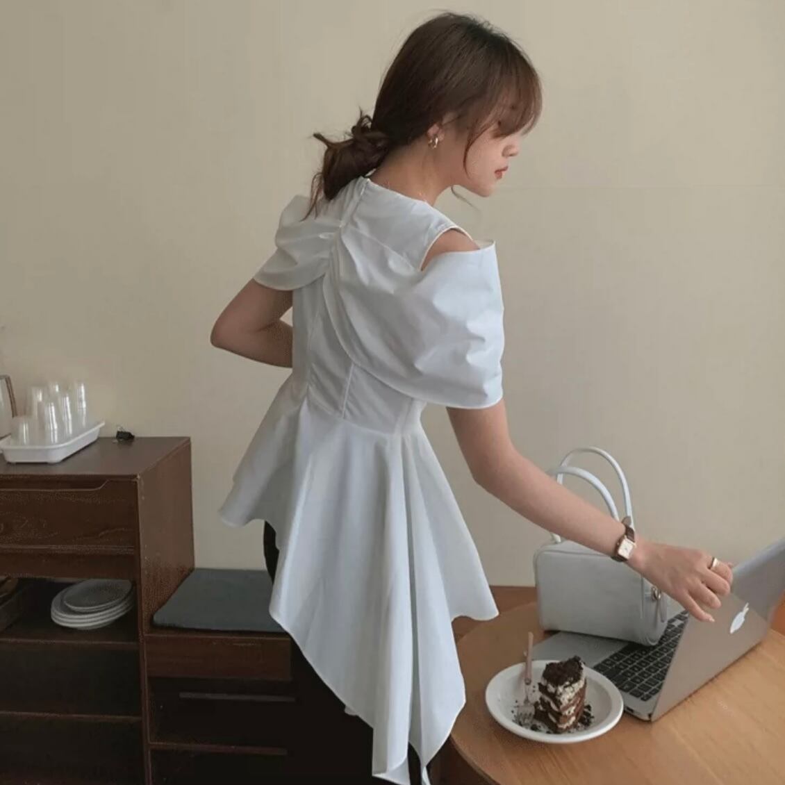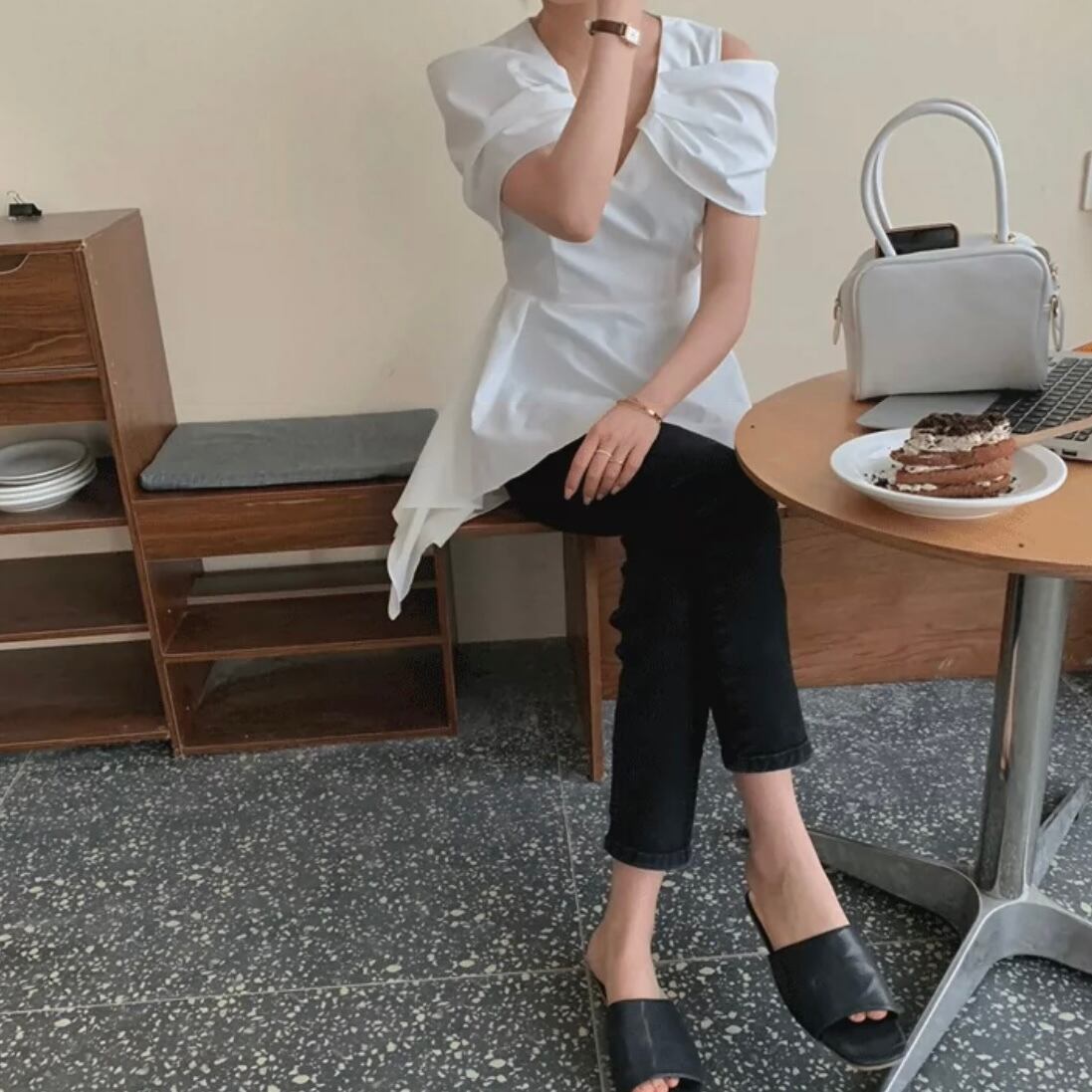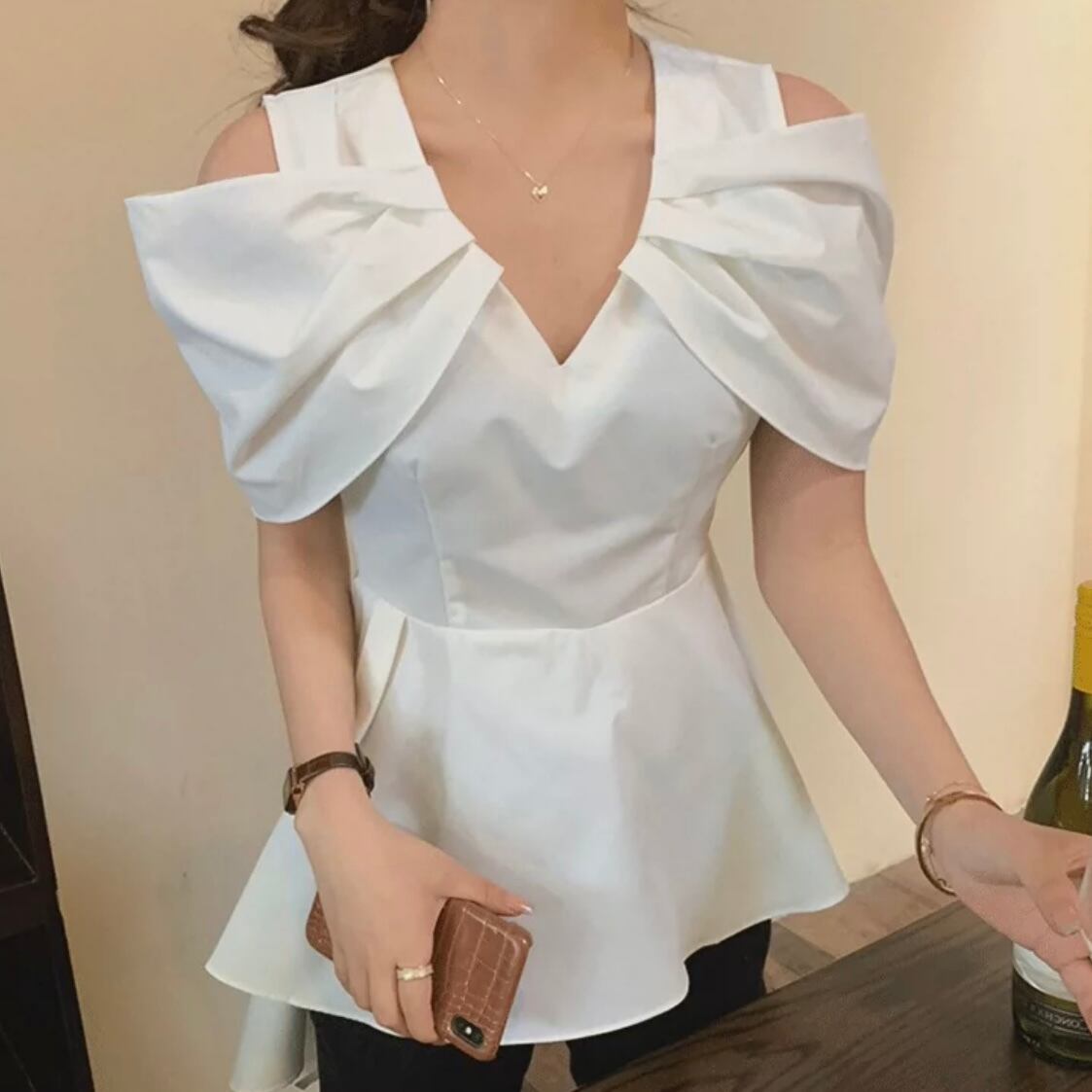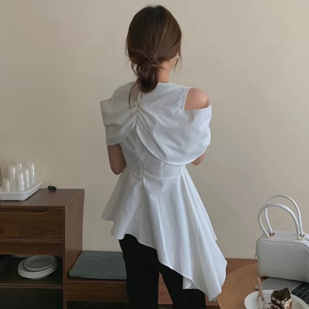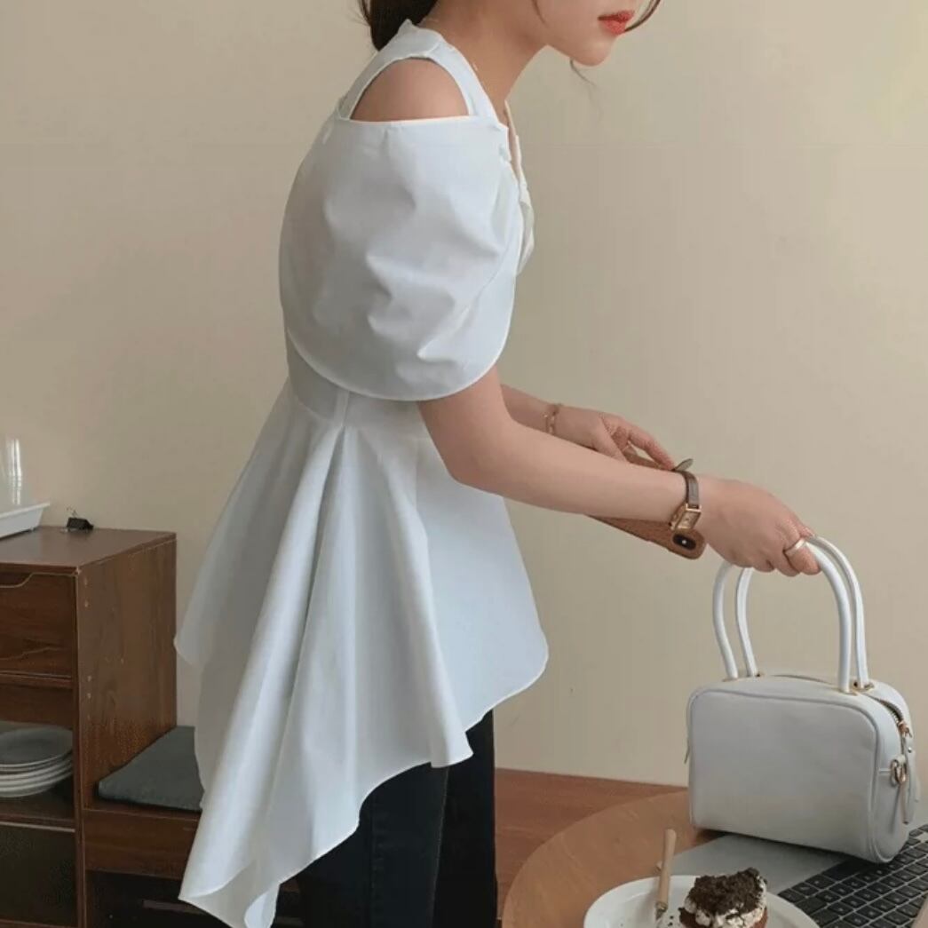 【tops】Vネックオフショルダーフレアシャツ MN1002