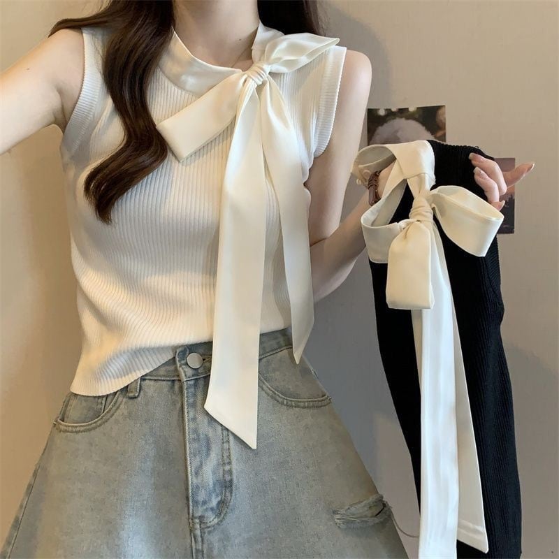 【tops】リボン配色ニットノースリーブトップス3色 HX6103