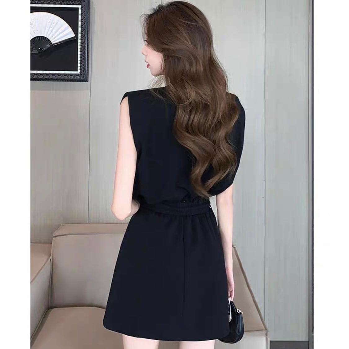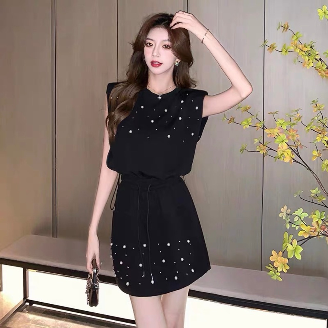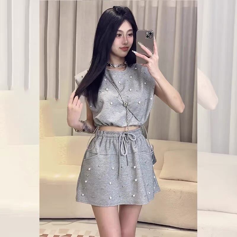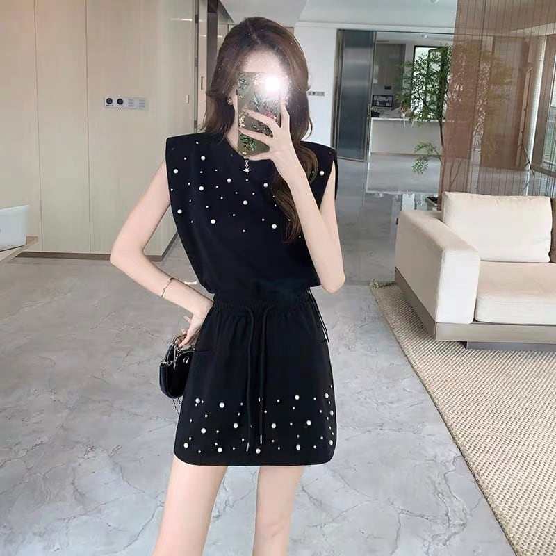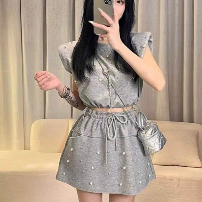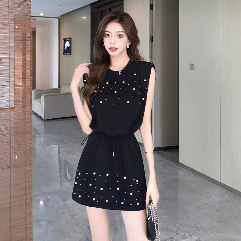 【set】着回しパールノースリーブトップスxミニスカート2色 HX6106