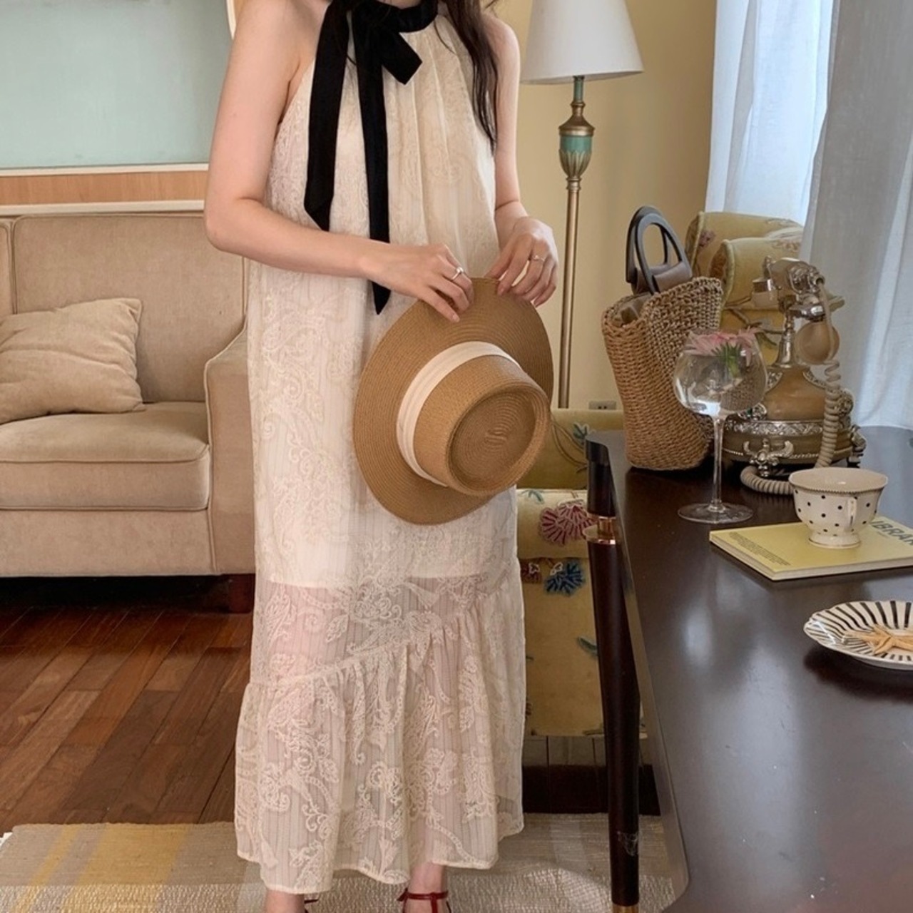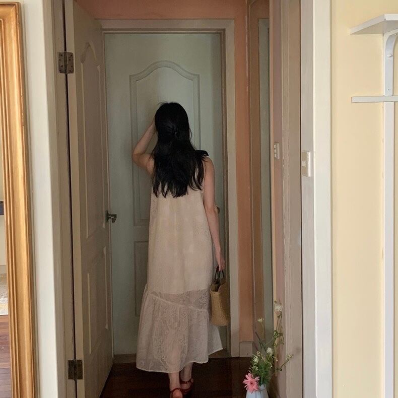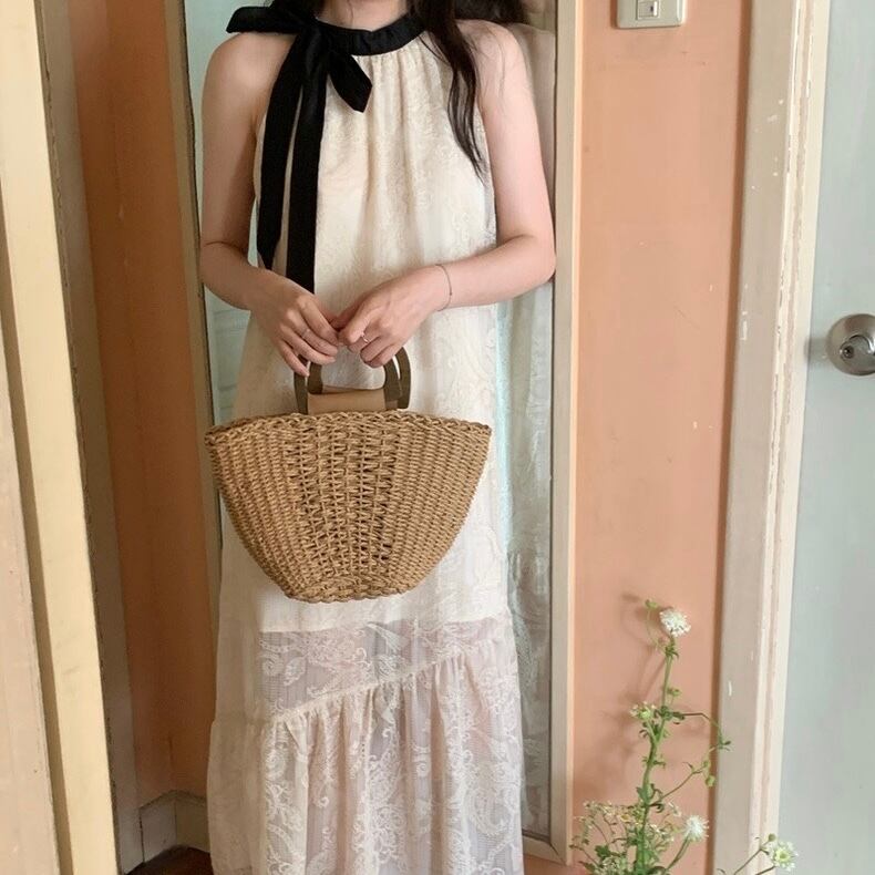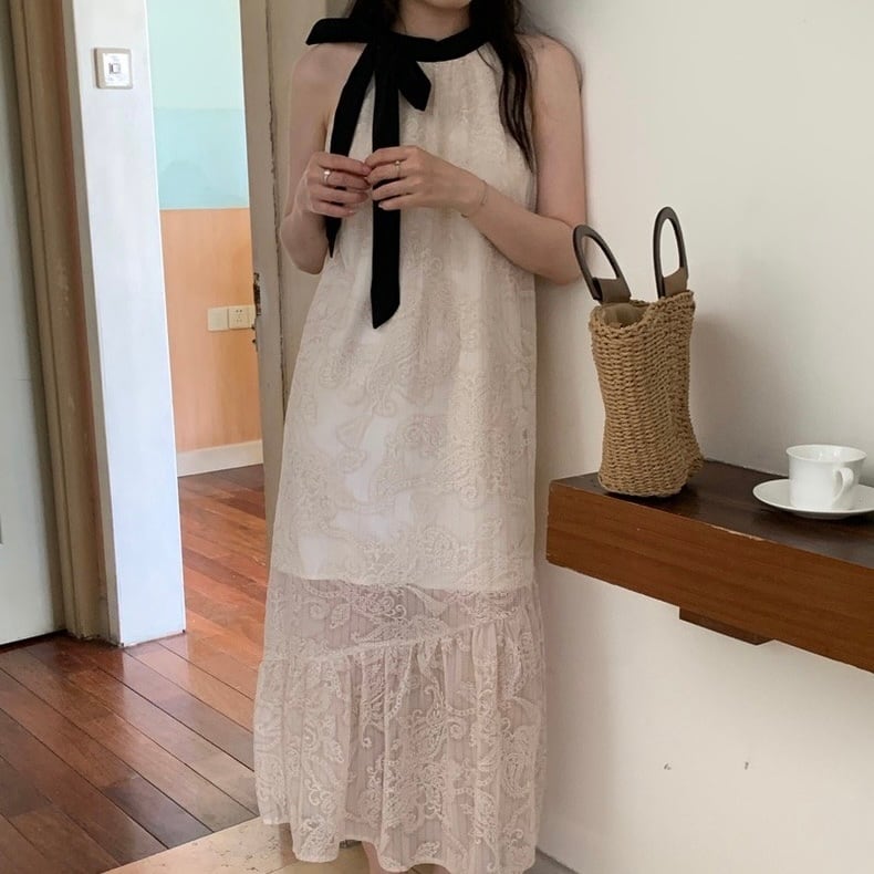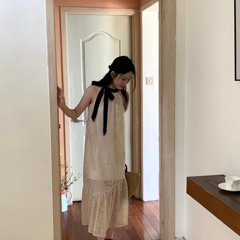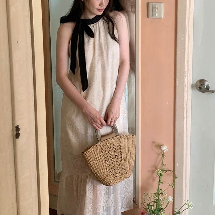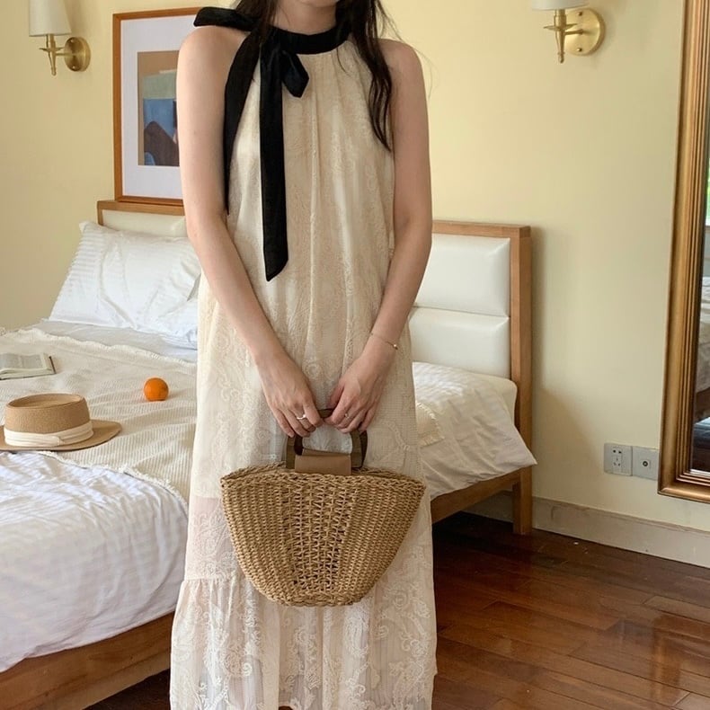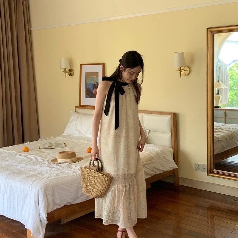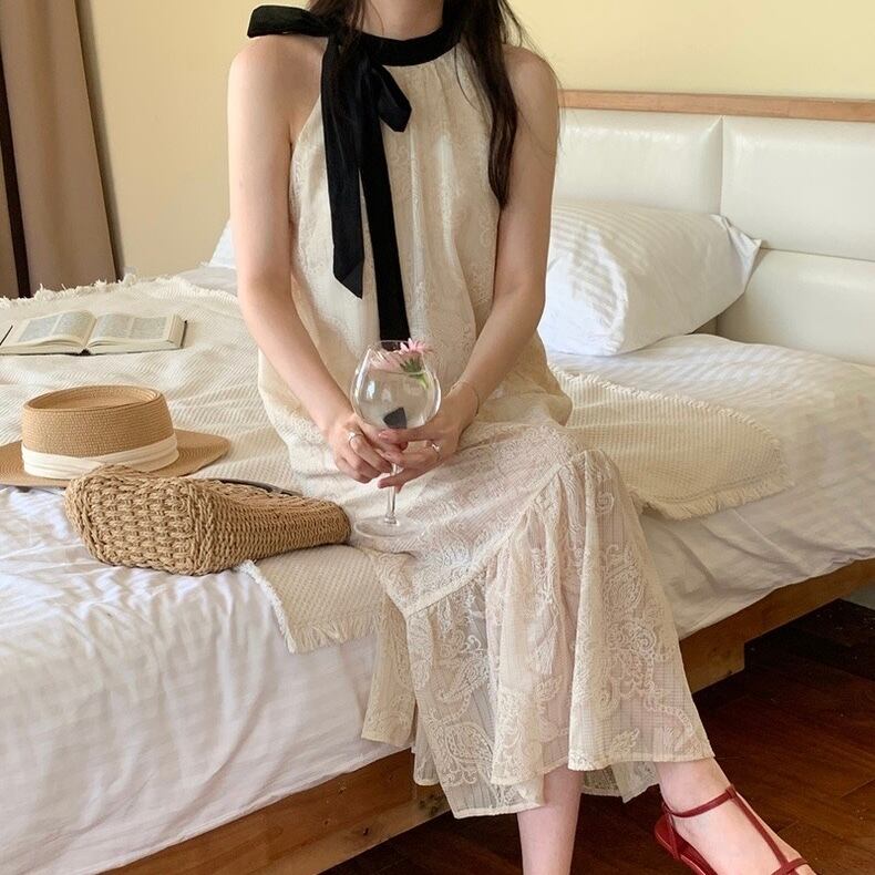 【dress】配色ホルターネックレースワンピース JF6132