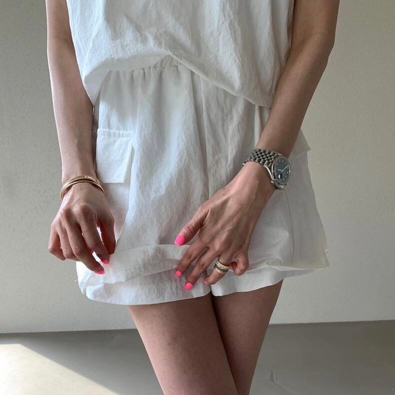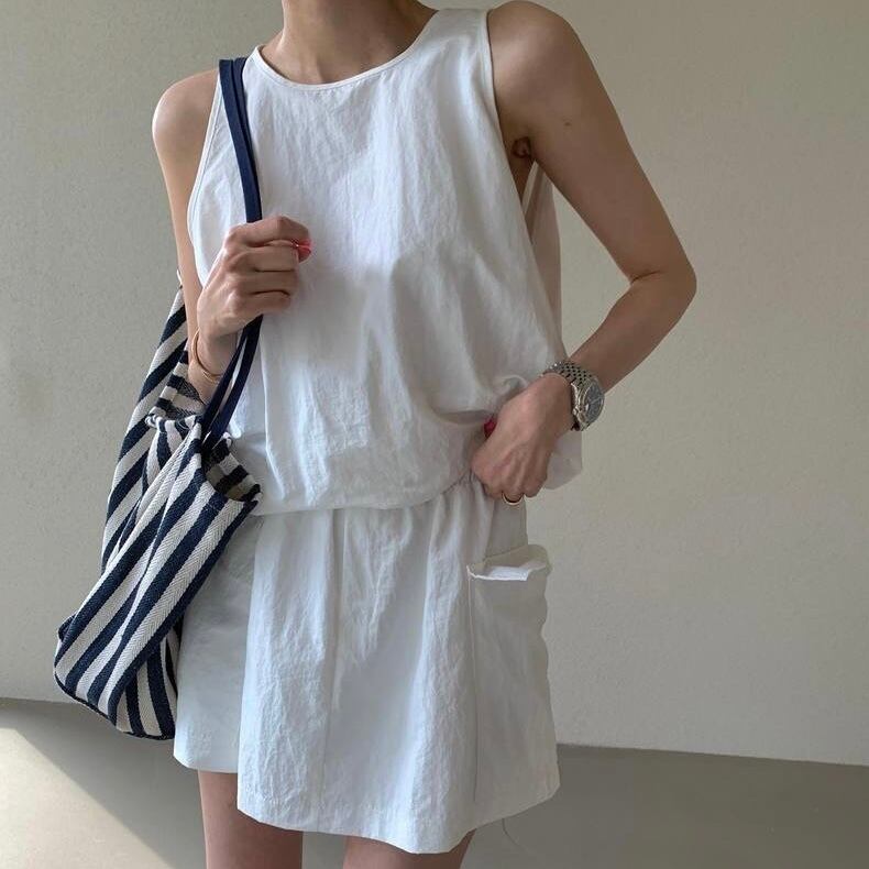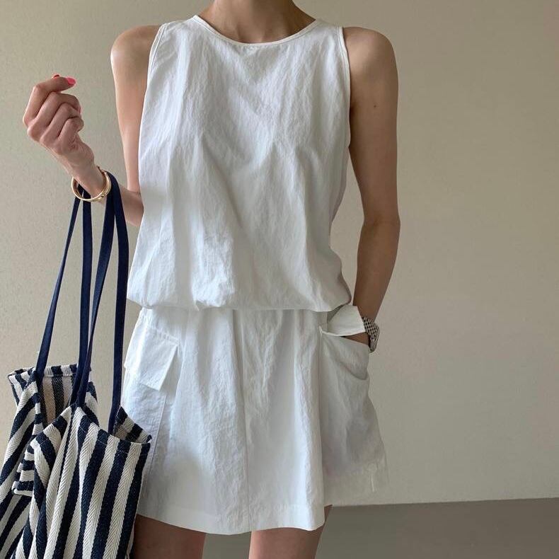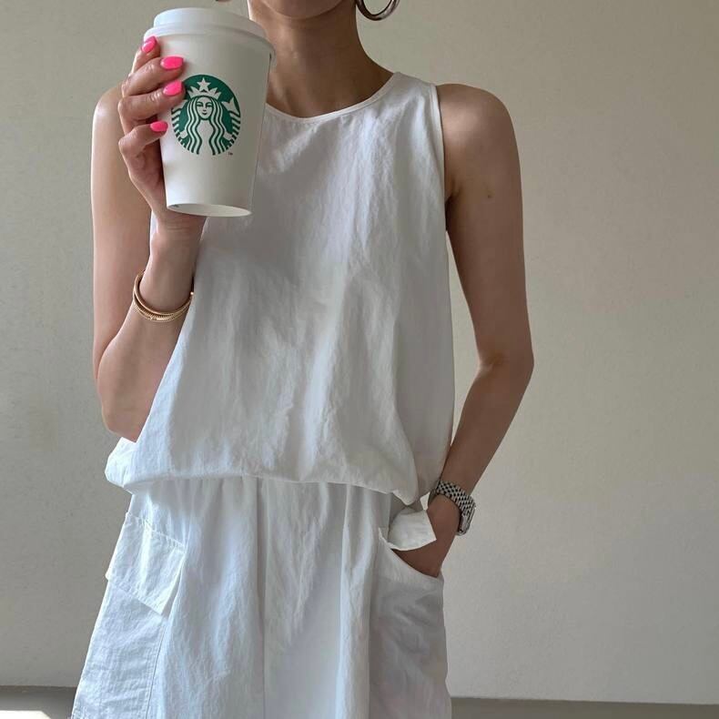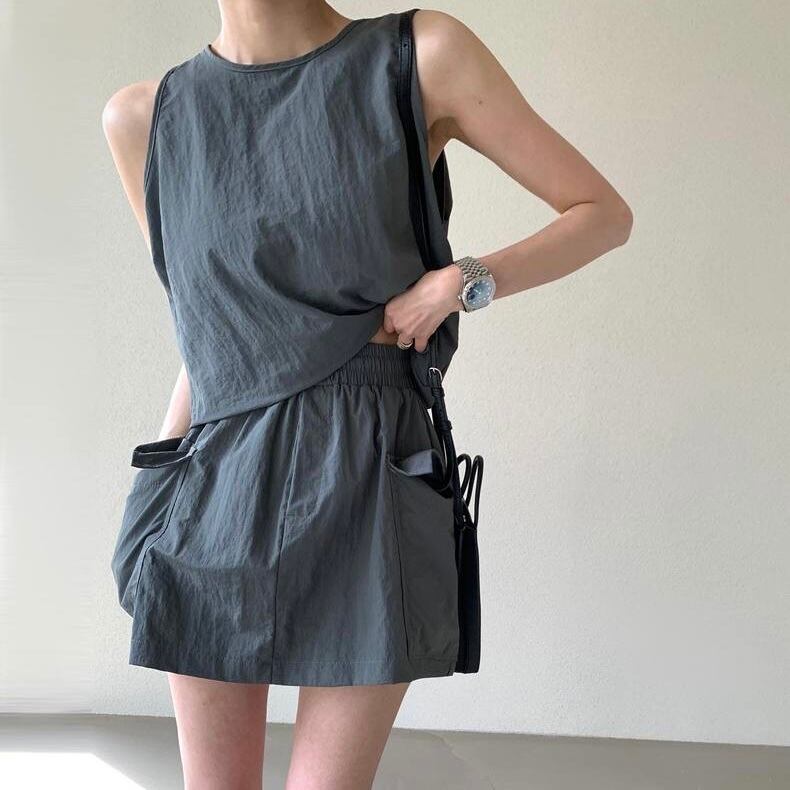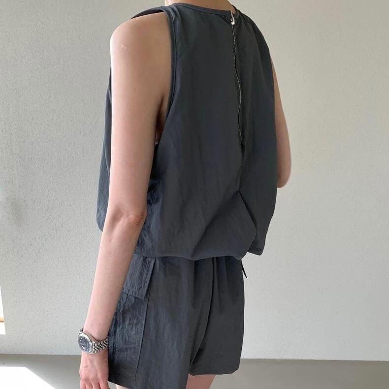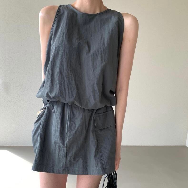 【set】バックファスナーノースリーブトップスxスカート2色 JF6178