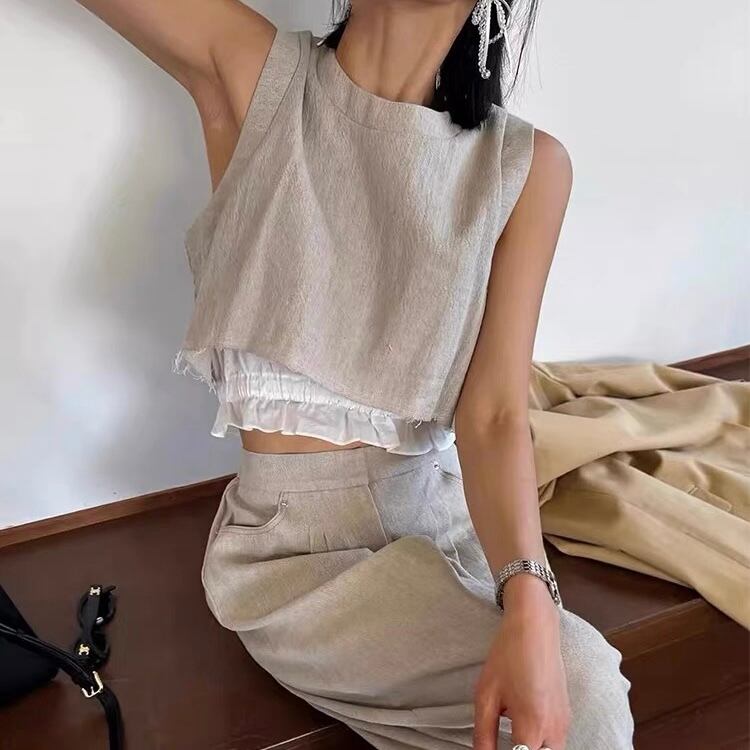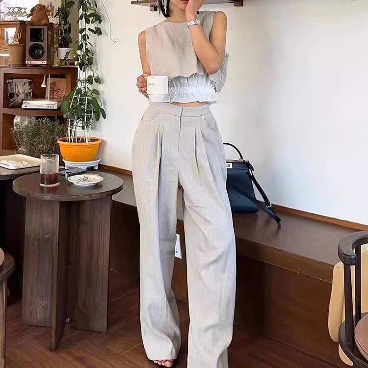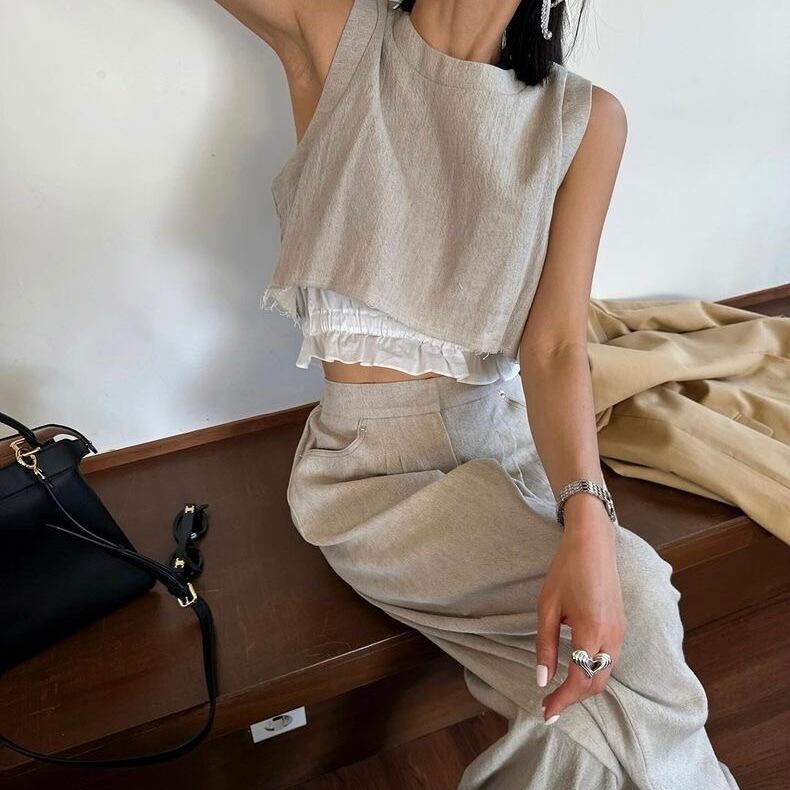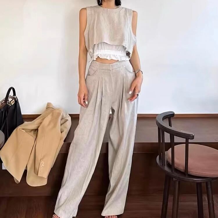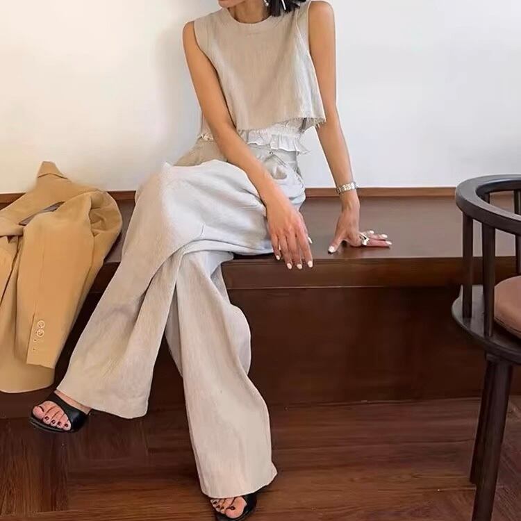 【set】フリル切り替えノースリーブトップスxワイドパンツ JF0617