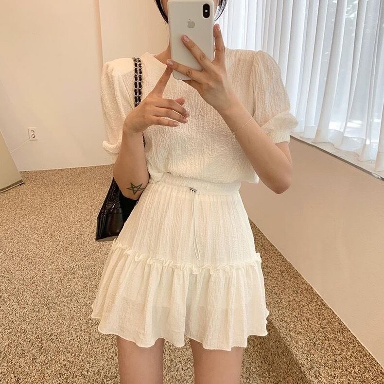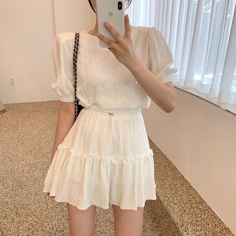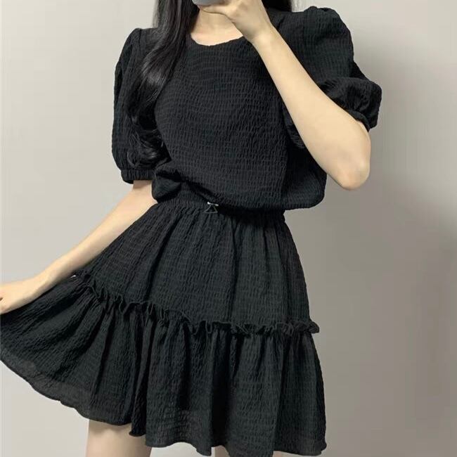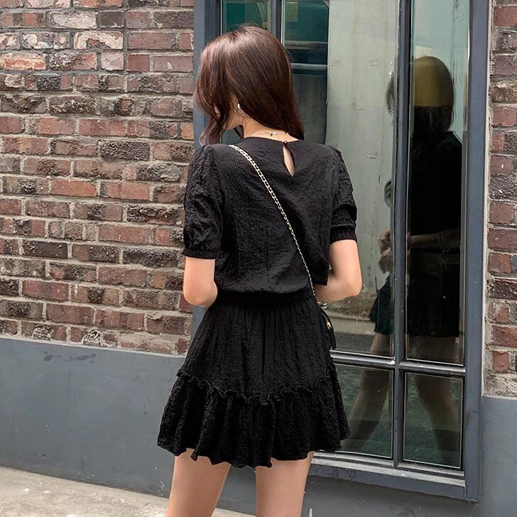 【set】韓国系パフスリーブトップスxミニスカート2色 SY6225