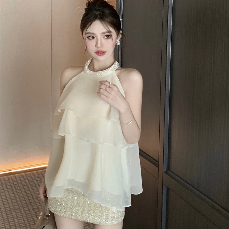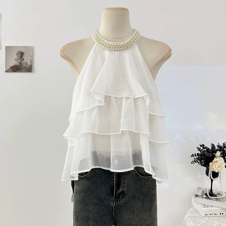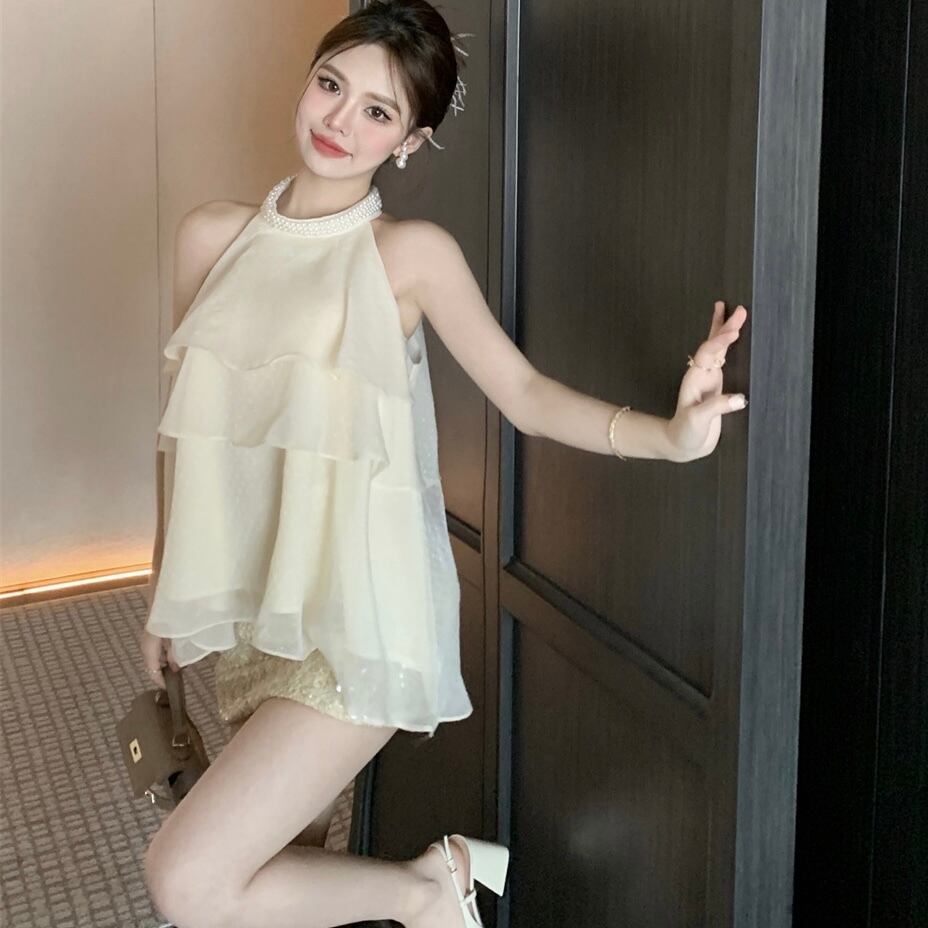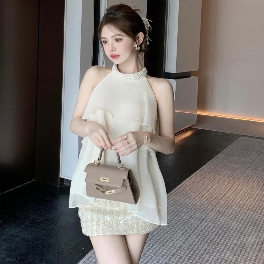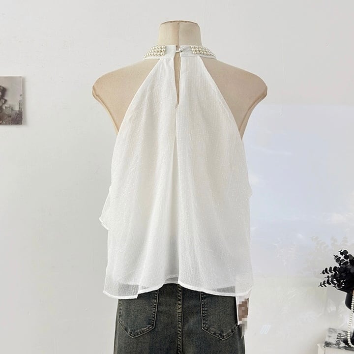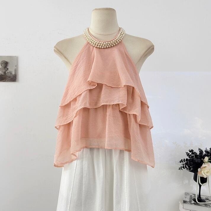 【tops】4色パール付きホルターネックトップス ZM6295