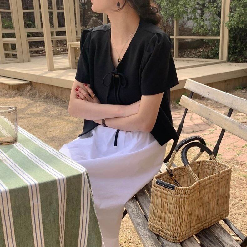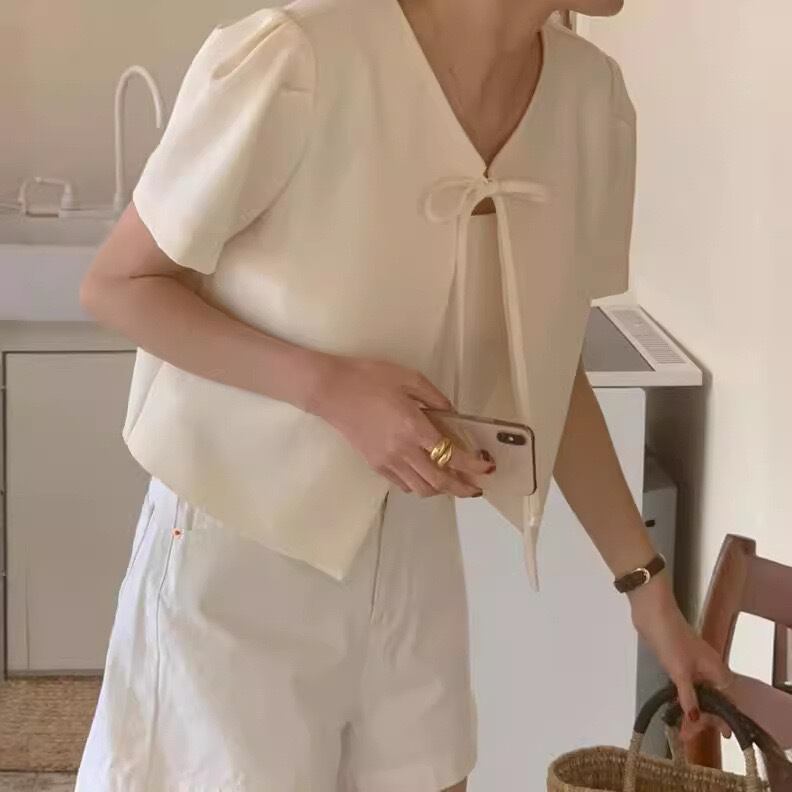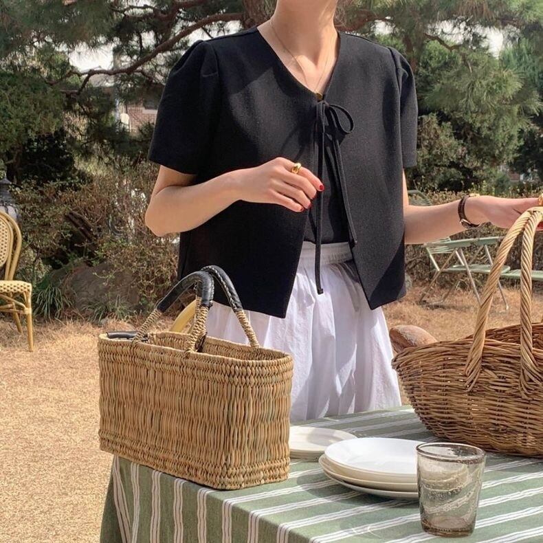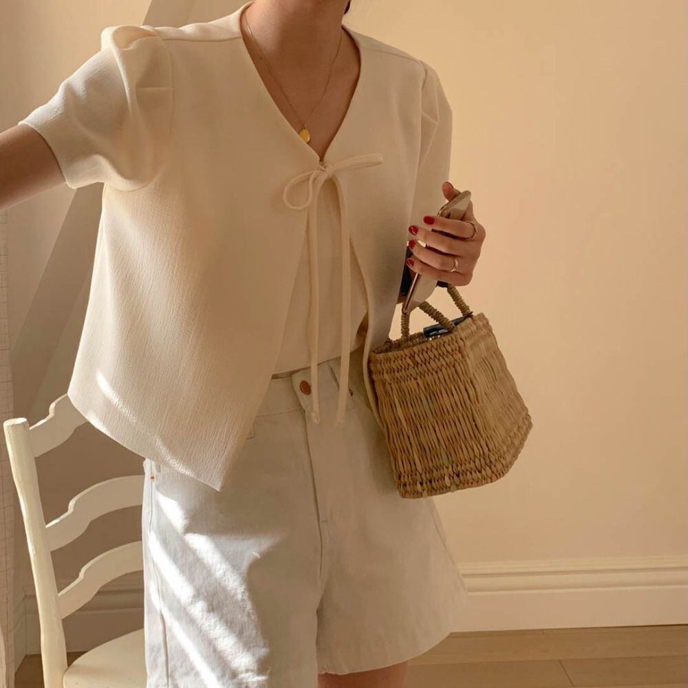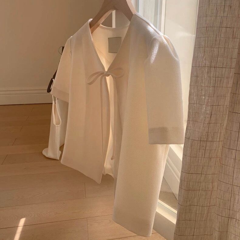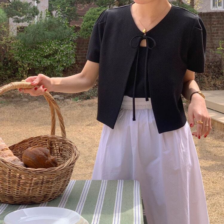 【outer】韓国系リボン半袖ジャケット2色 JY7174