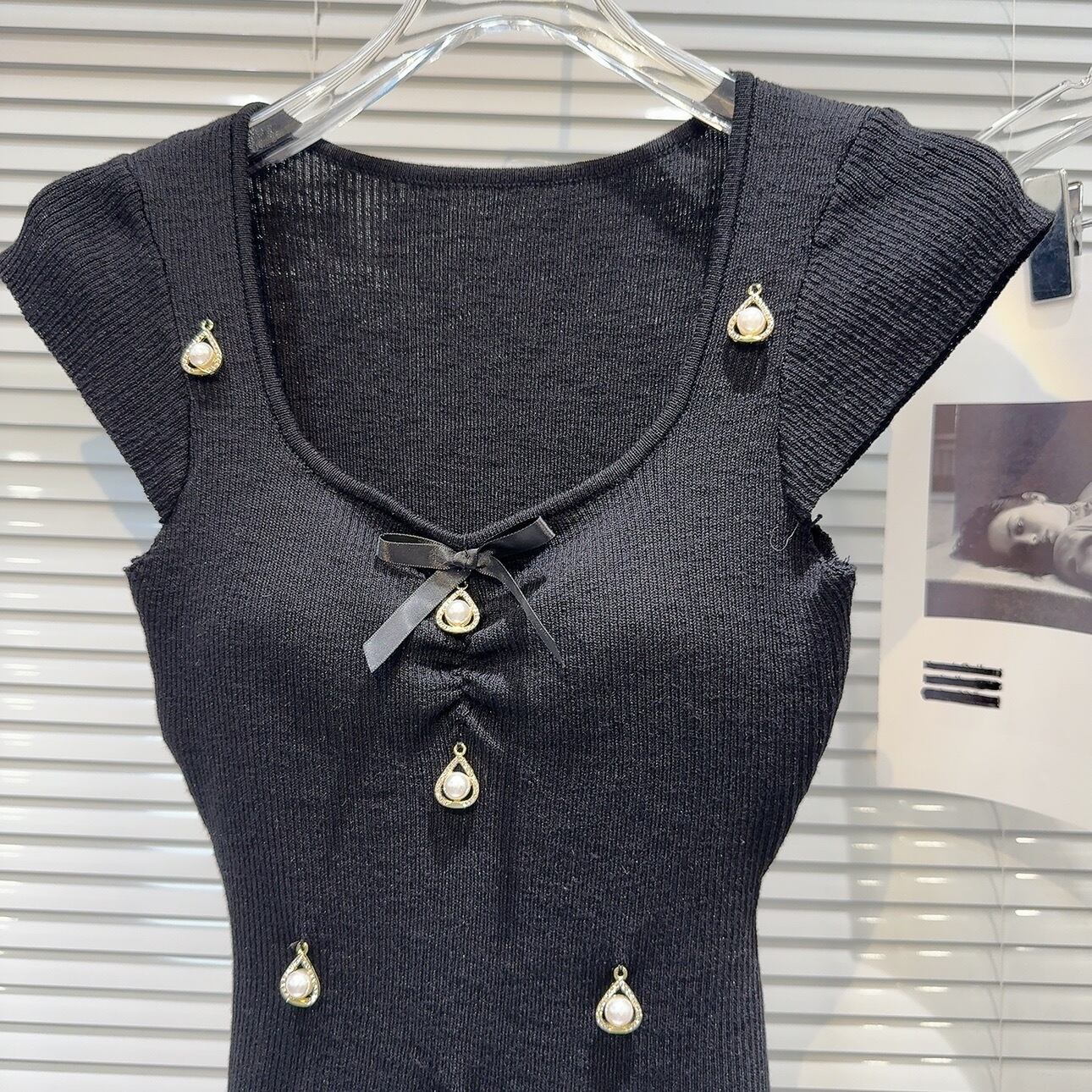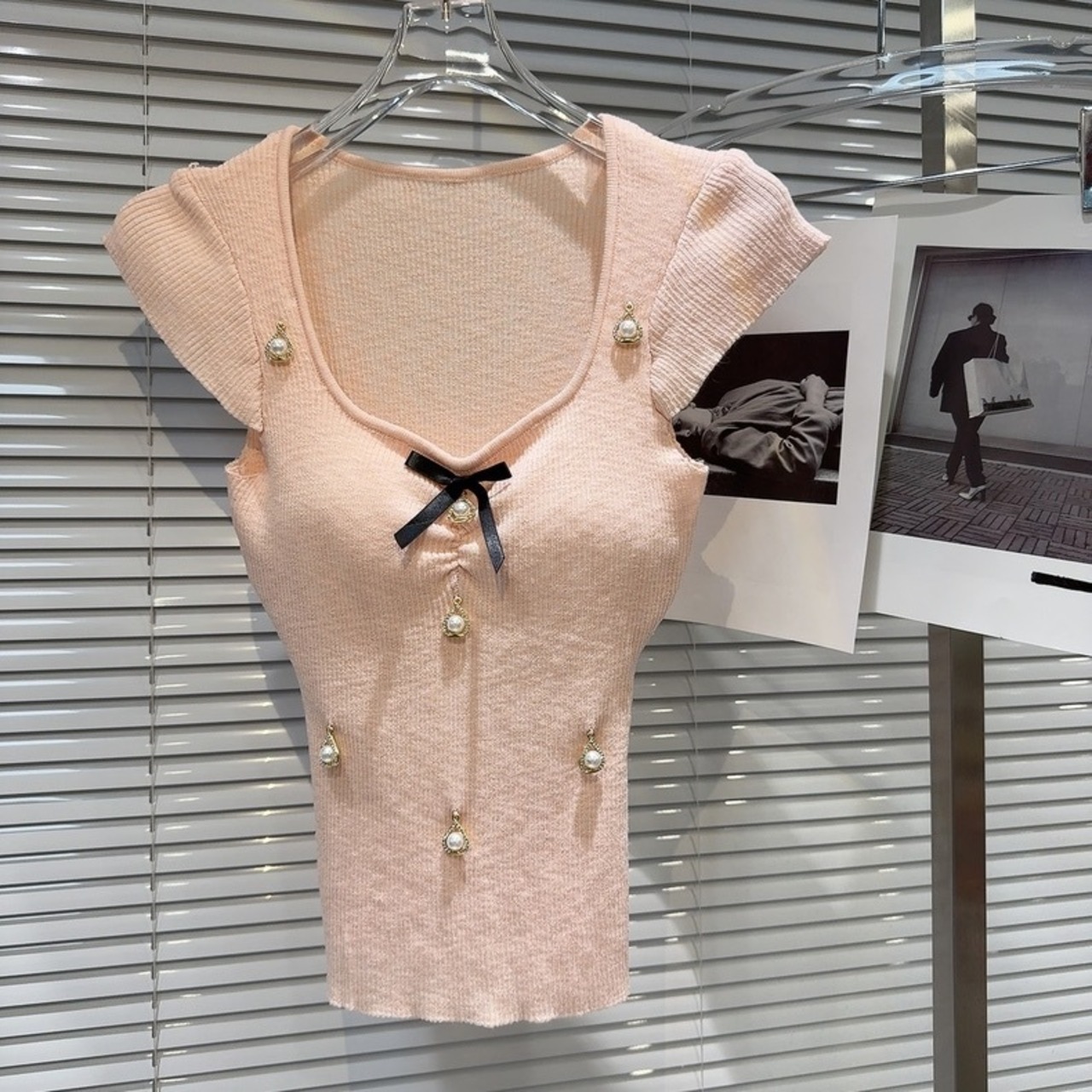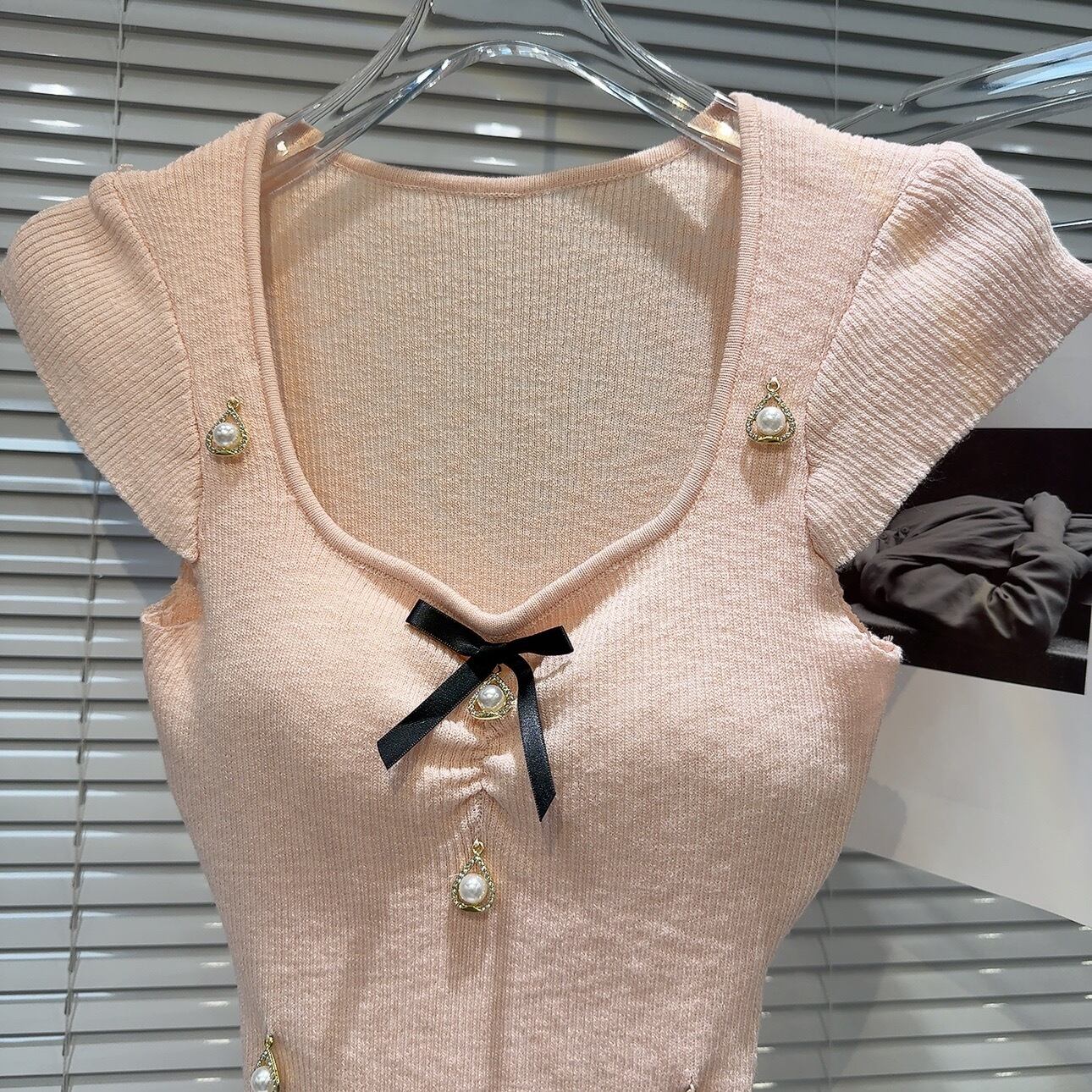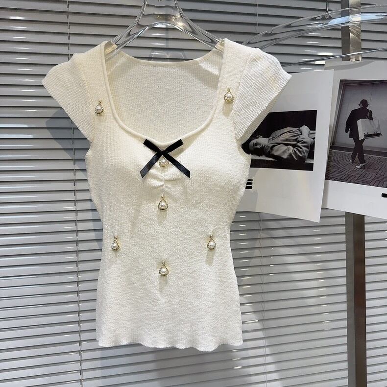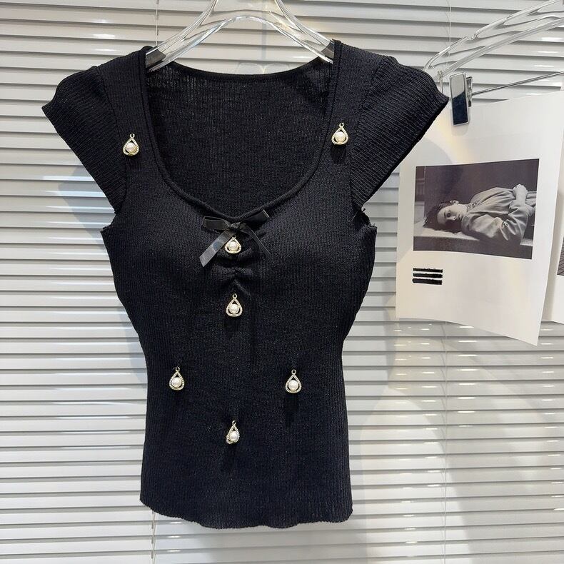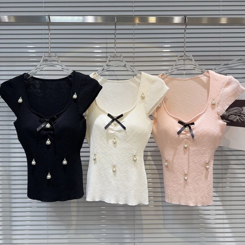【tops】パット付きパール&リボンニットトップス3色 SY7200