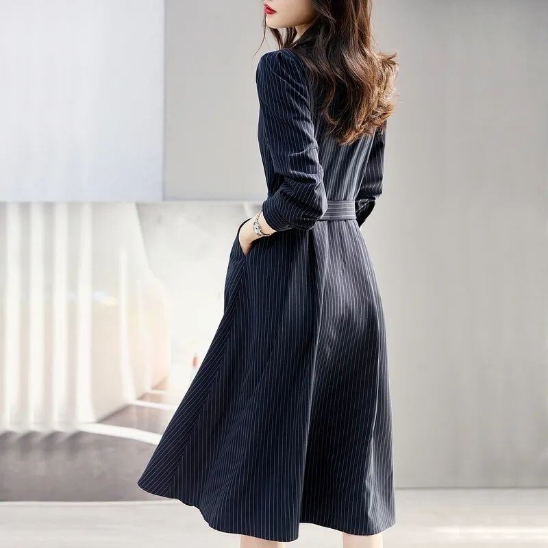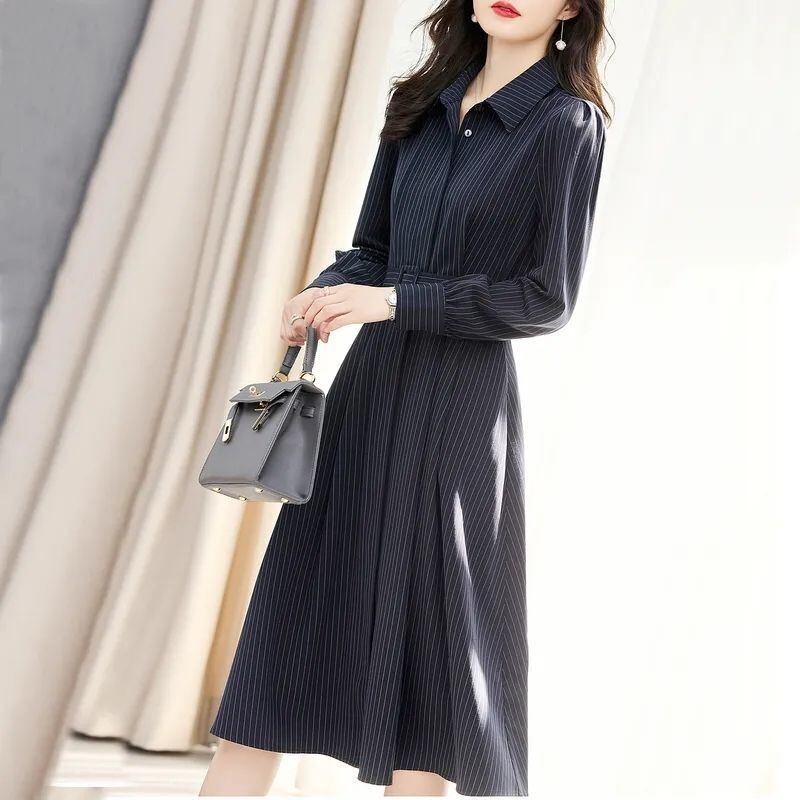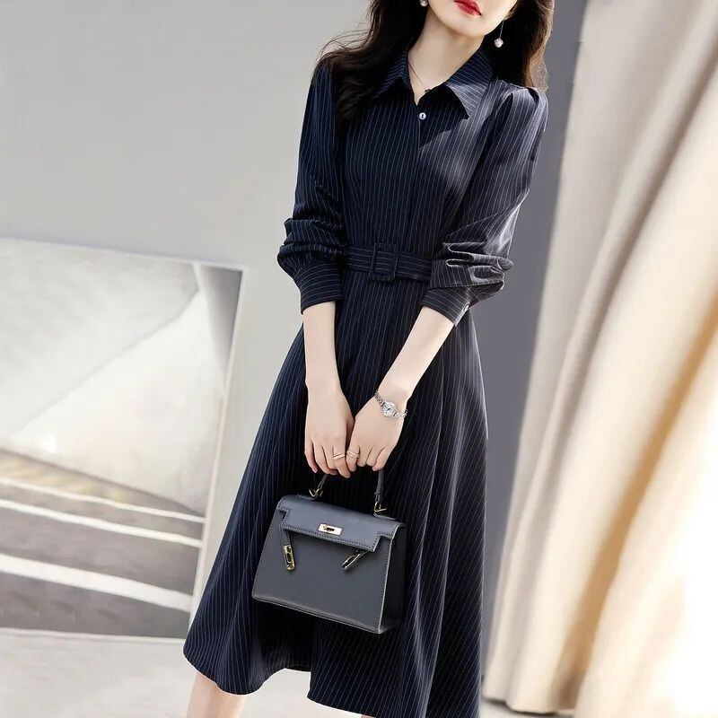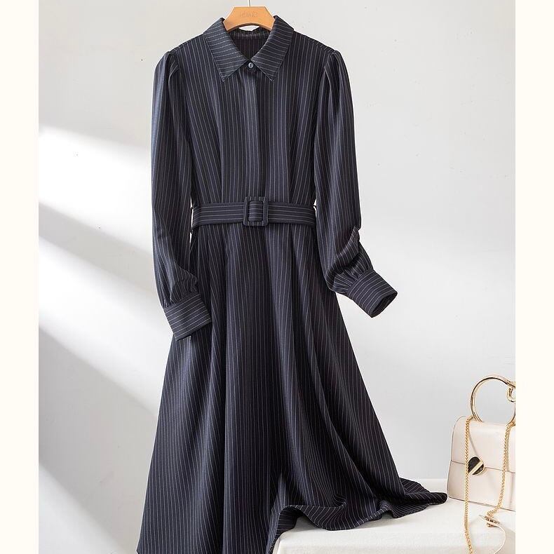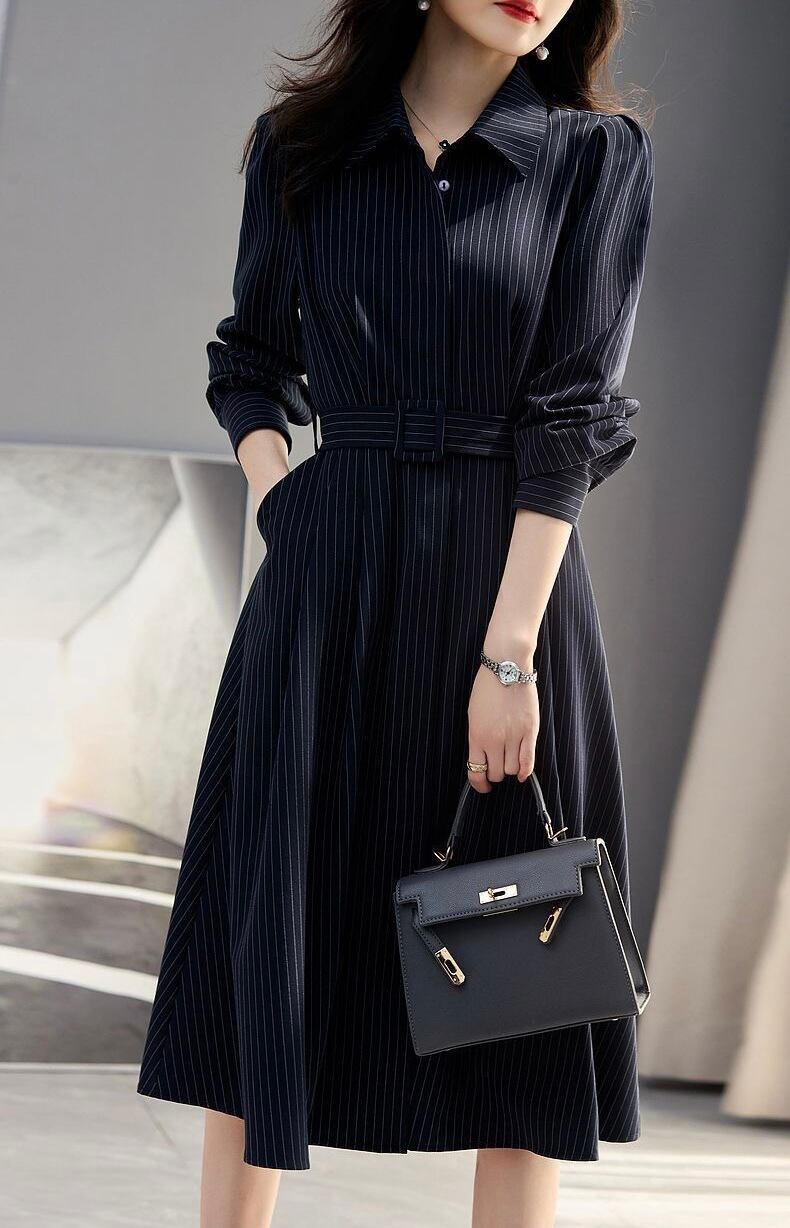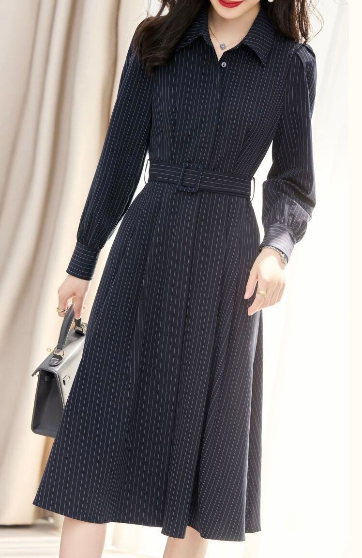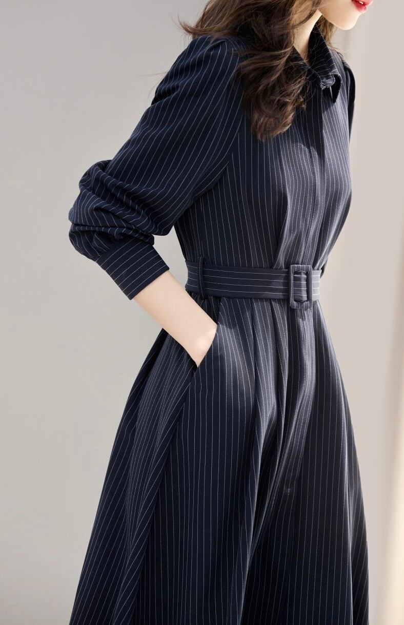 【dress】S〜2XLポケット付きストライプシャツワンピース JY7304