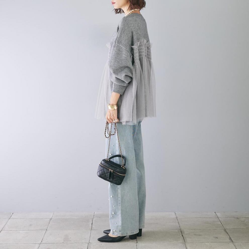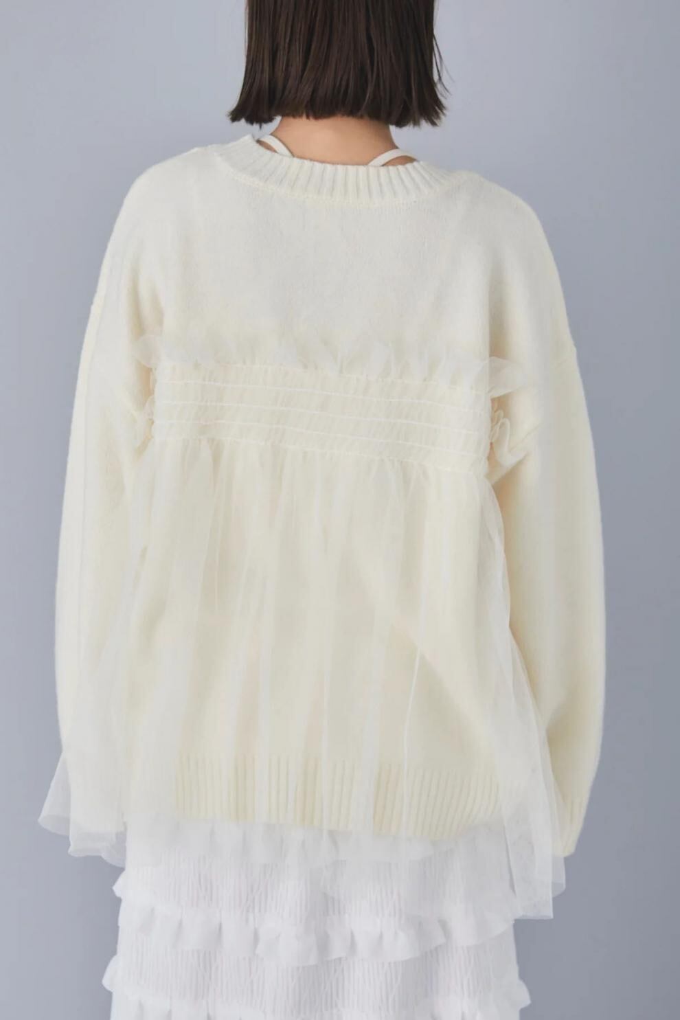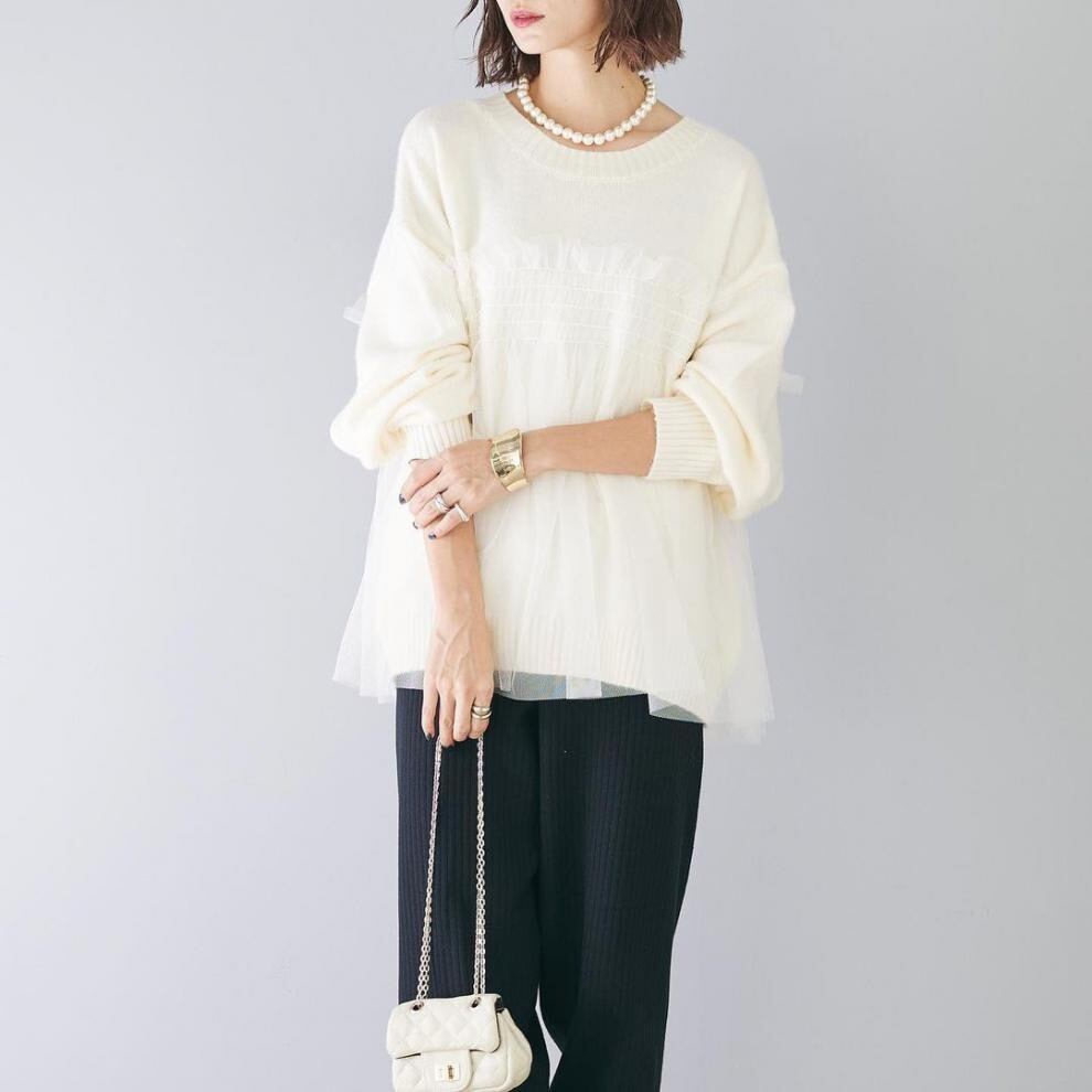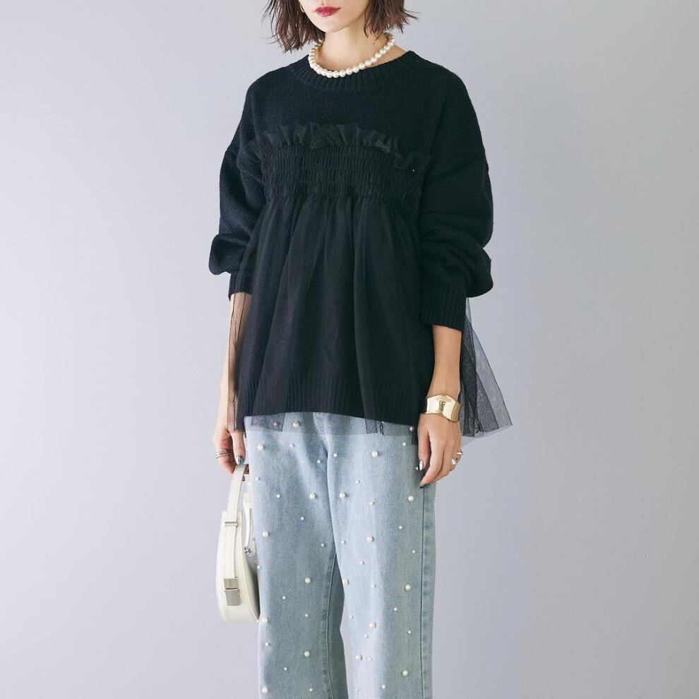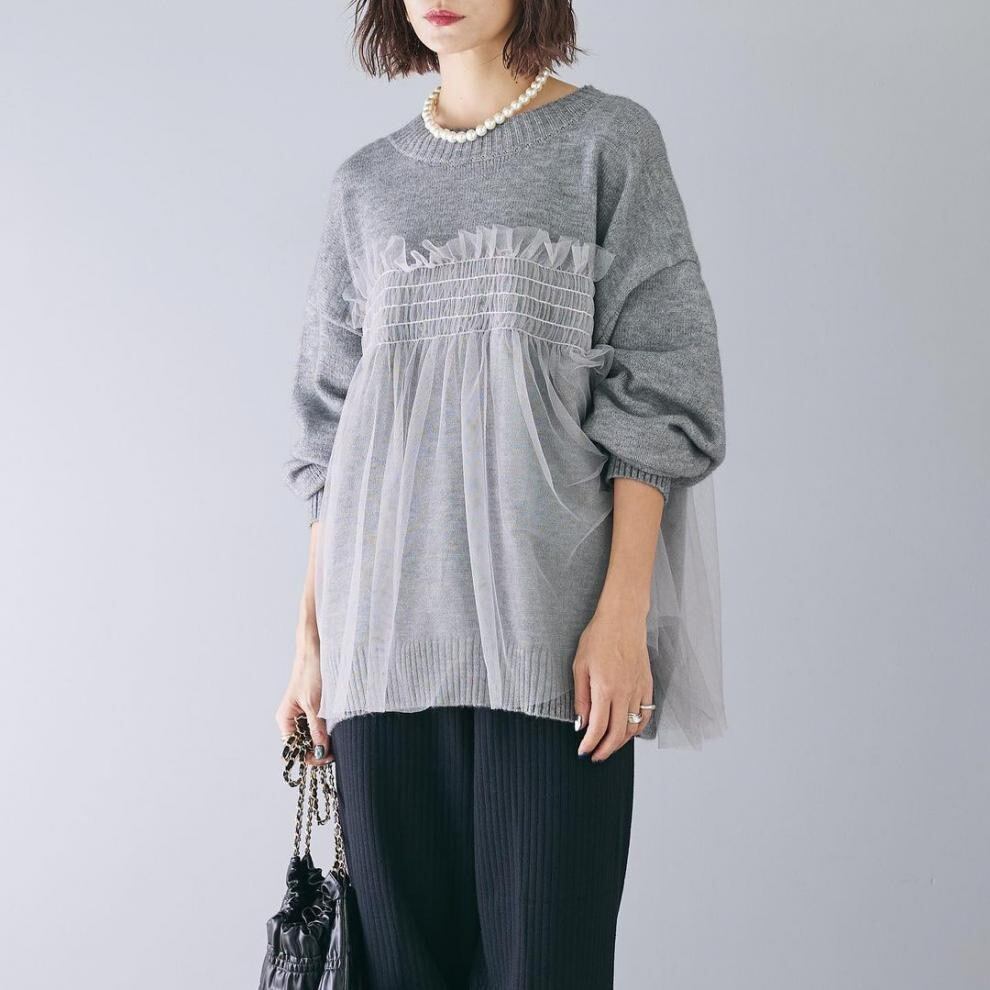 【tops】ラウンドネックチュール切り替えニットトップス3色 JY8104