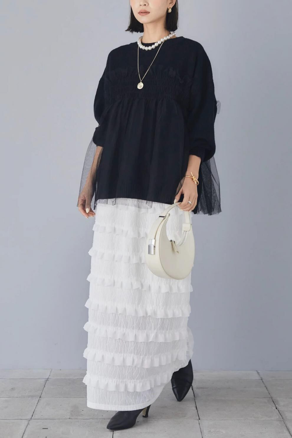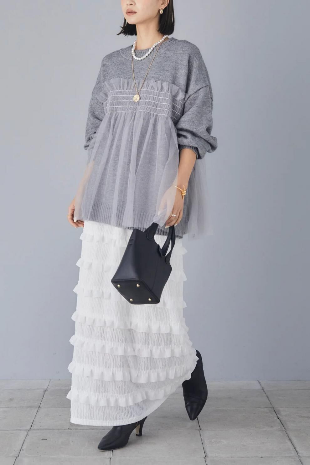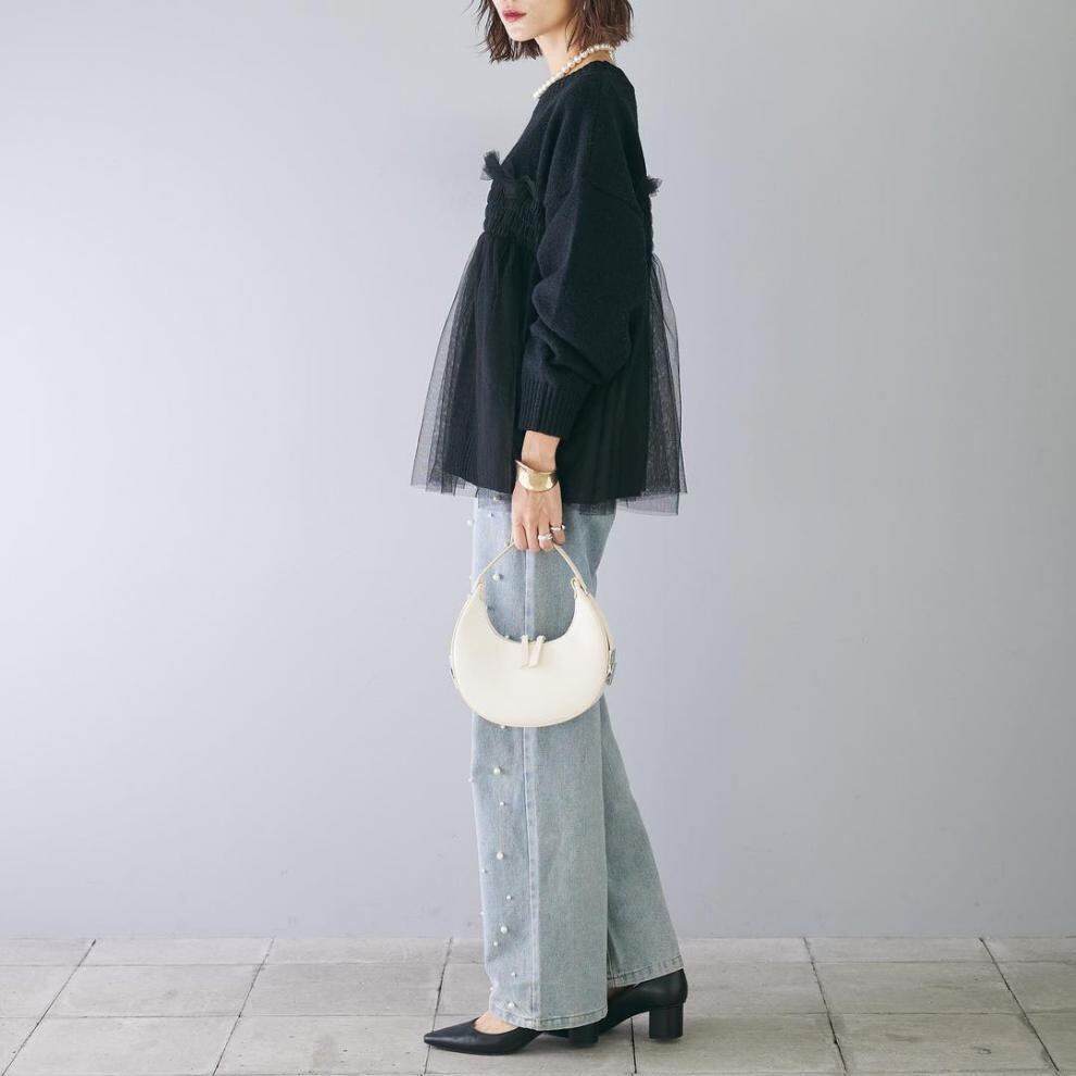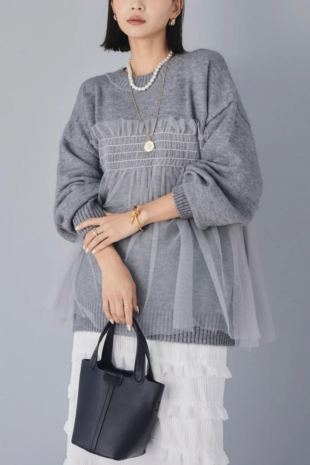 【tops】ラウンドネックチュール切り替えニットトップス3色 JY8104