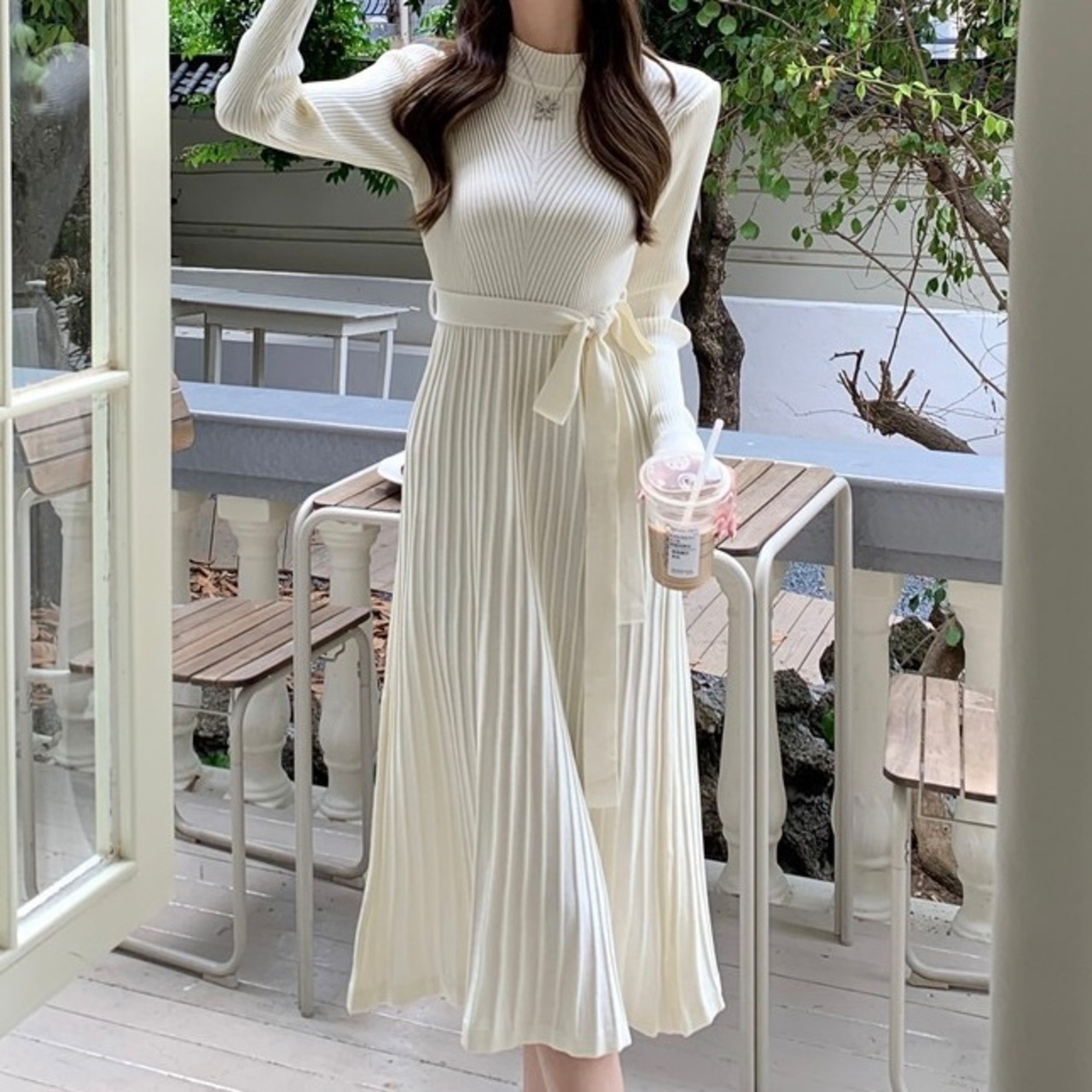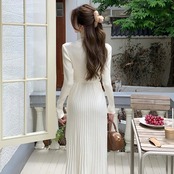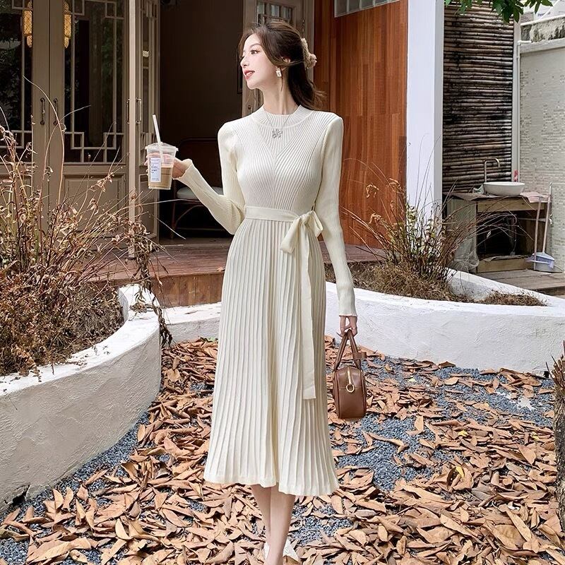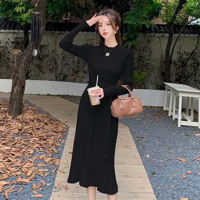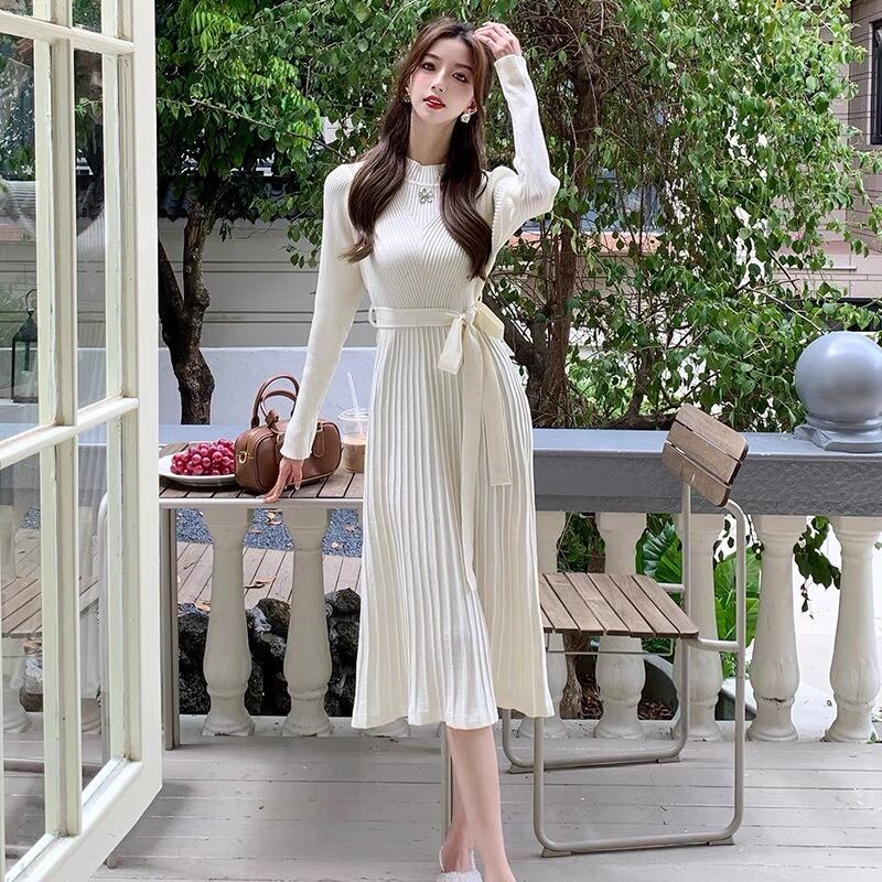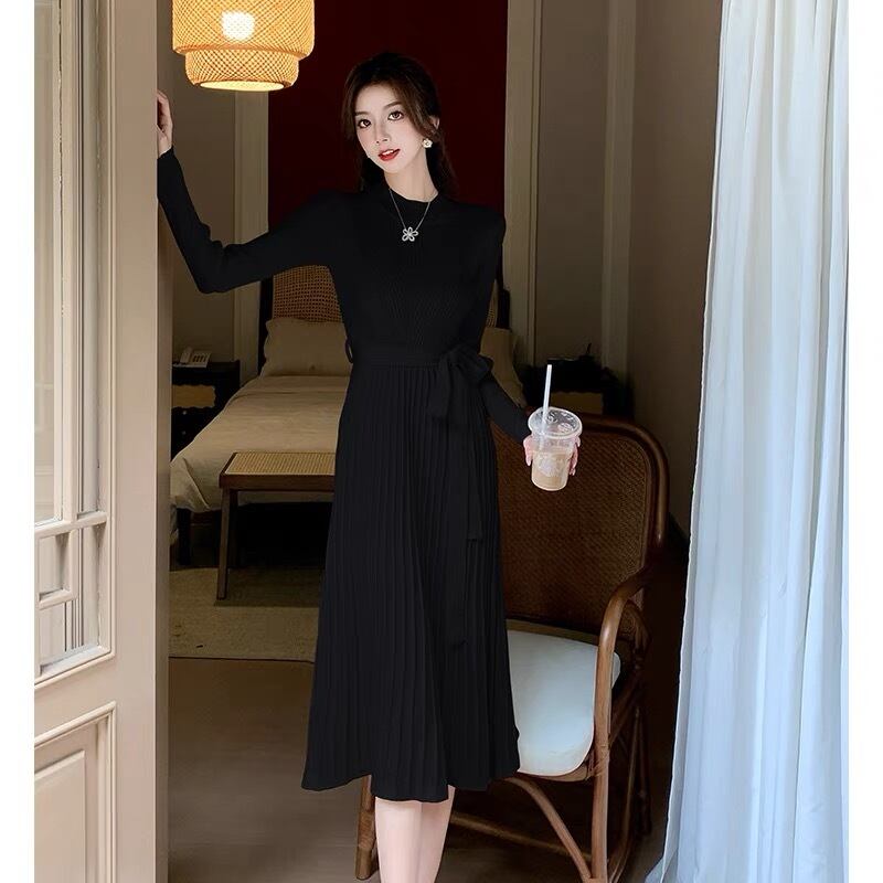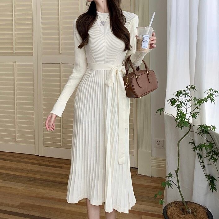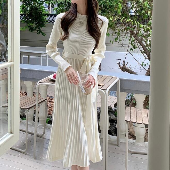 【dress】リボンベルトプリーツニットワンピース2色 OY9505