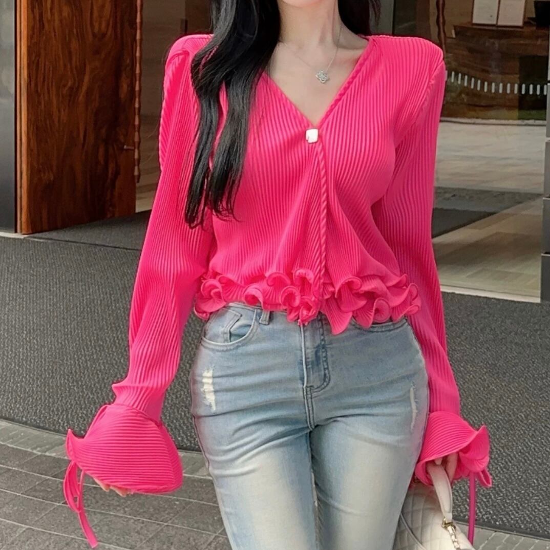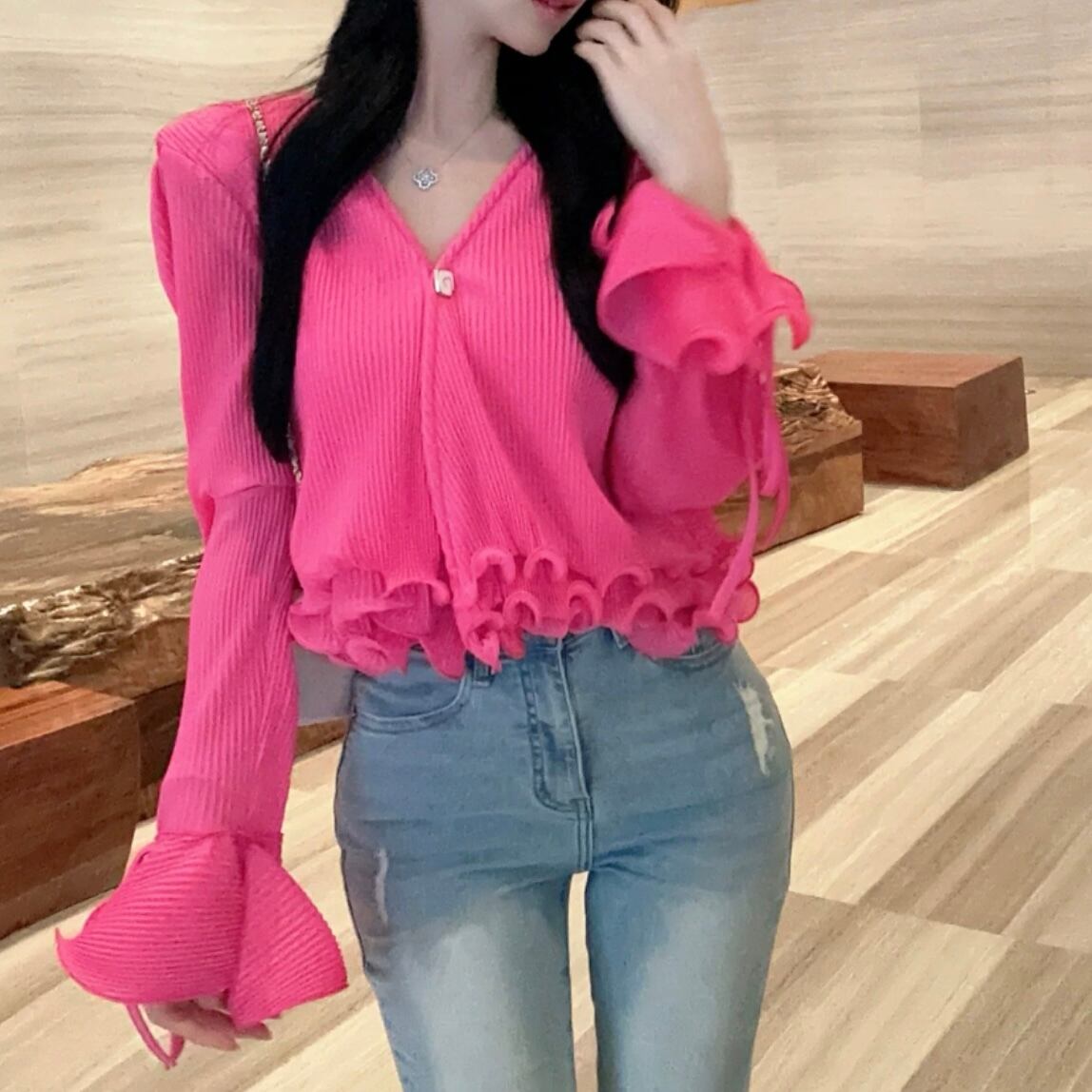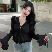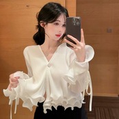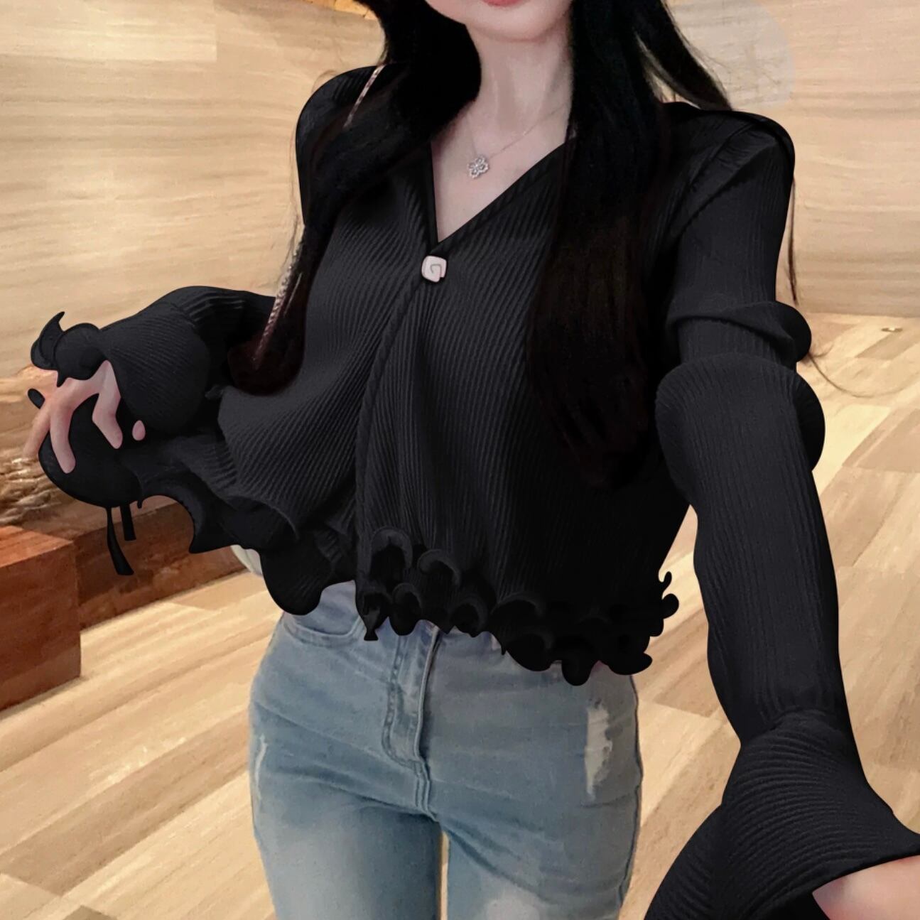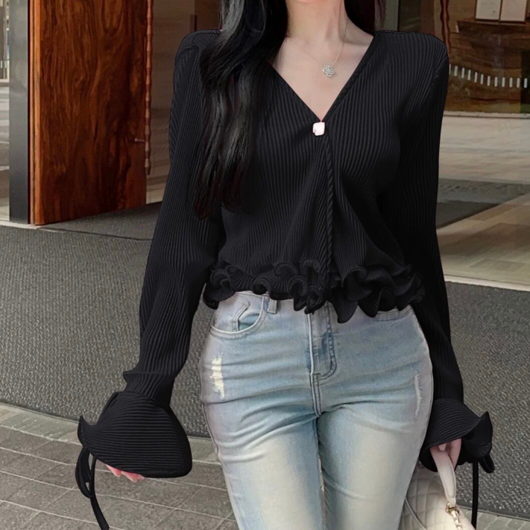 【tops】Vネック長袖フリルブラウス3色 MA0212