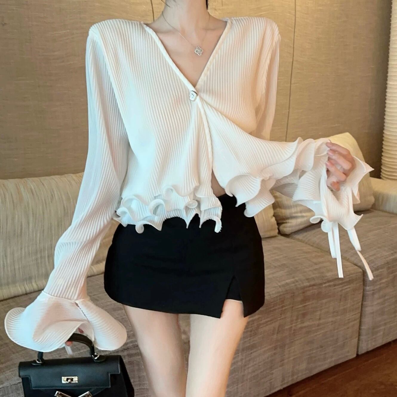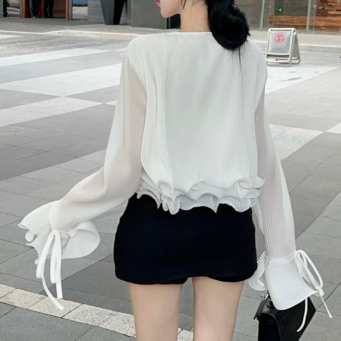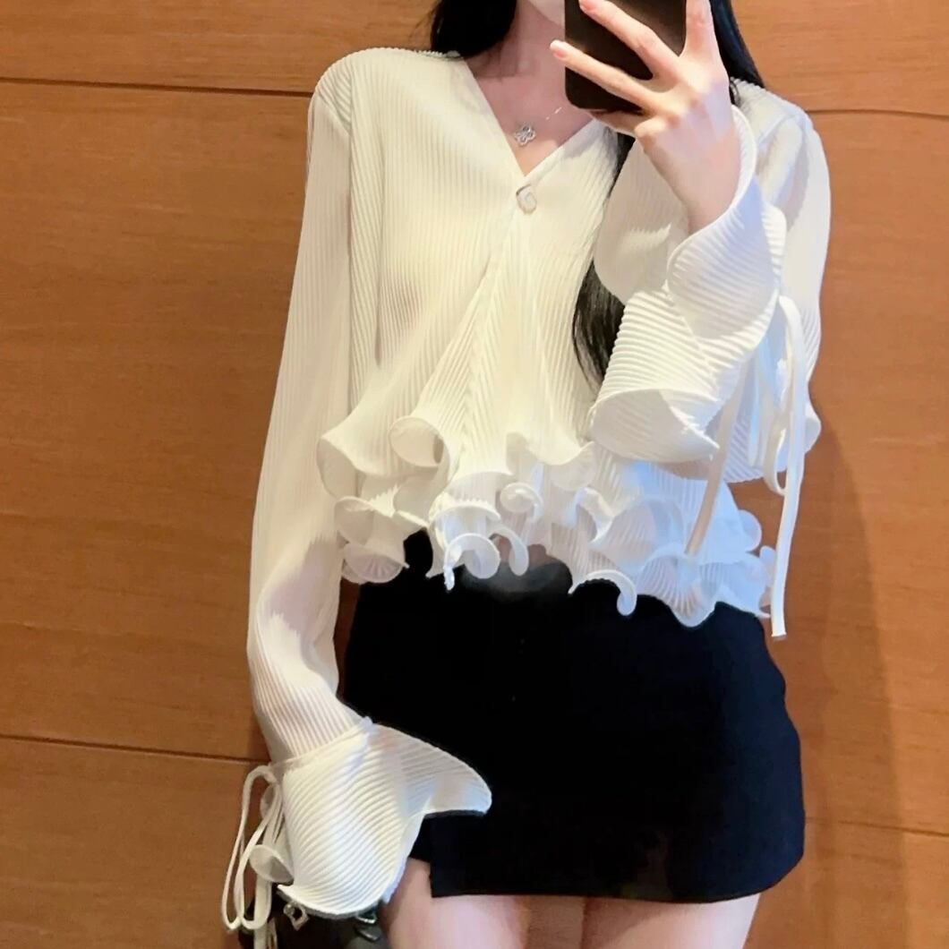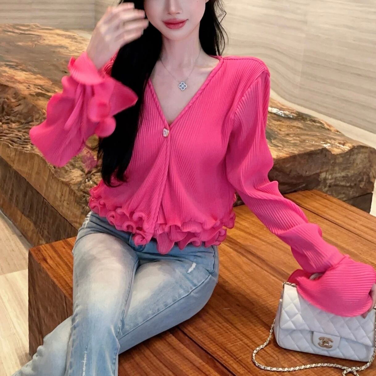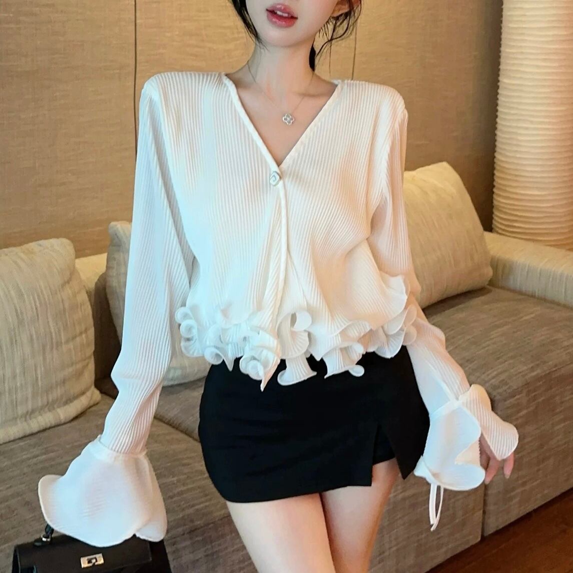 【tops】Vネック長袖フリルブラウス3色 MA0212