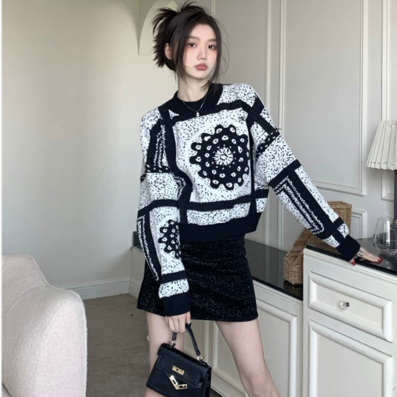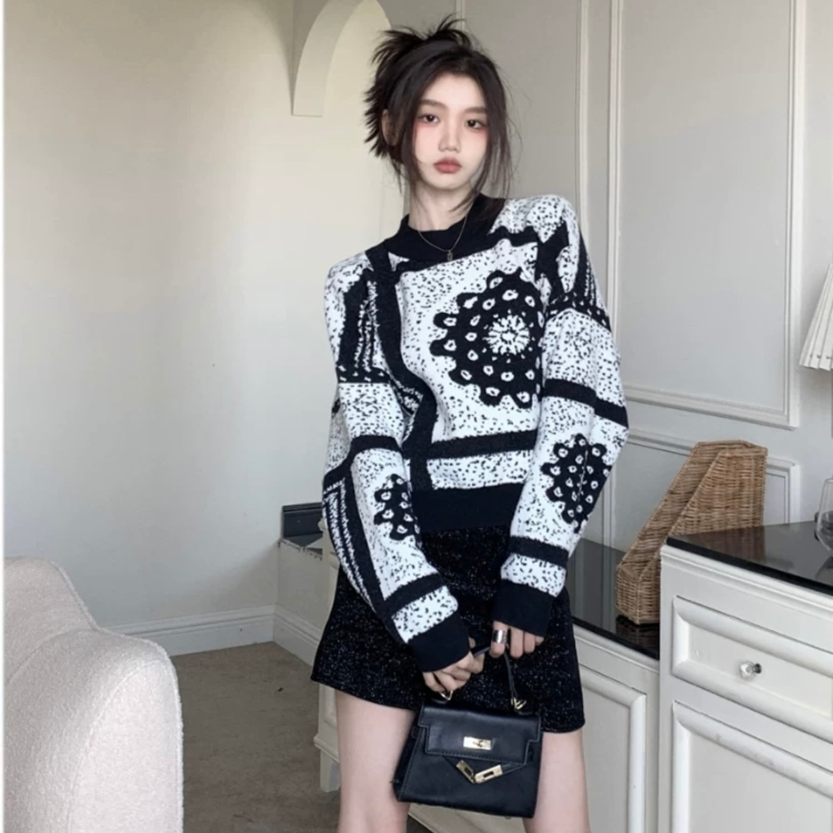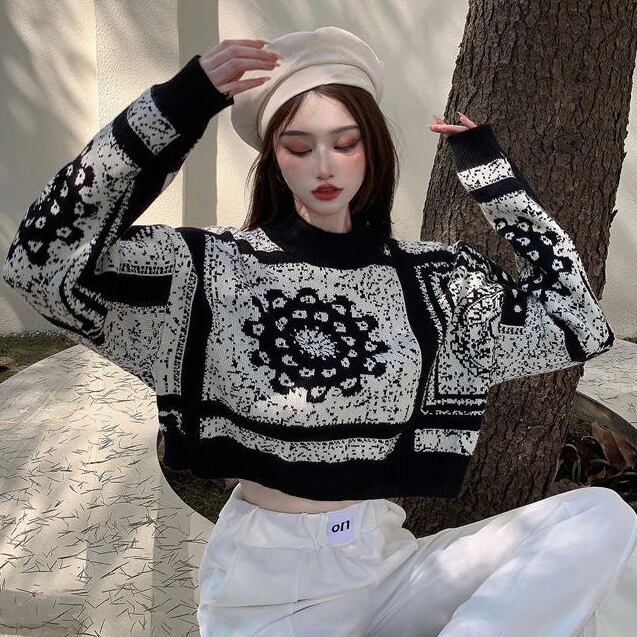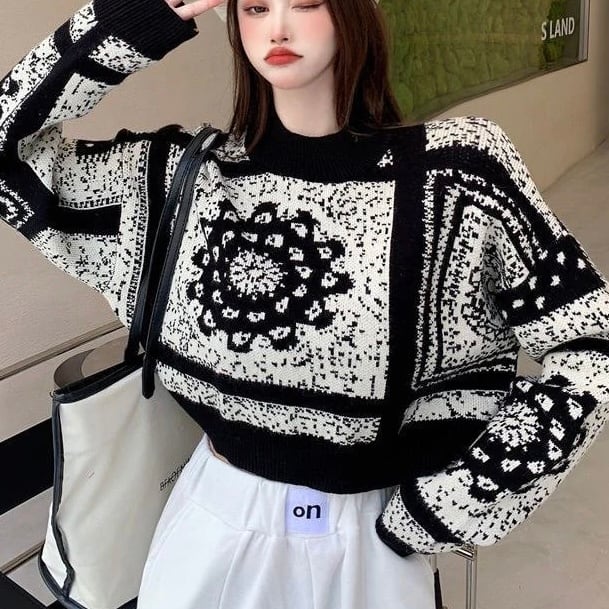 【tops】モダン柄ショート丈ニットセーター MA0219