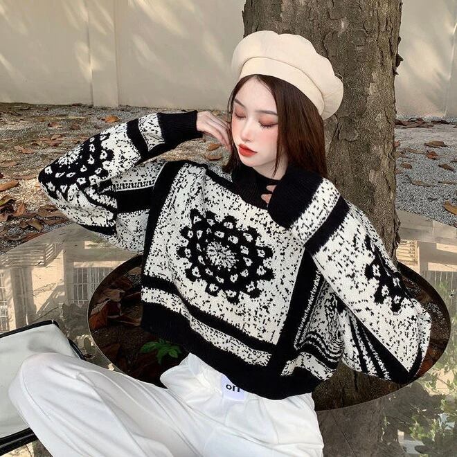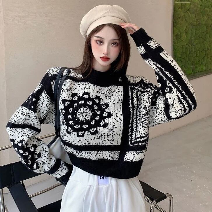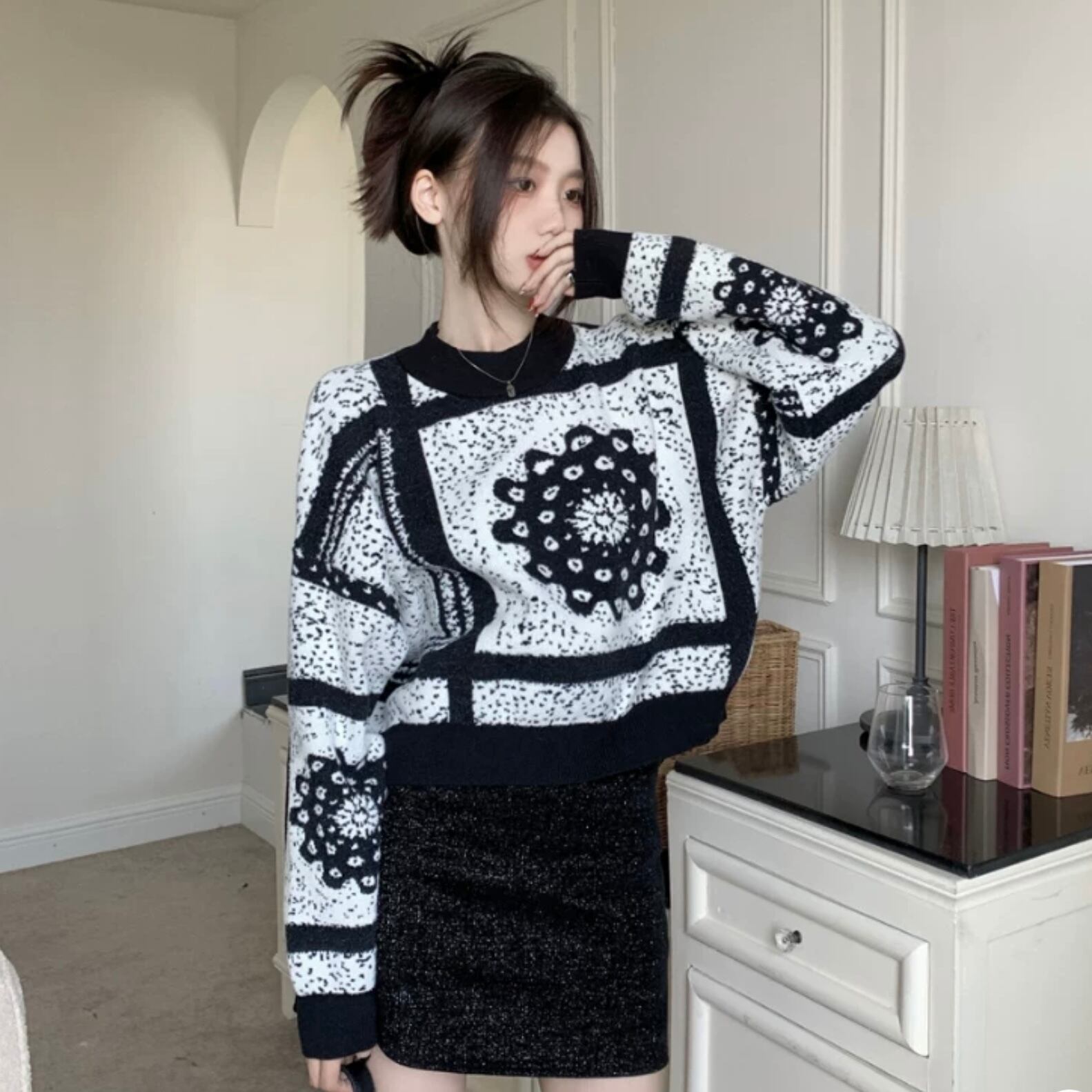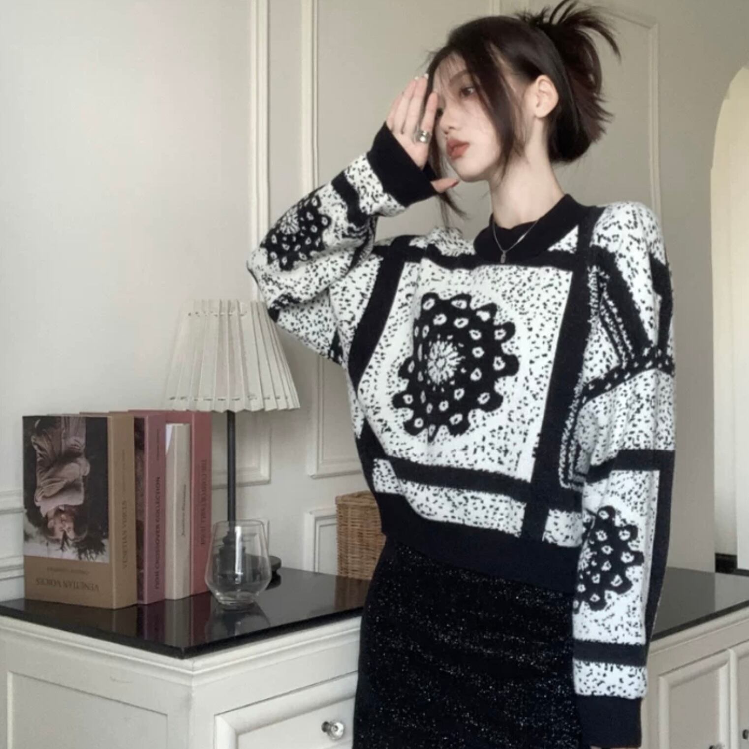 【tops】モダン柄ショート丈ニットセーター MA0219