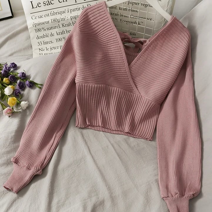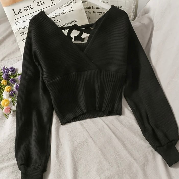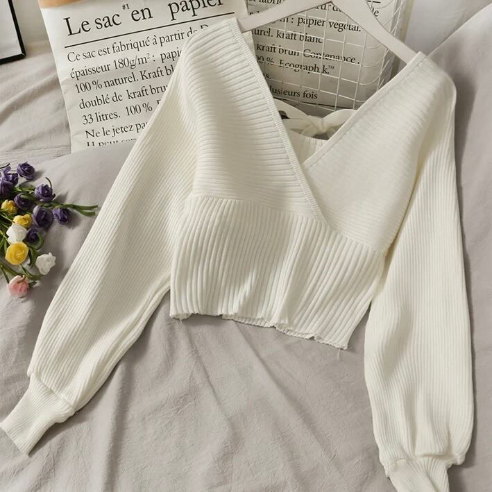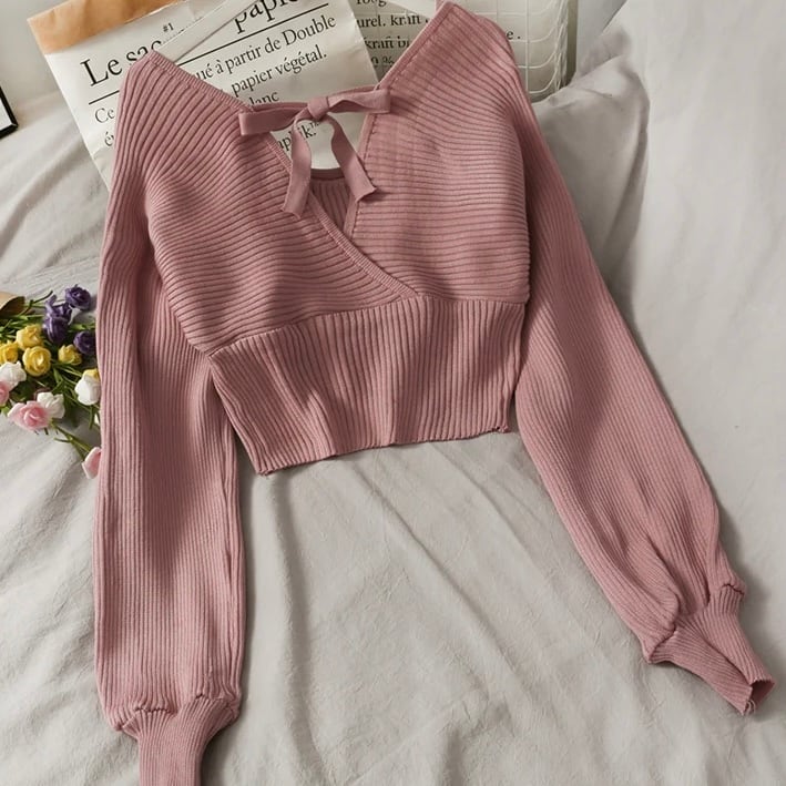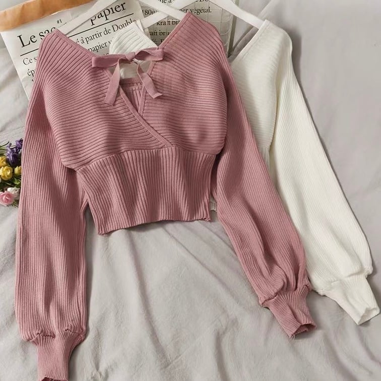 【tops】Vネック長袖リボンニットセーター 3色 MA0227