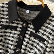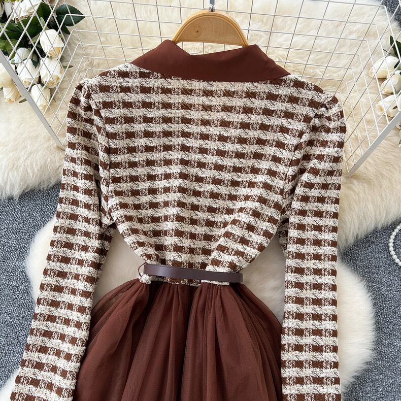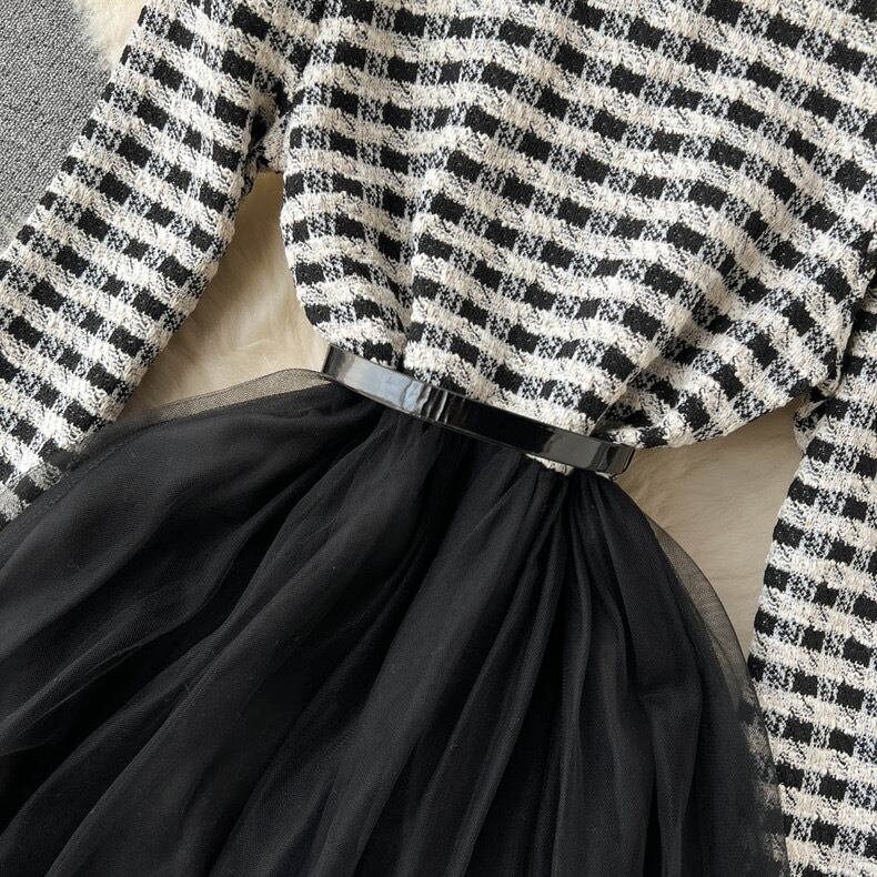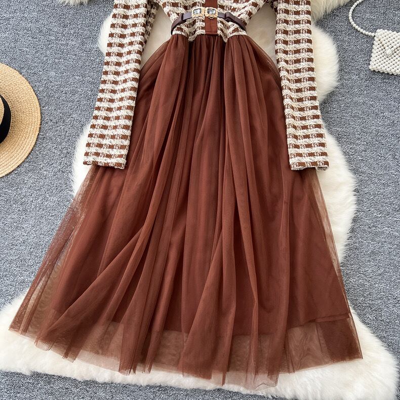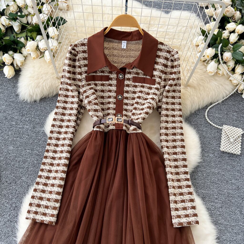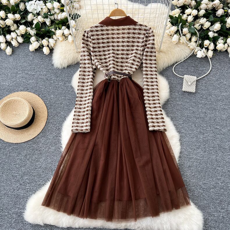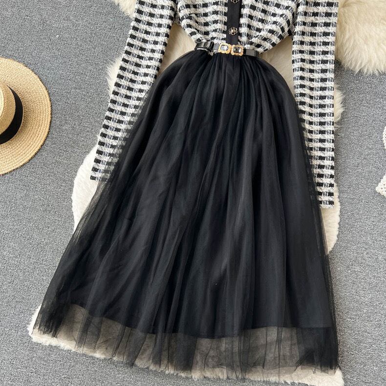 【dress】S〜2XLチュール切り替え長袖ワンピース XT9266