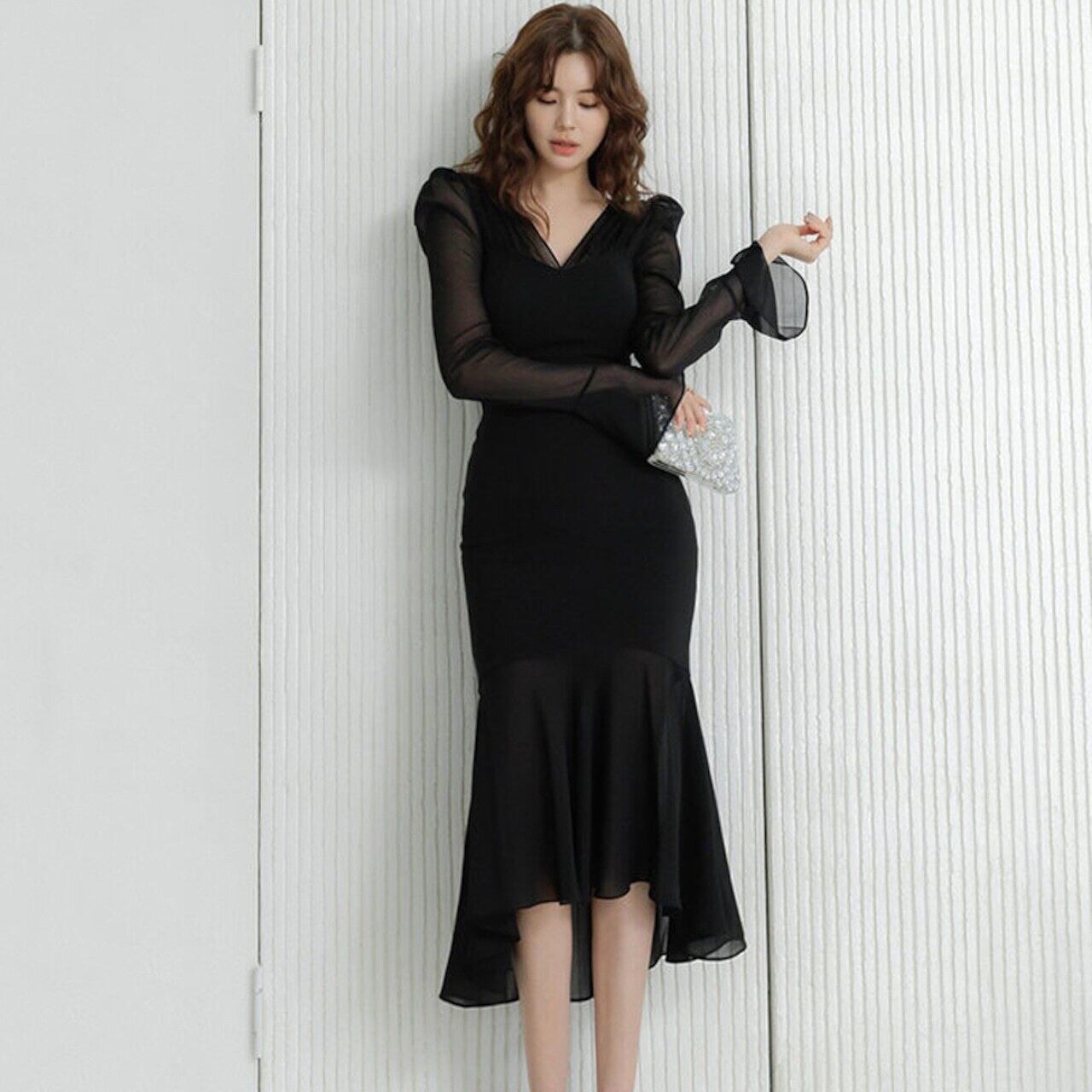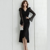 【dress】エレガントVネックフリルロングドレス MA0345