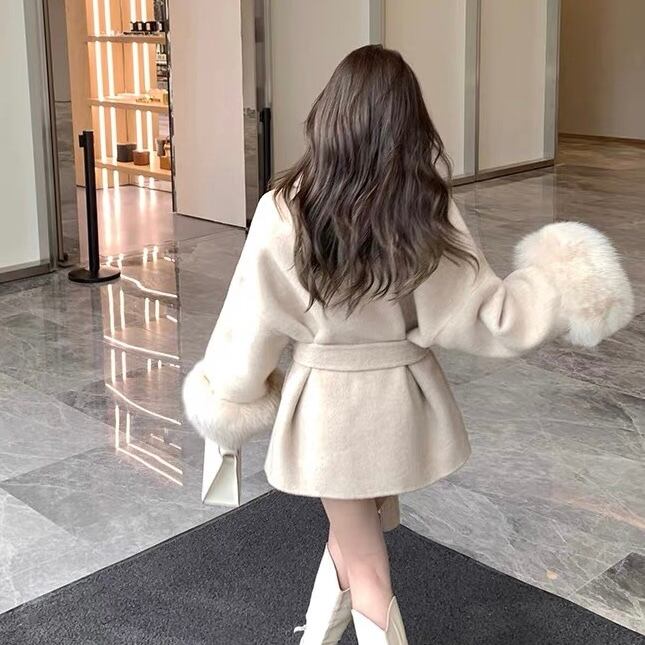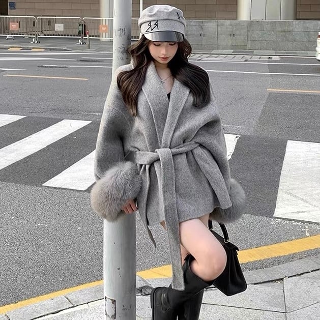 【outer】リボンベルト付き袖ファーコート3色 SY1093