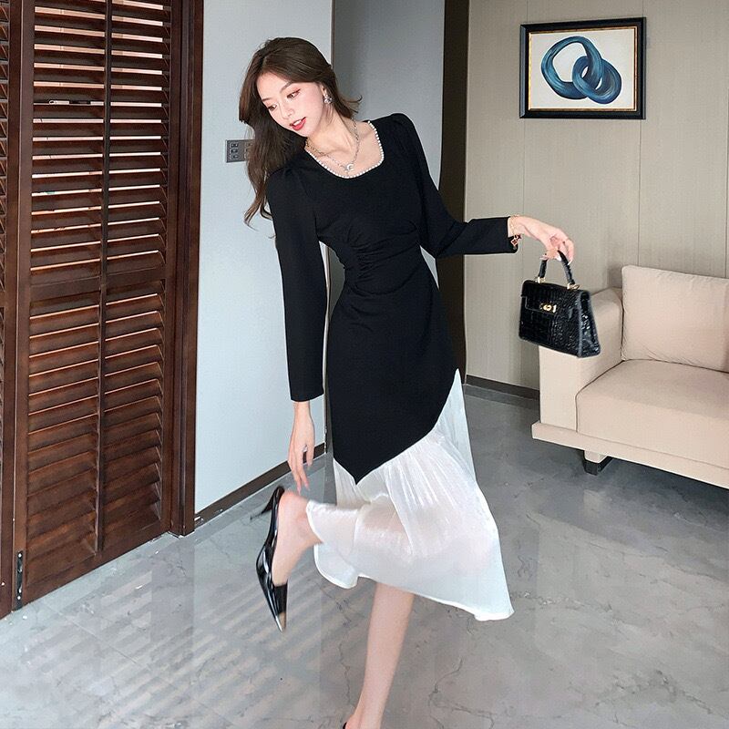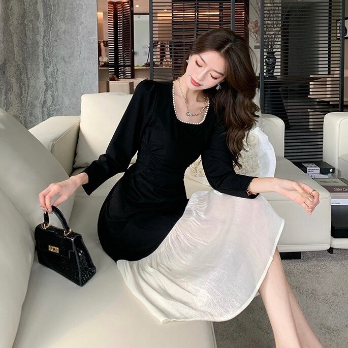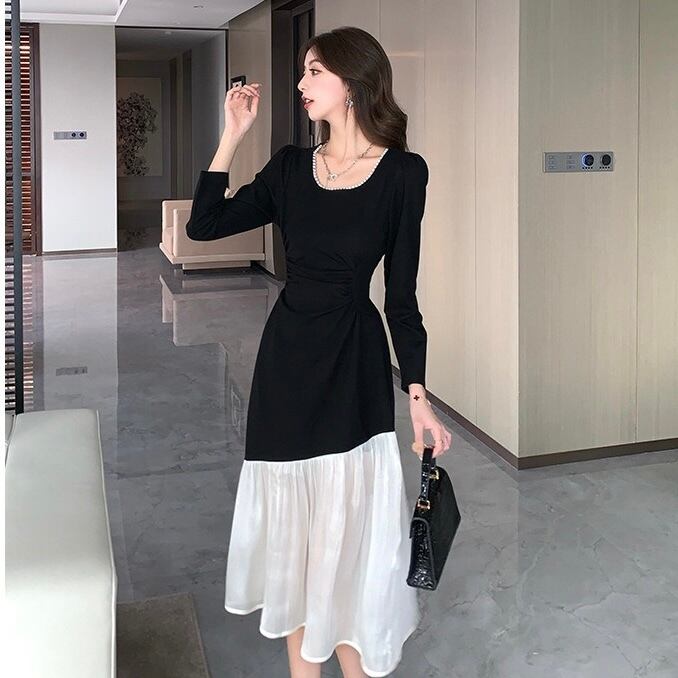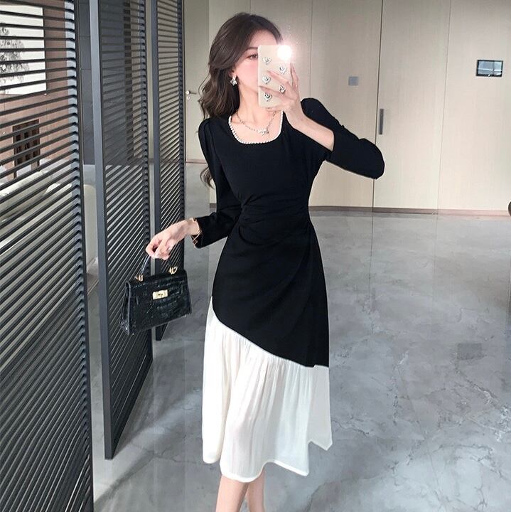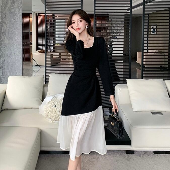 【dress】配色スクエアネックフレア長袖ワンピース IR1004