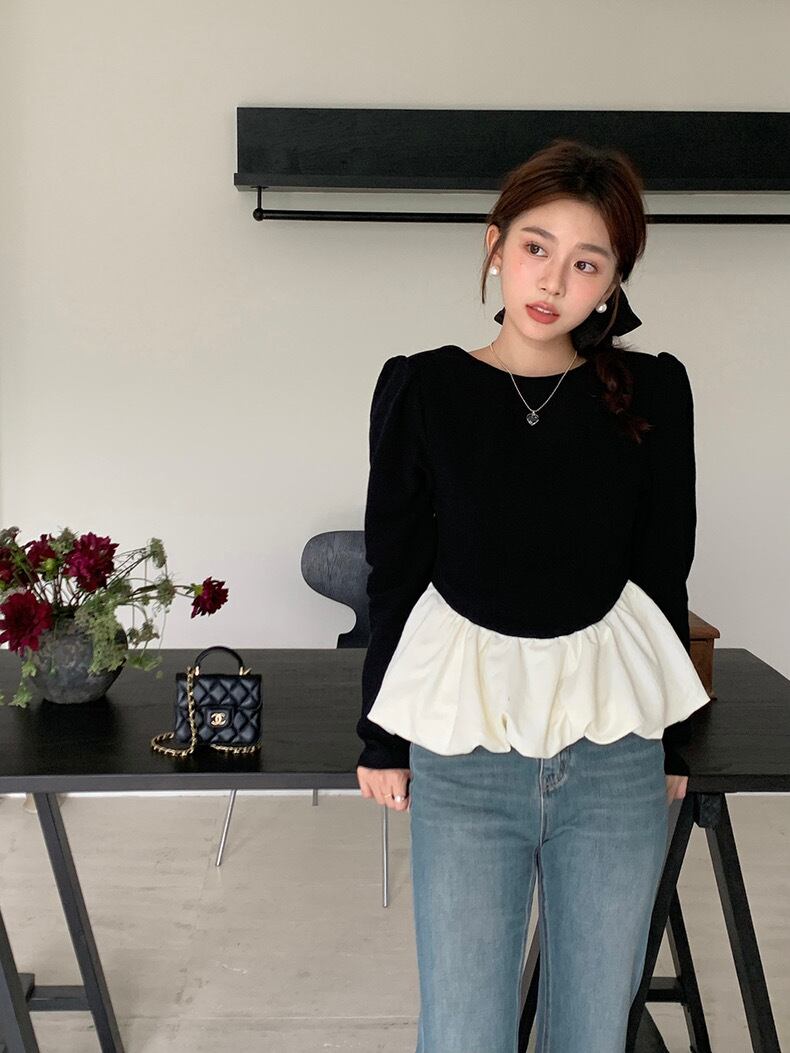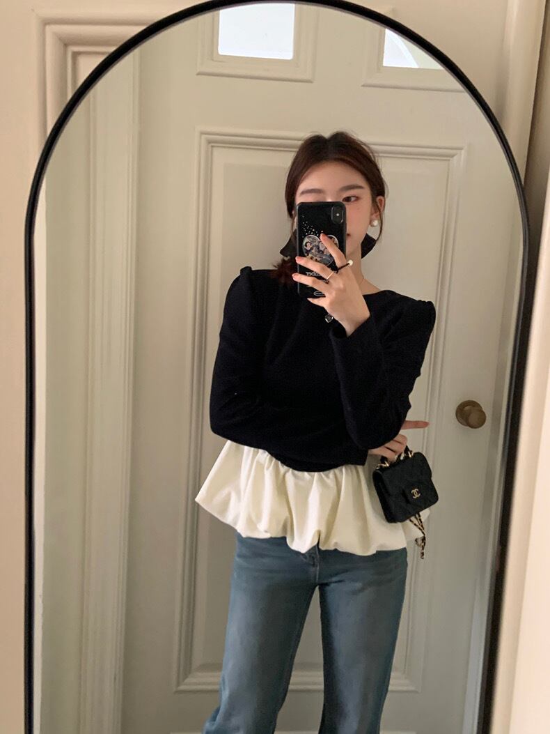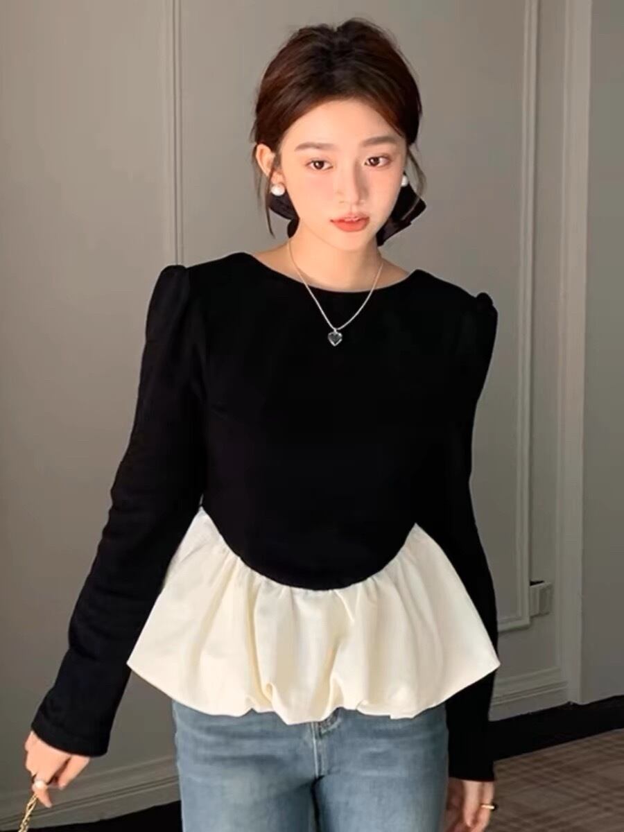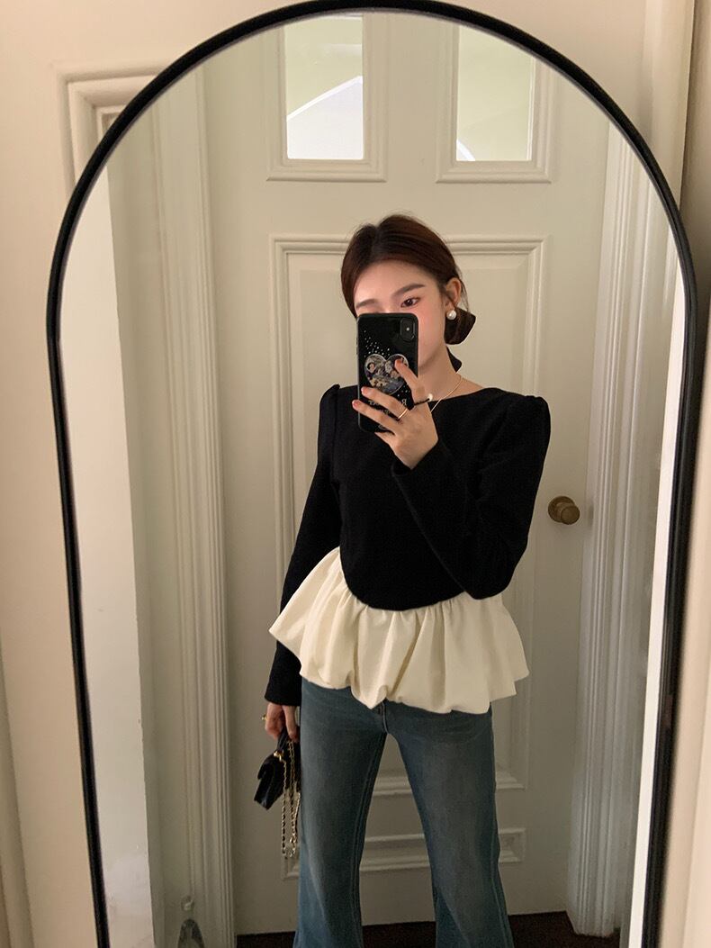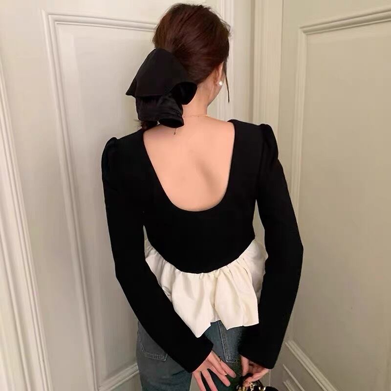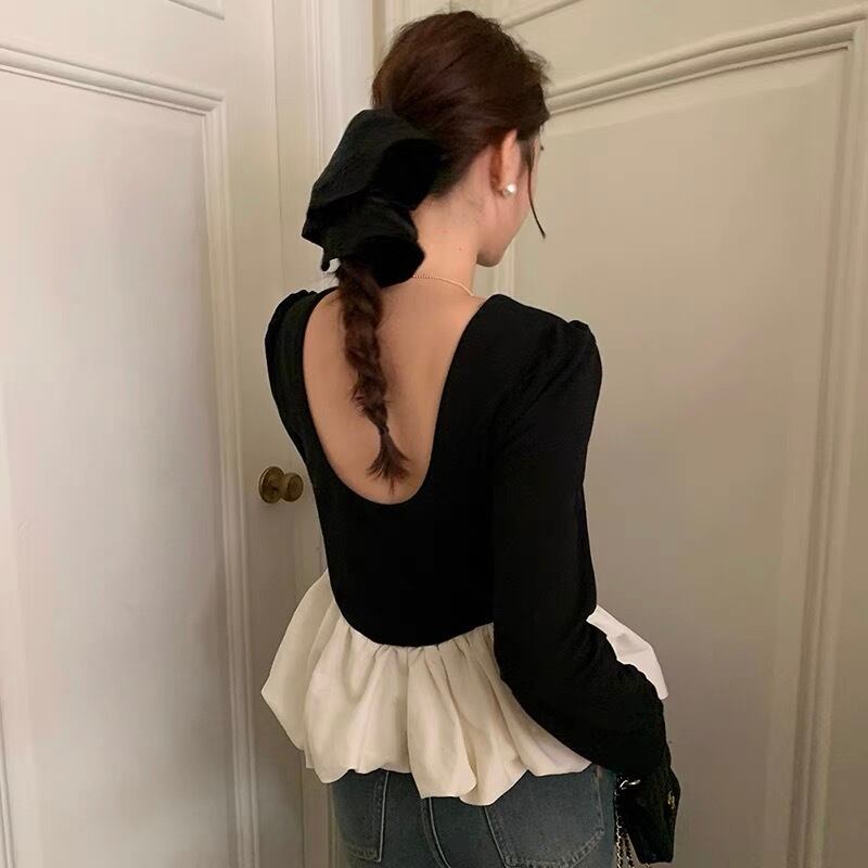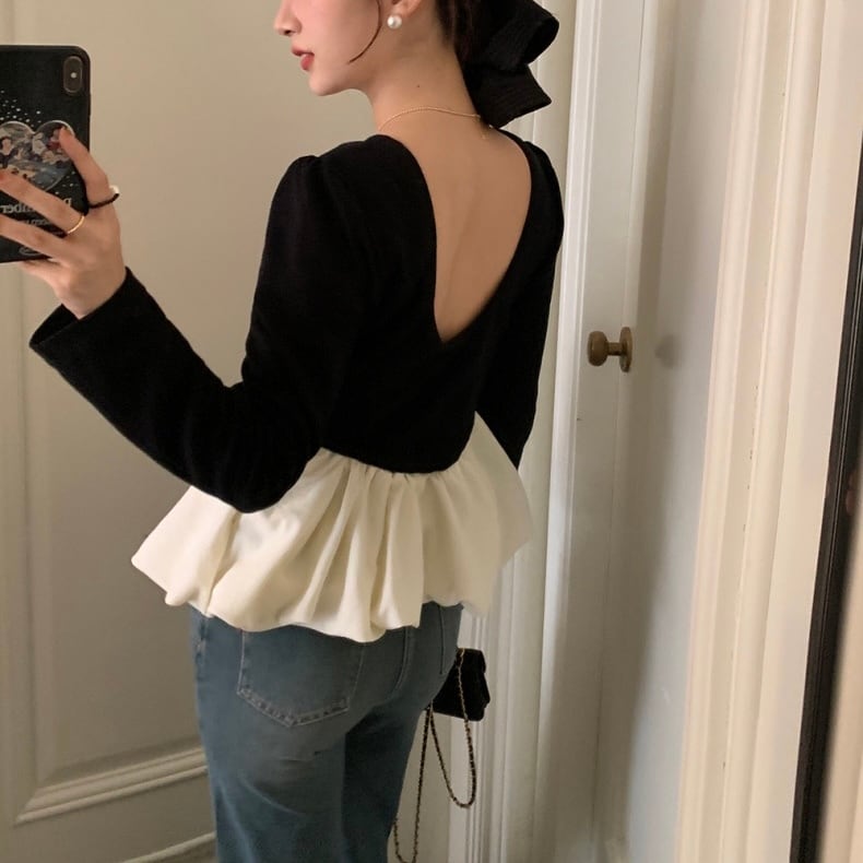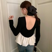 【tops】ぺプラムバックオープン配色長袖トップス PX1005
