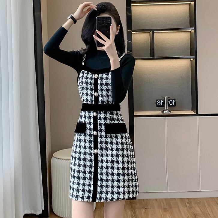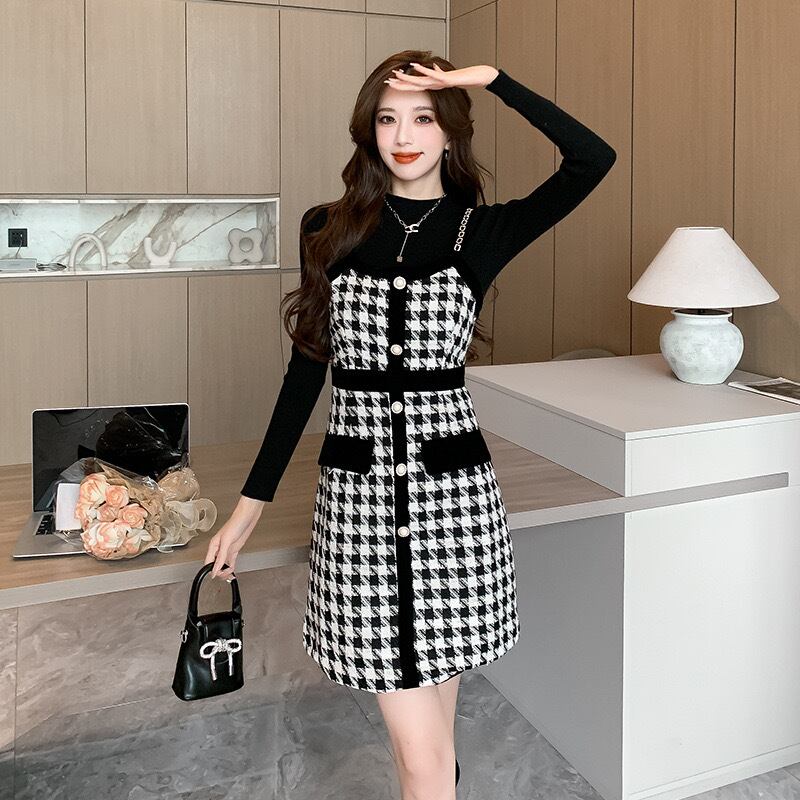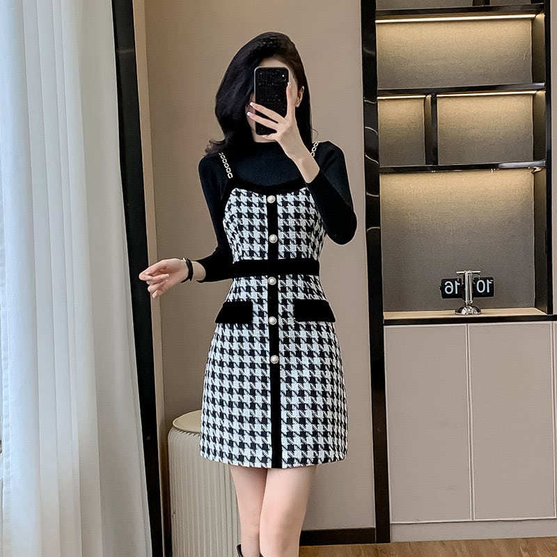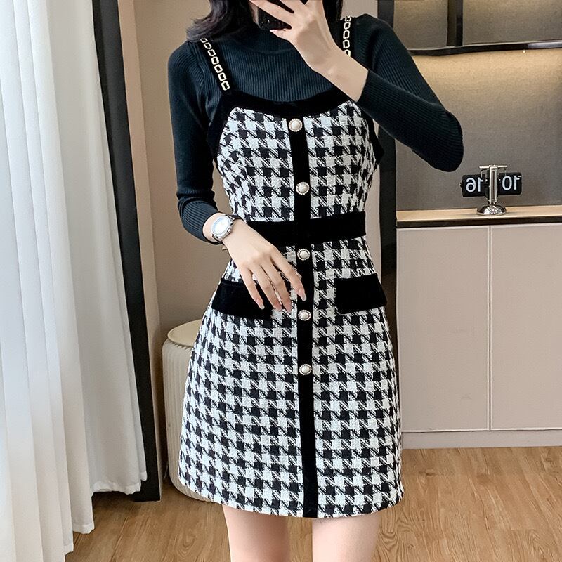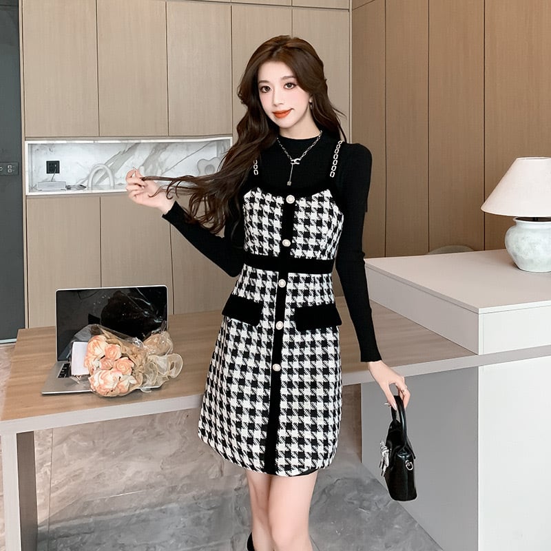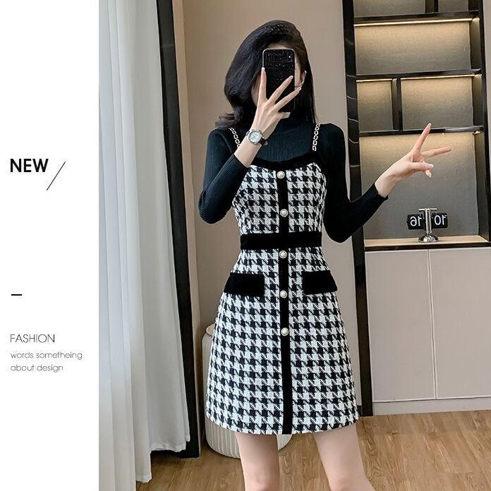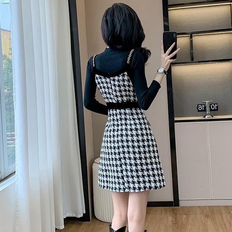 【set】S〜2XLニットトップスx千鳥柄キャミワンピース OC1207