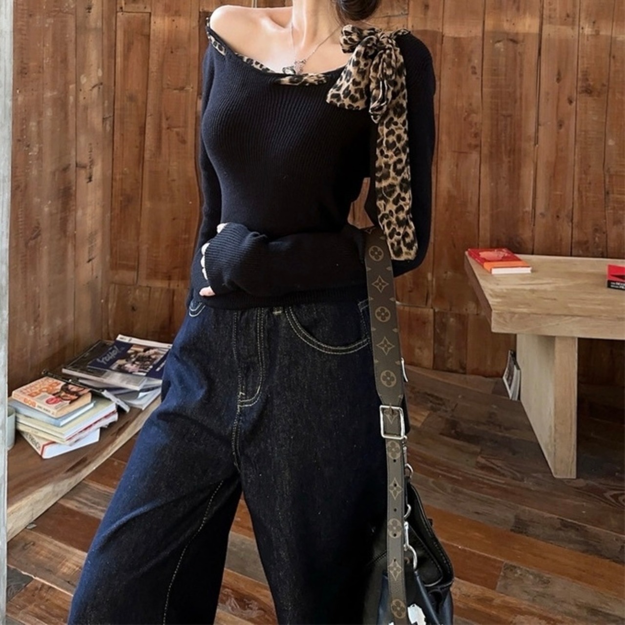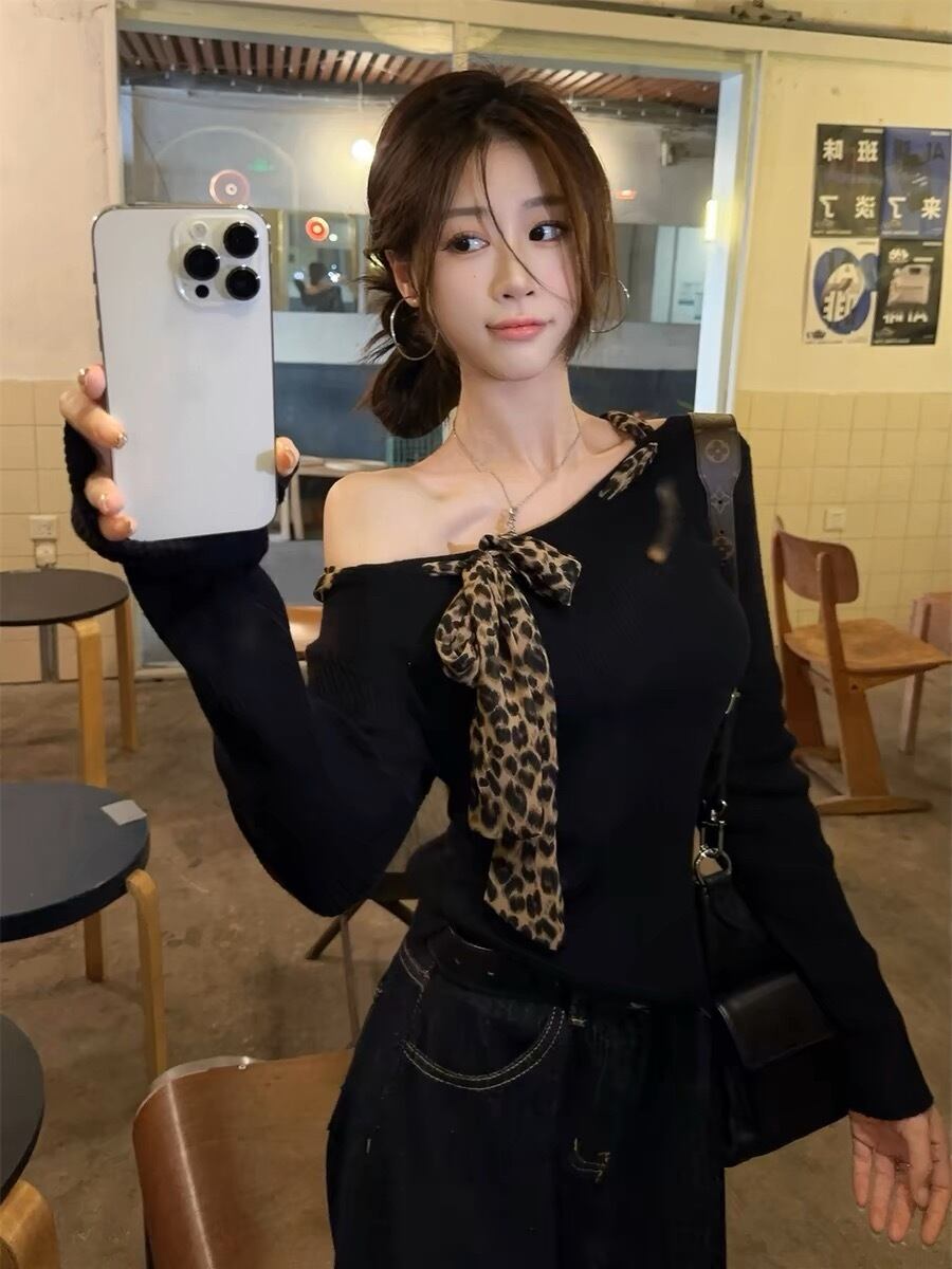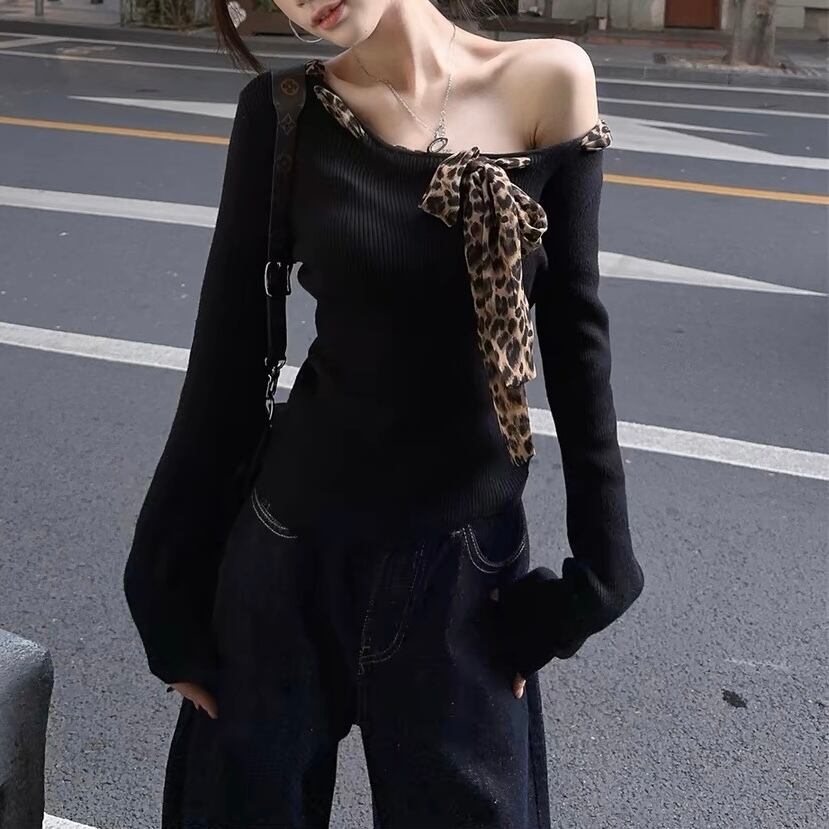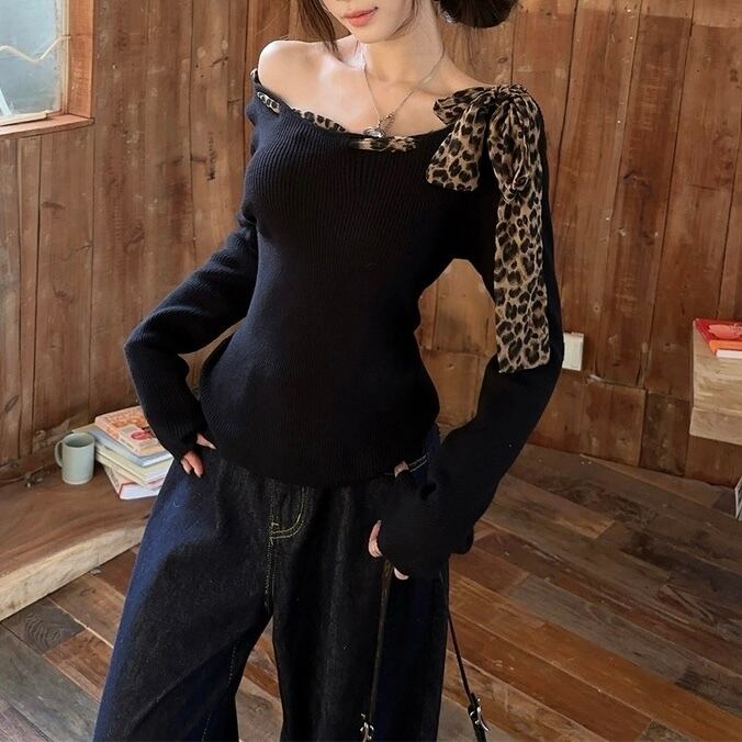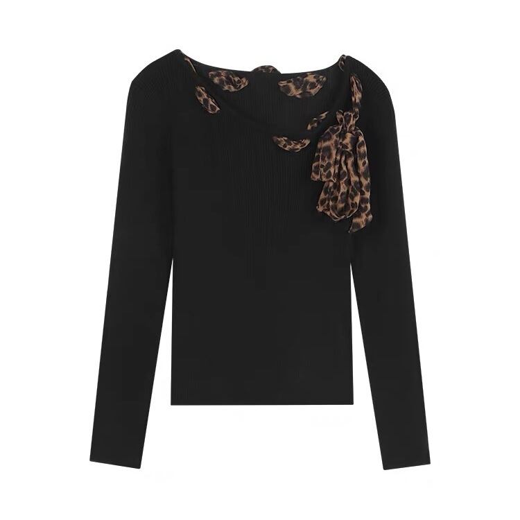 【tops】ヒョウ柄リボンニットトップス NR1504