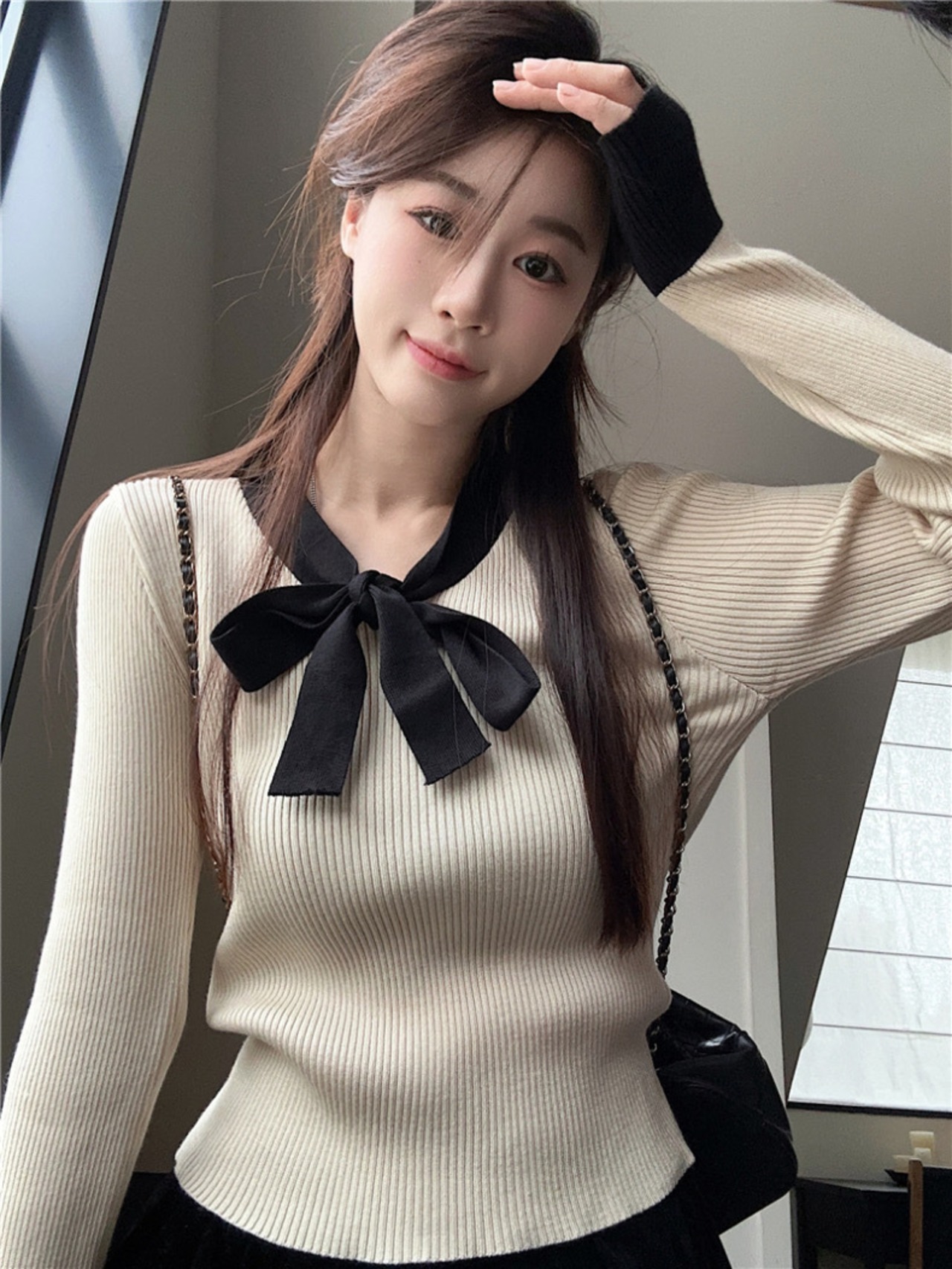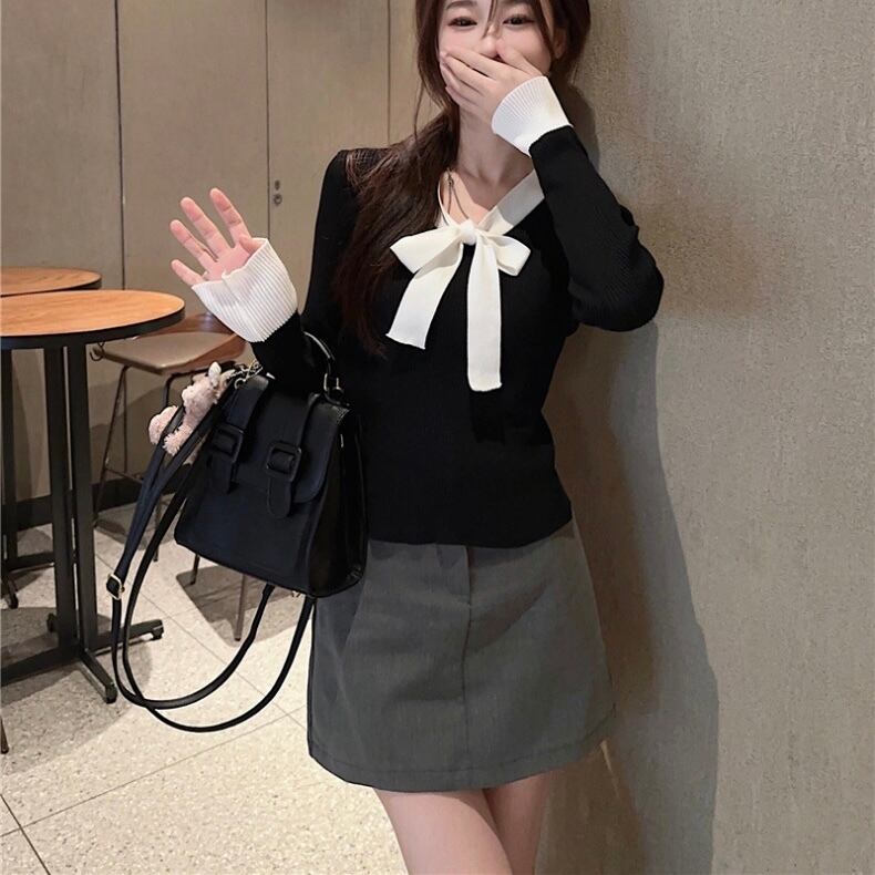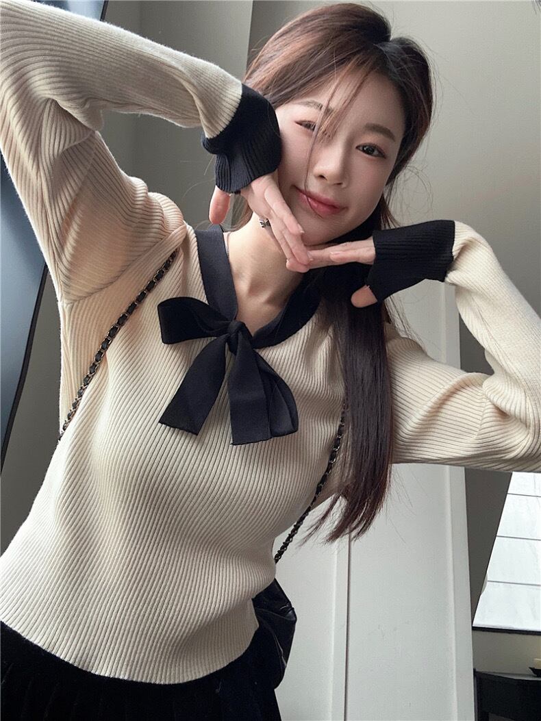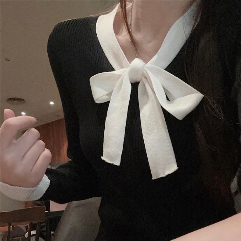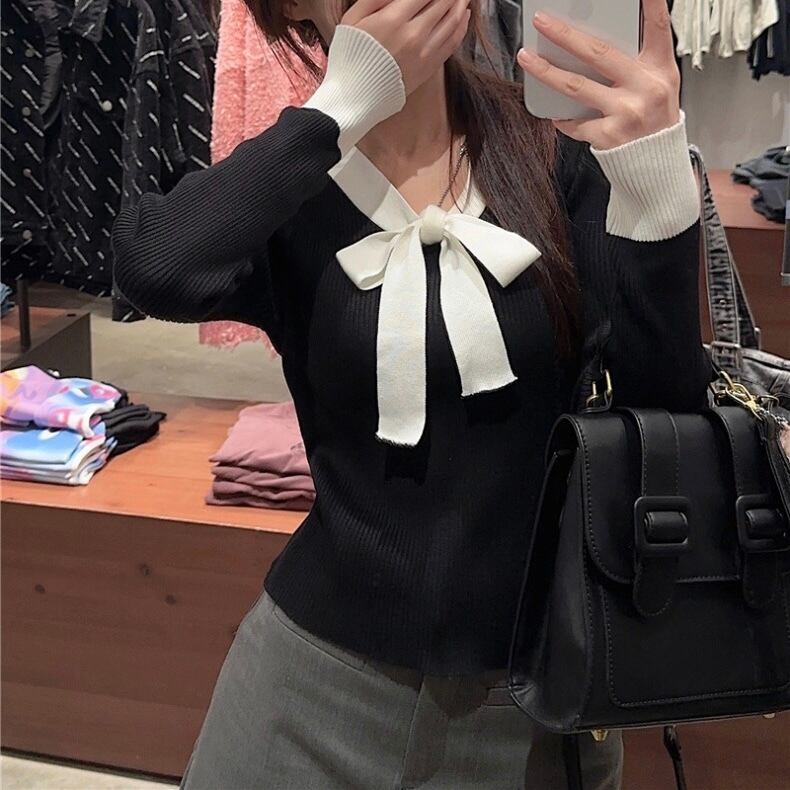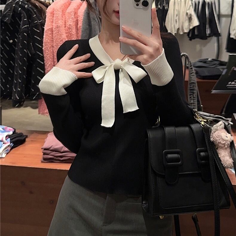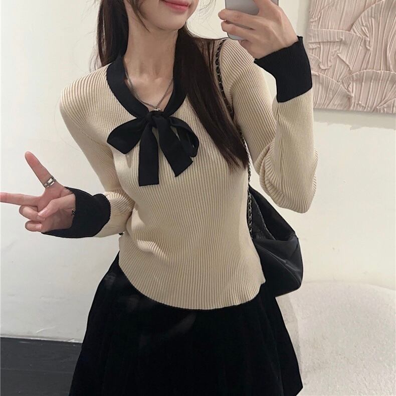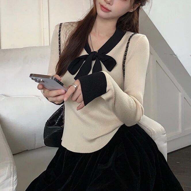 【tops】リボン配色リブニットトップス2色 SY10215