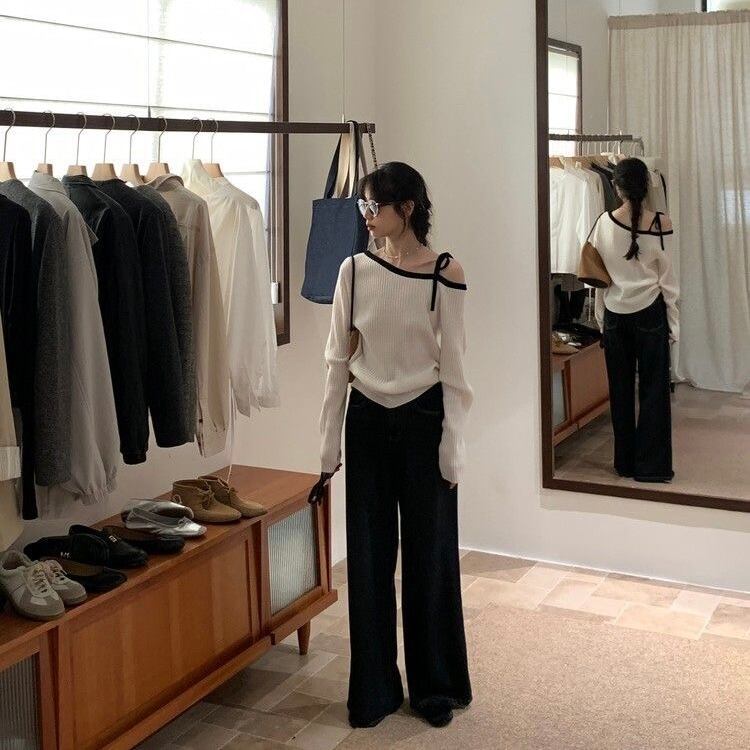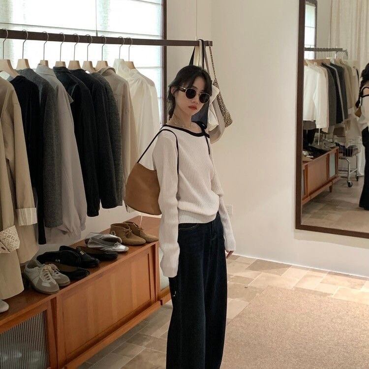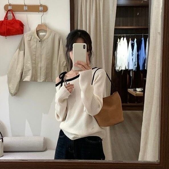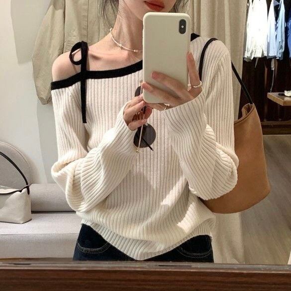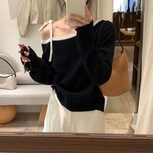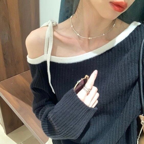【tops】オフショルダー配色ニットトップス2色 ID10251