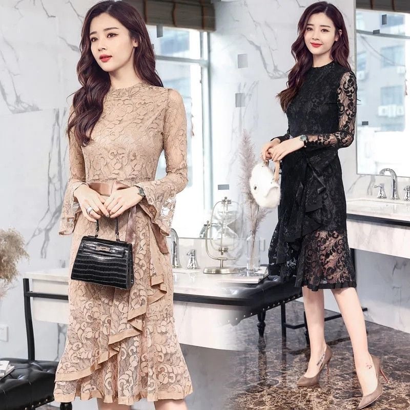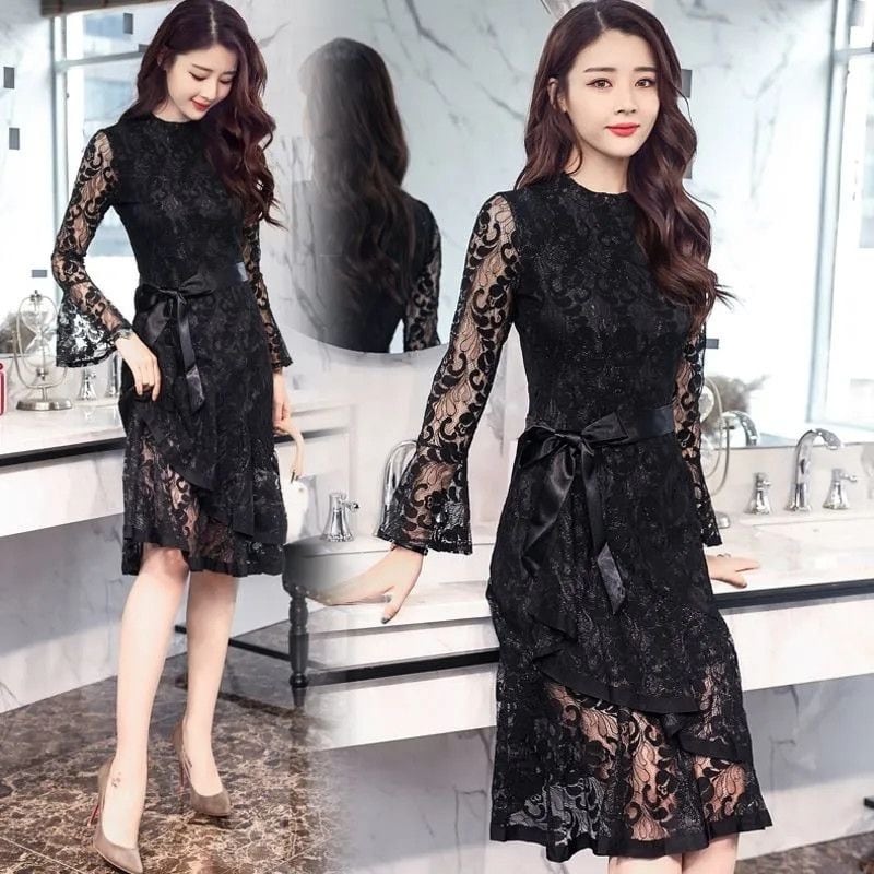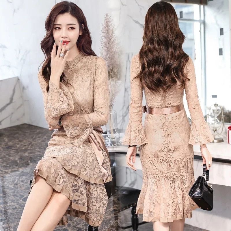 【dress】マーメイド長袖レースワンピース2色 PX10296