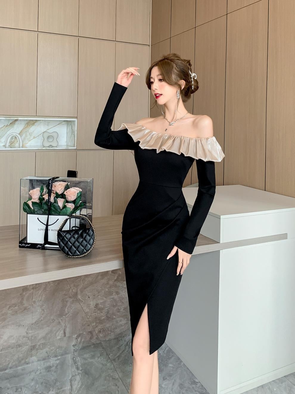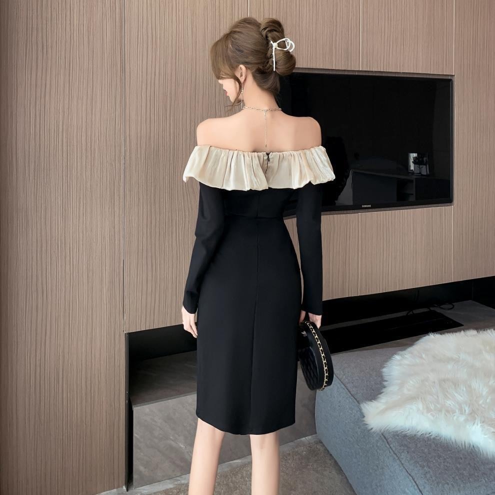 【dress】オフショルダースリット入りドレスワンピース IB11093