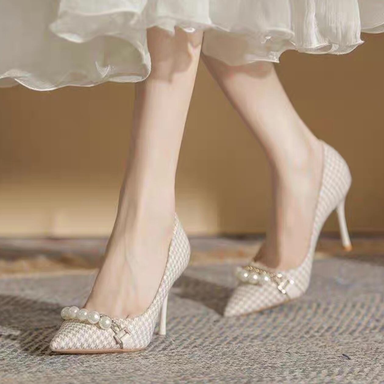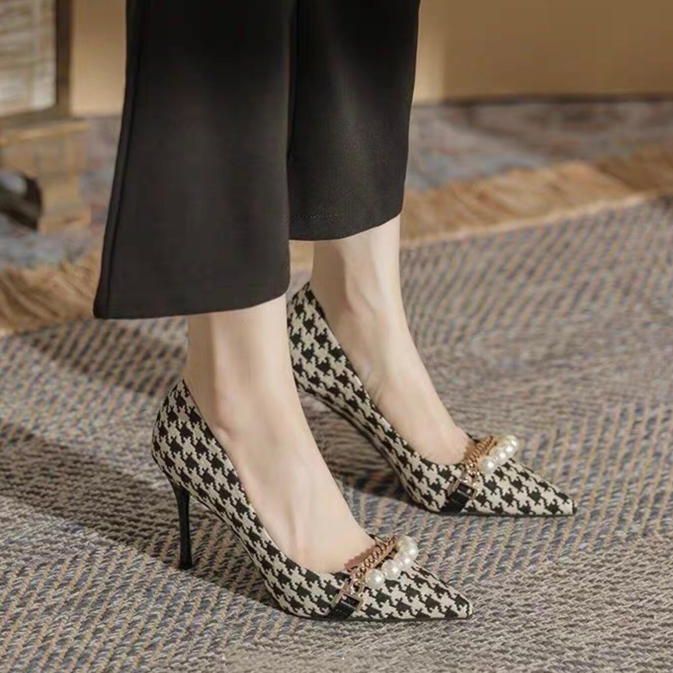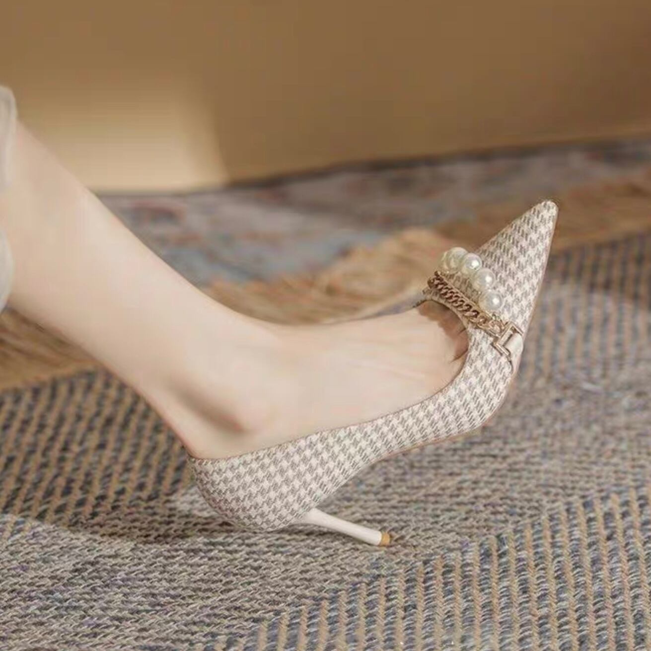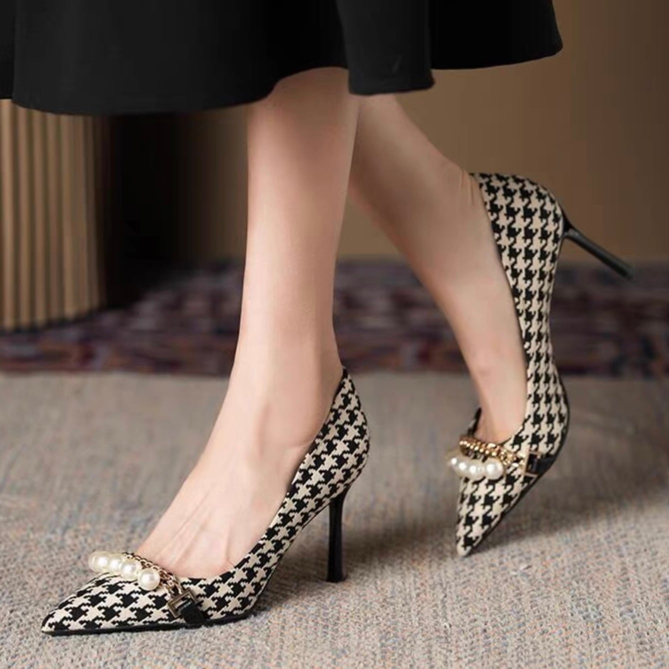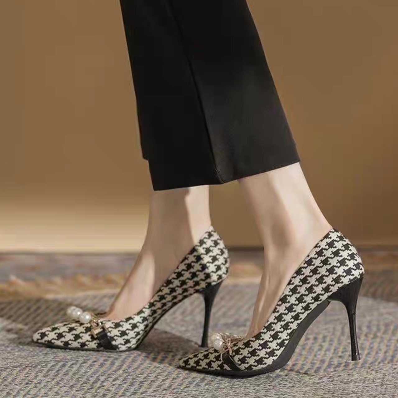 【shoes】パール付き千鳥格子ピンヒールパンプス2色 YR0103