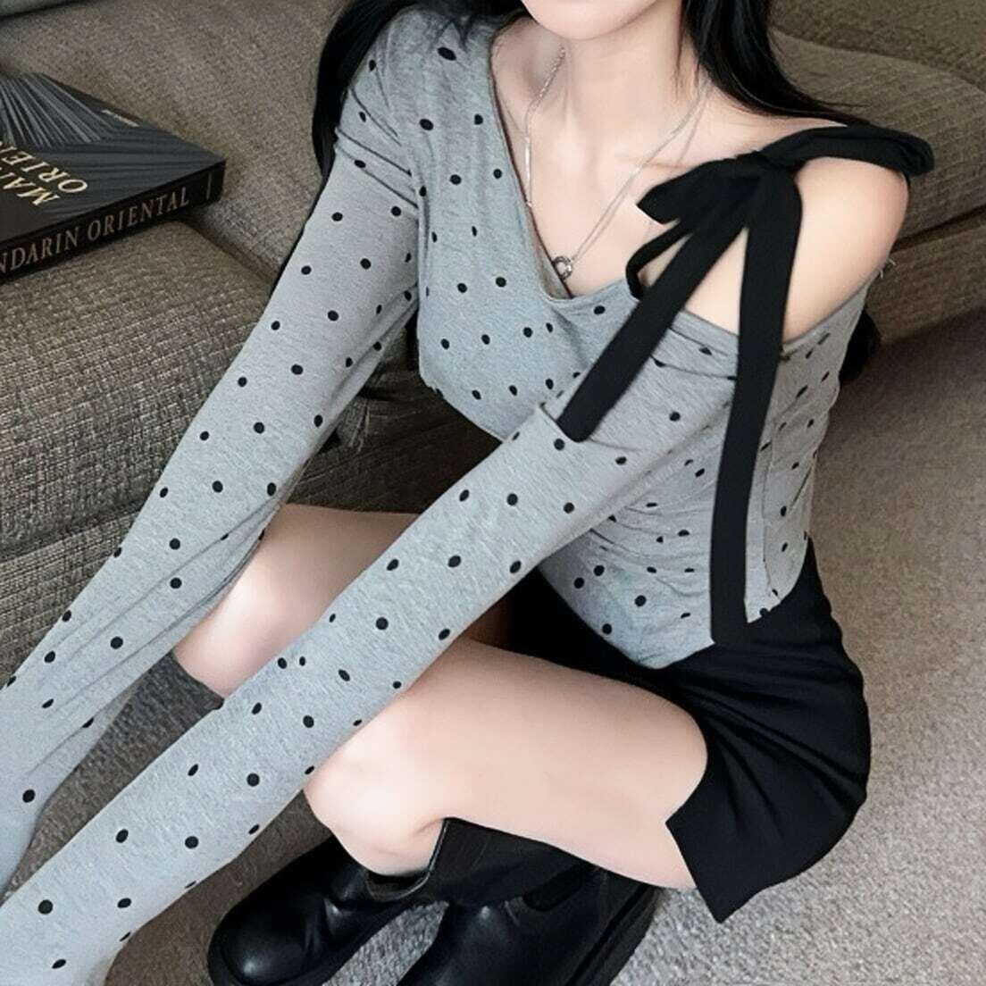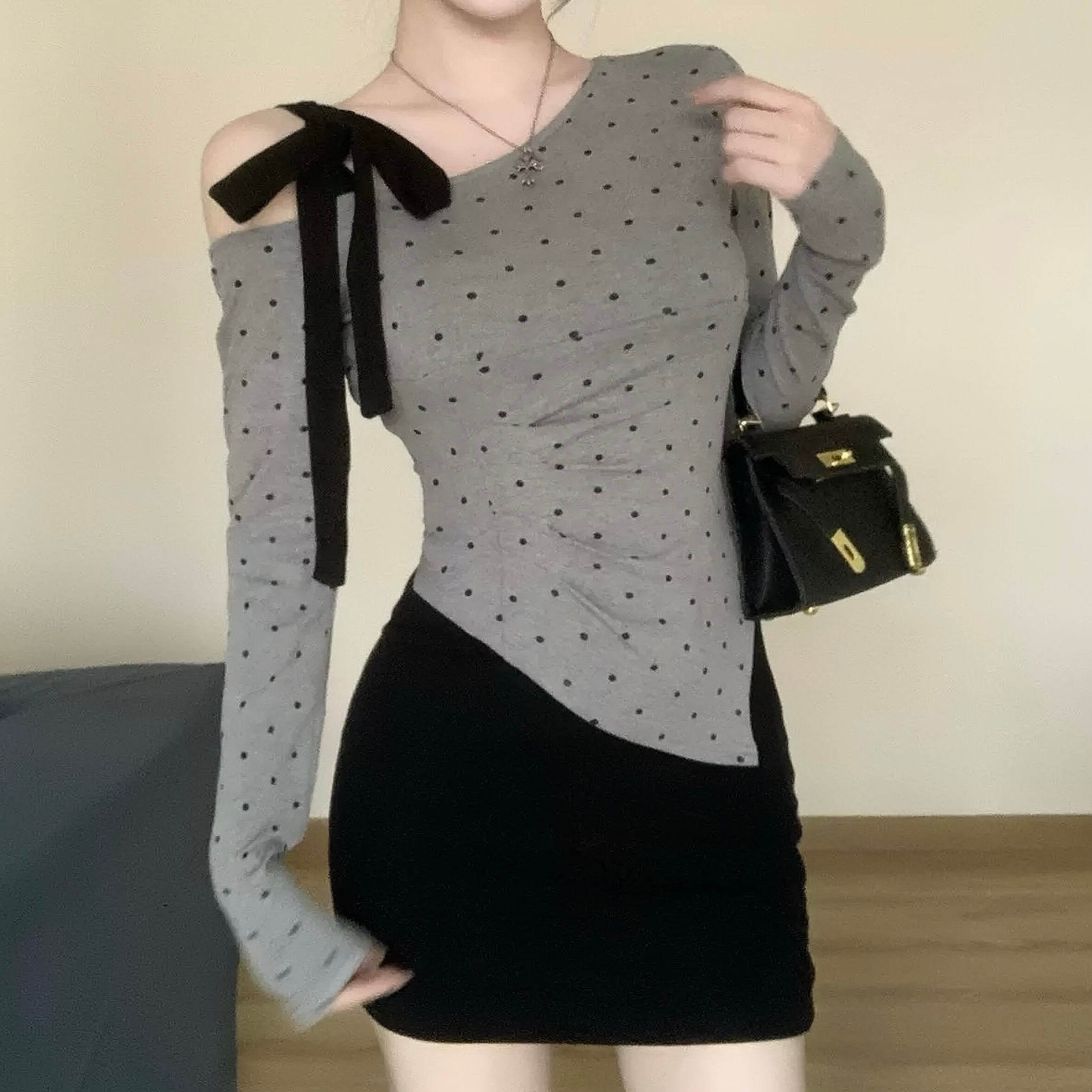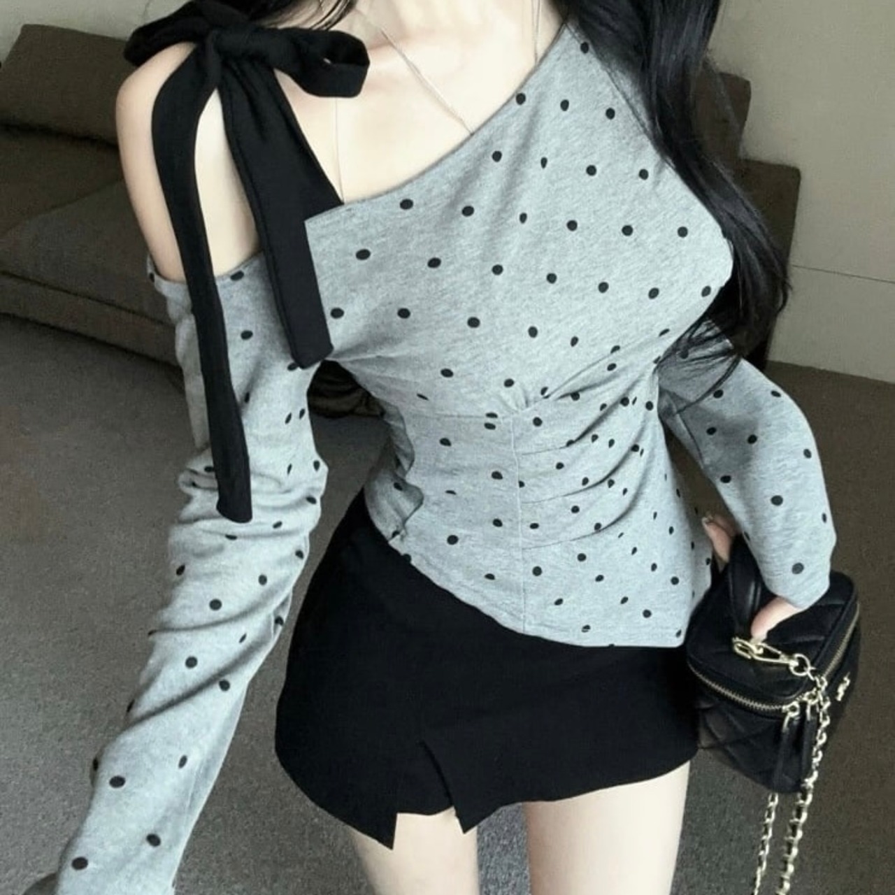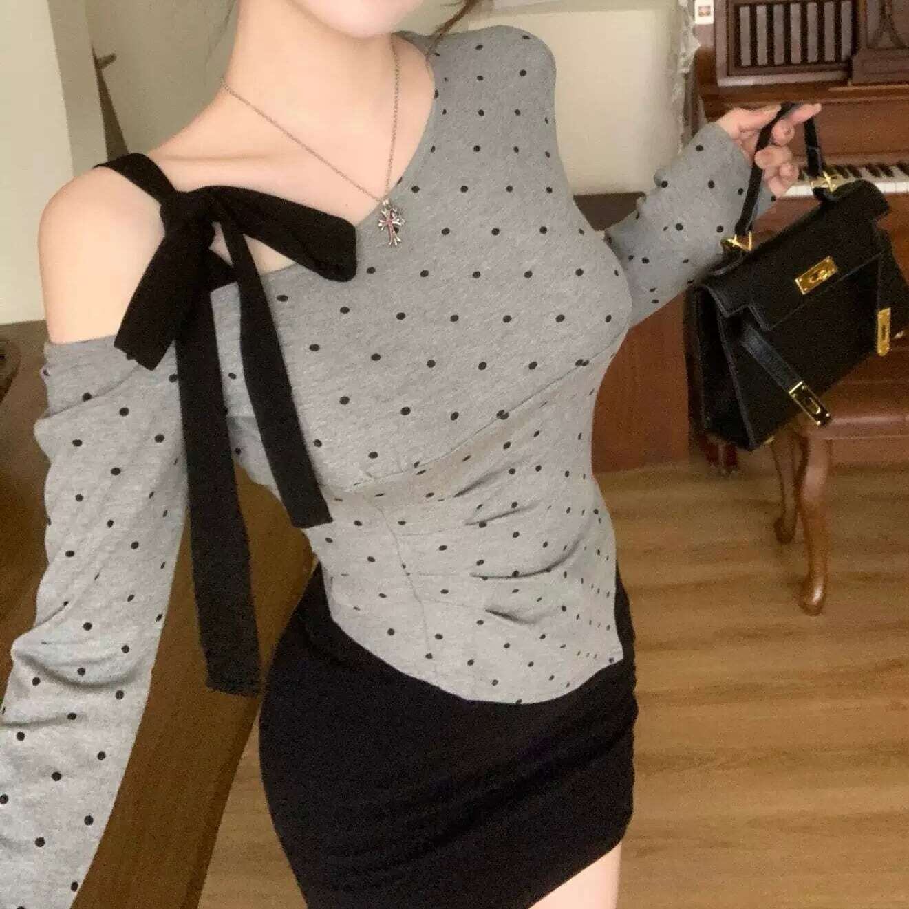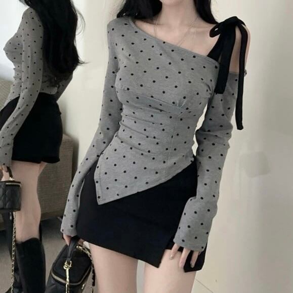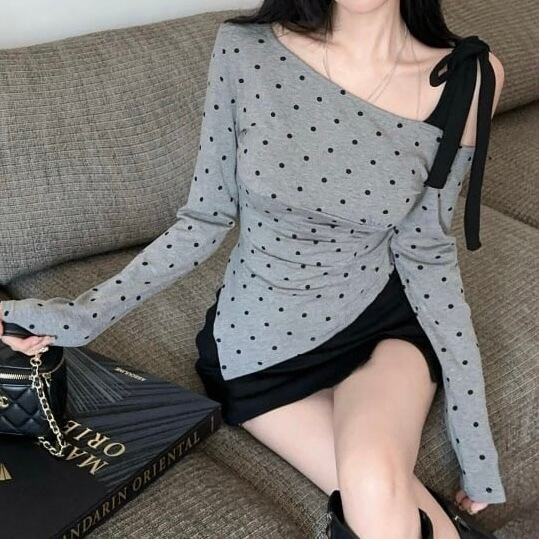 【tops】ドット柄肩リボンワンショルトップス FQ0028