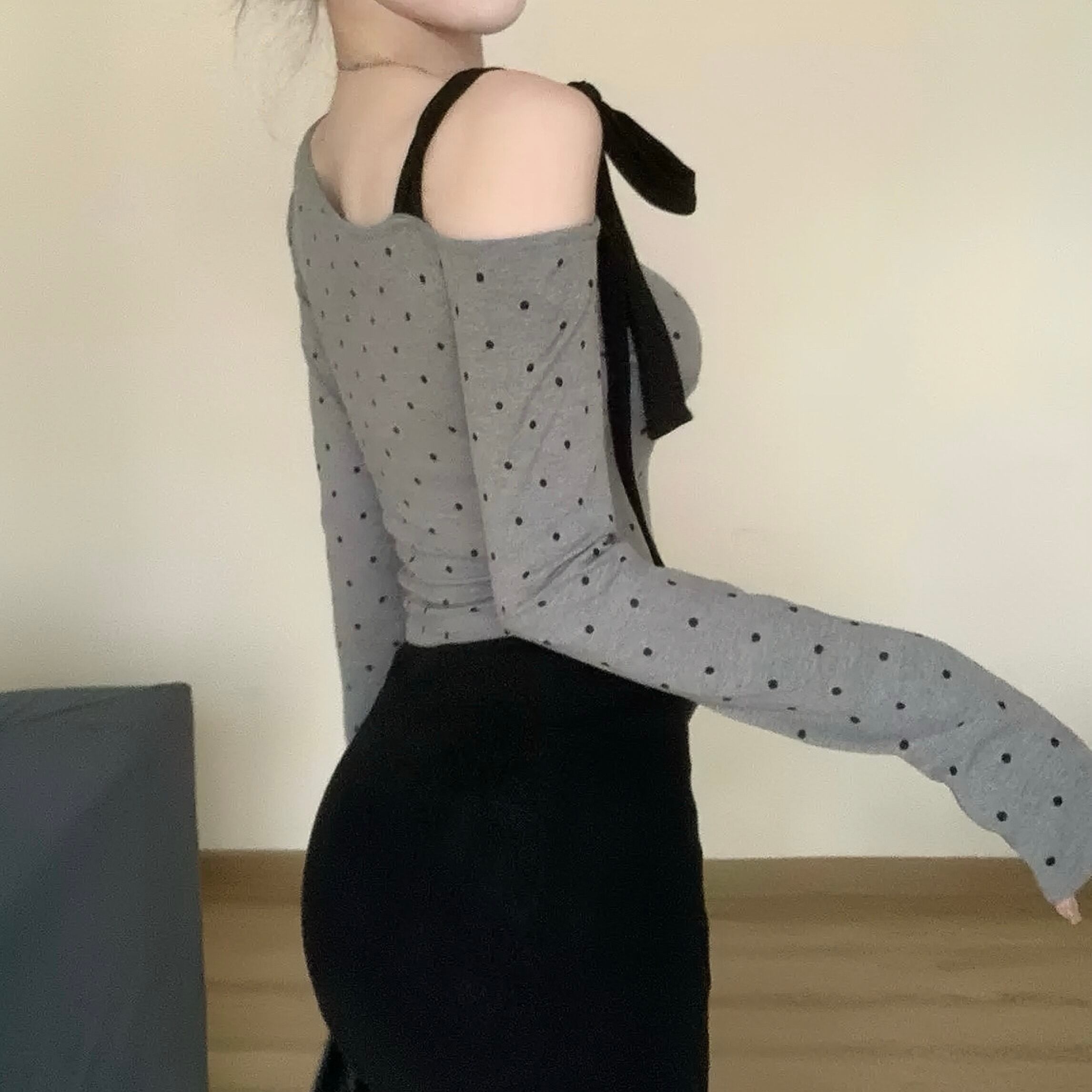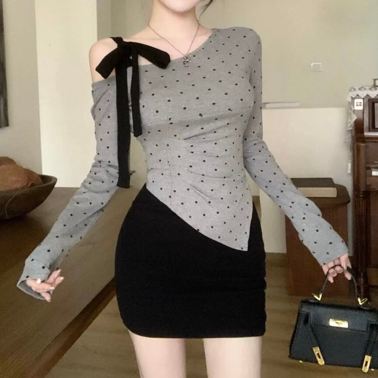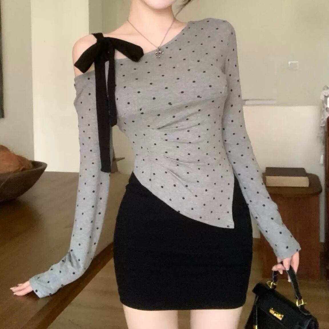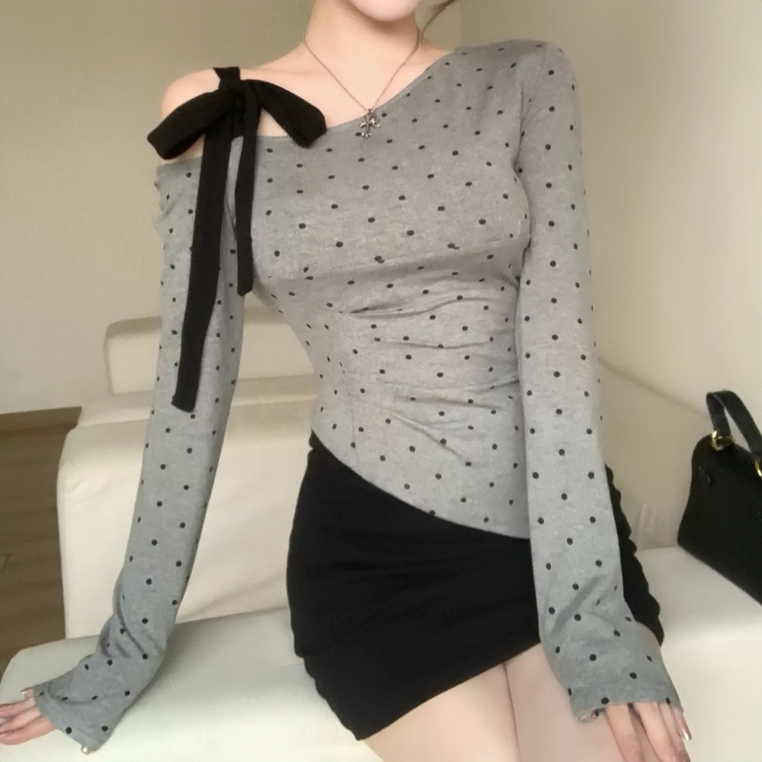 【tops】ドット柄肩リボンワンショルトップス FQ0028