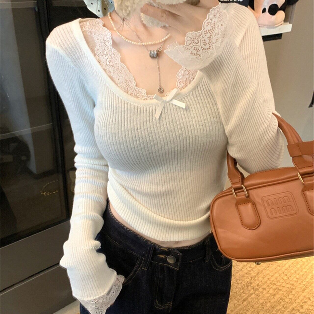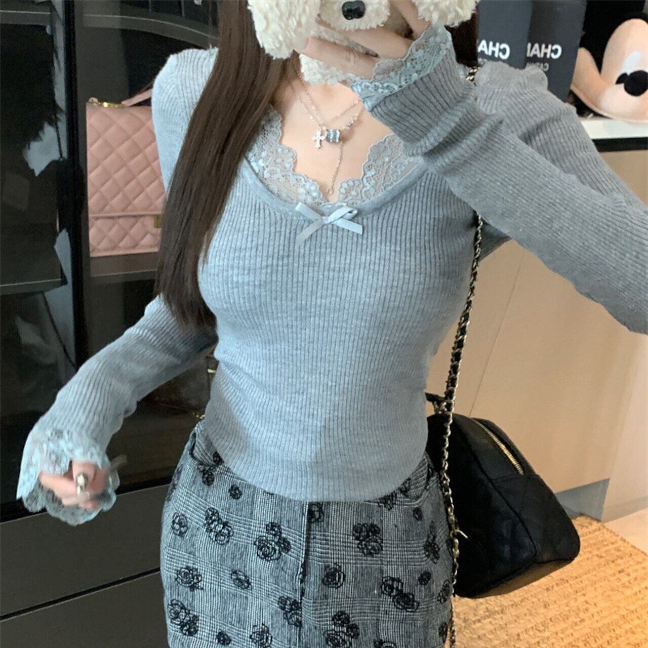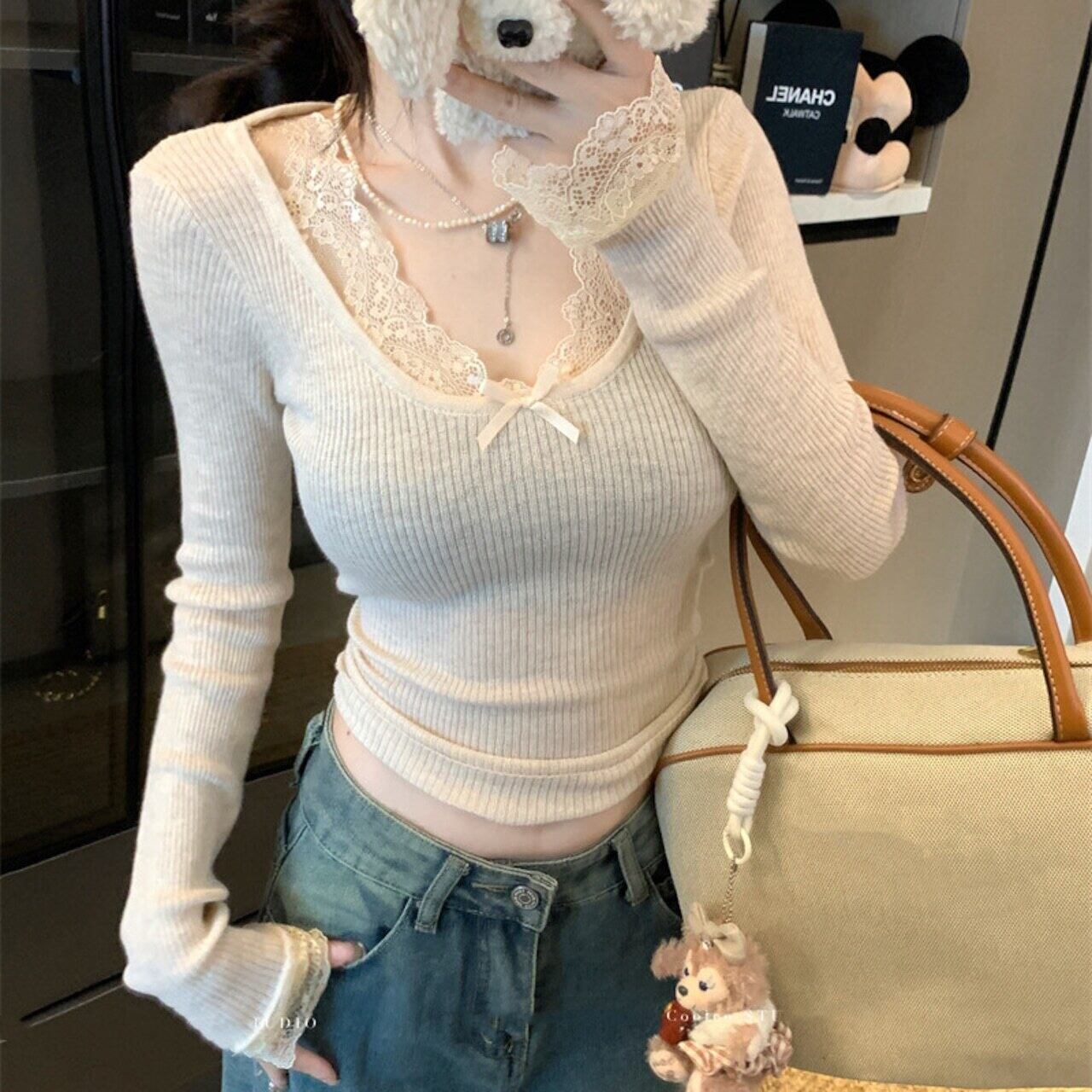 【tops】レースドッキング長袖ニットトップス4色 RC11230
